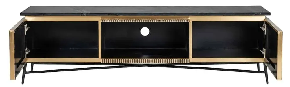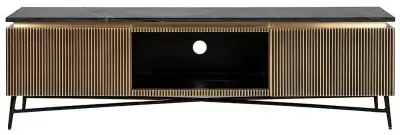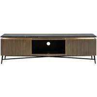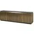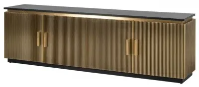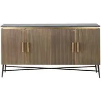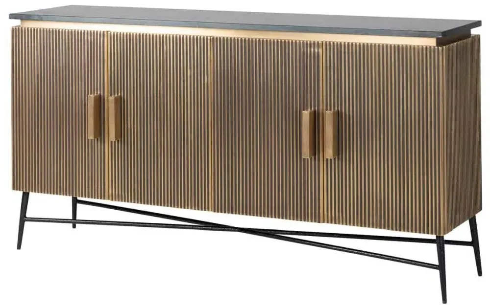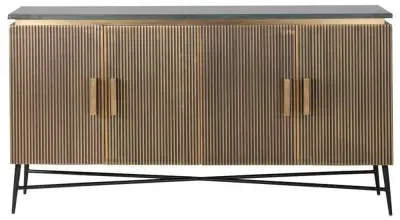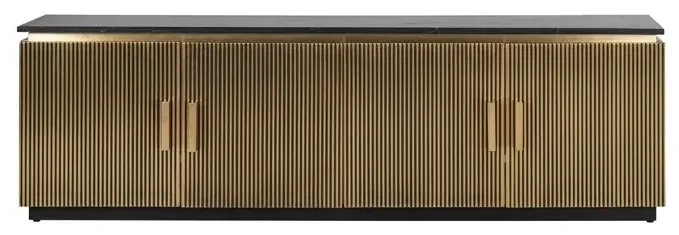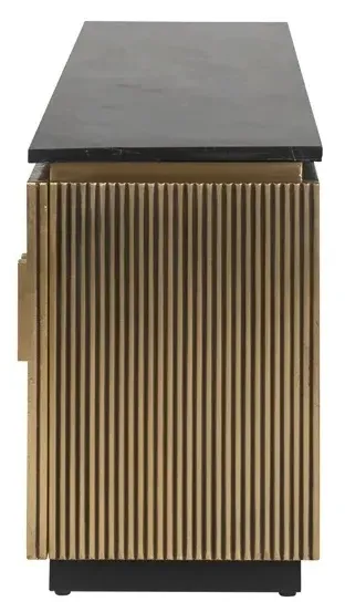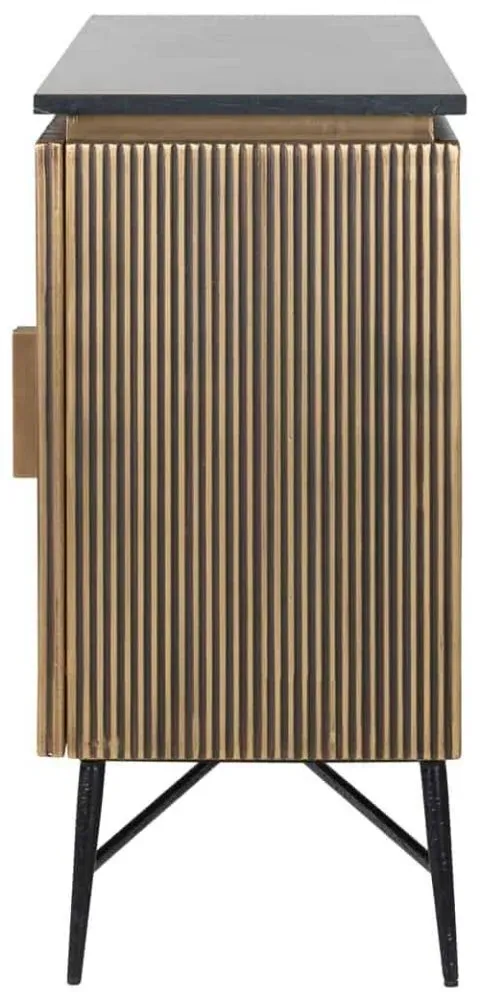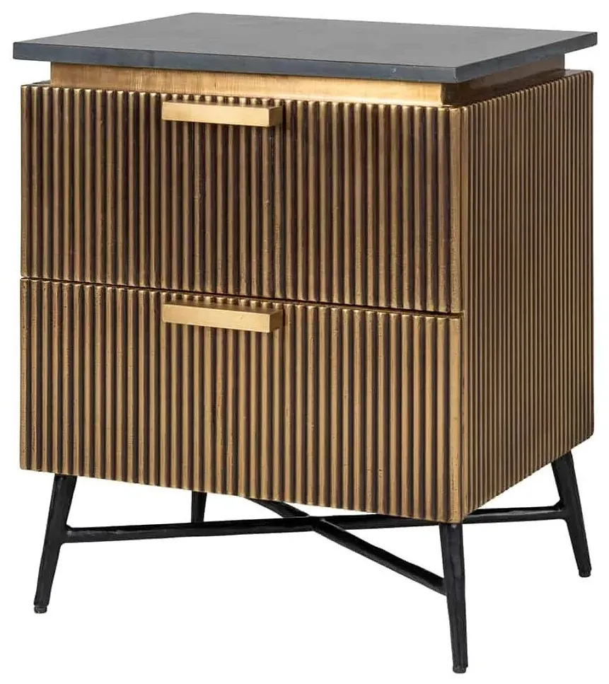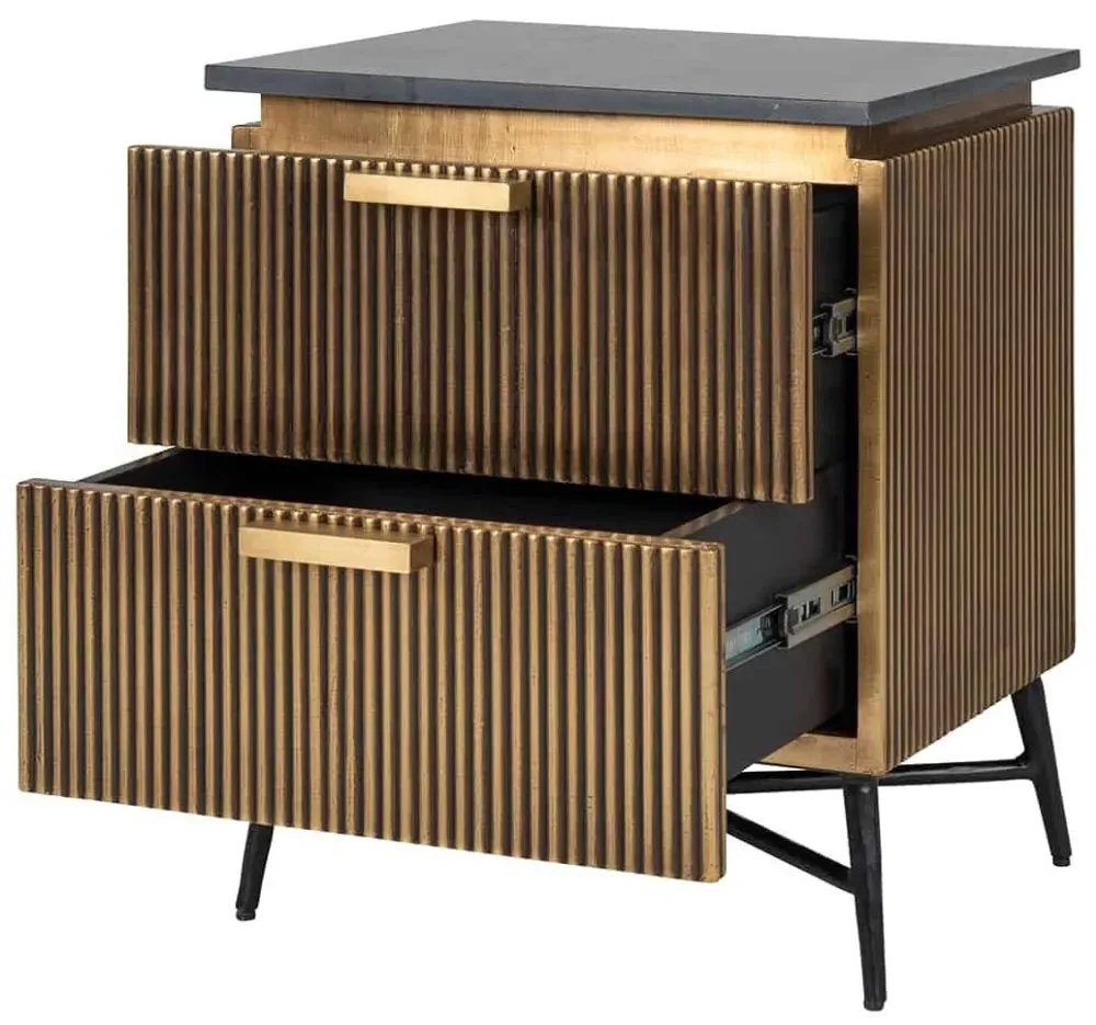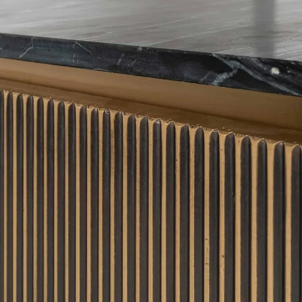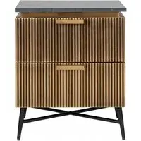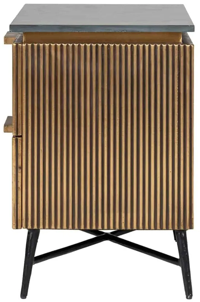 The Ironville side table combines functionality with distinctive ribbed brass detailing. Its single drawer provides convenient storage, while the round tabletop offers ample surface space. The brass construction adds durability and lustrous appeal, and the compact design suits various living spaces.