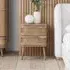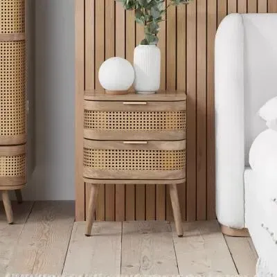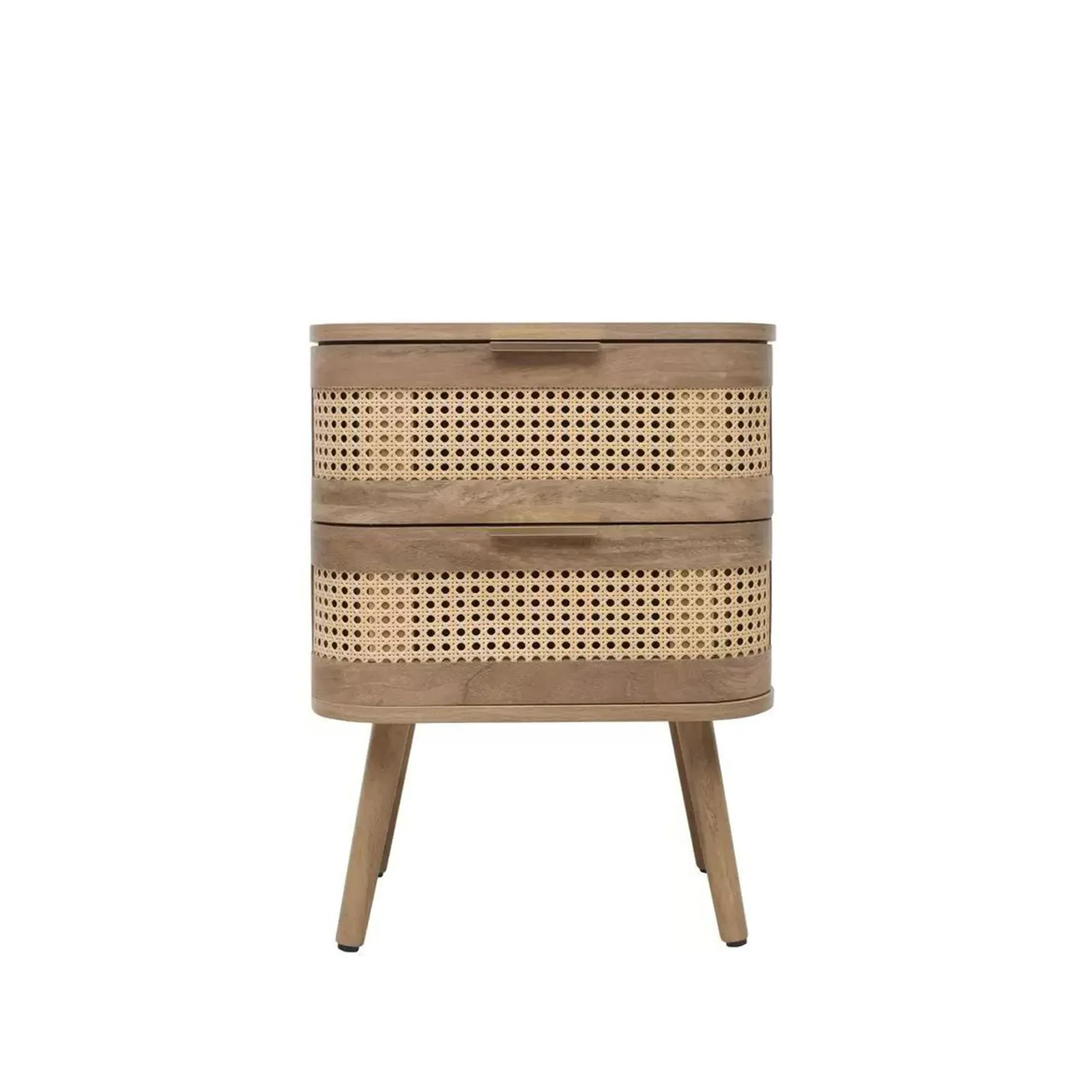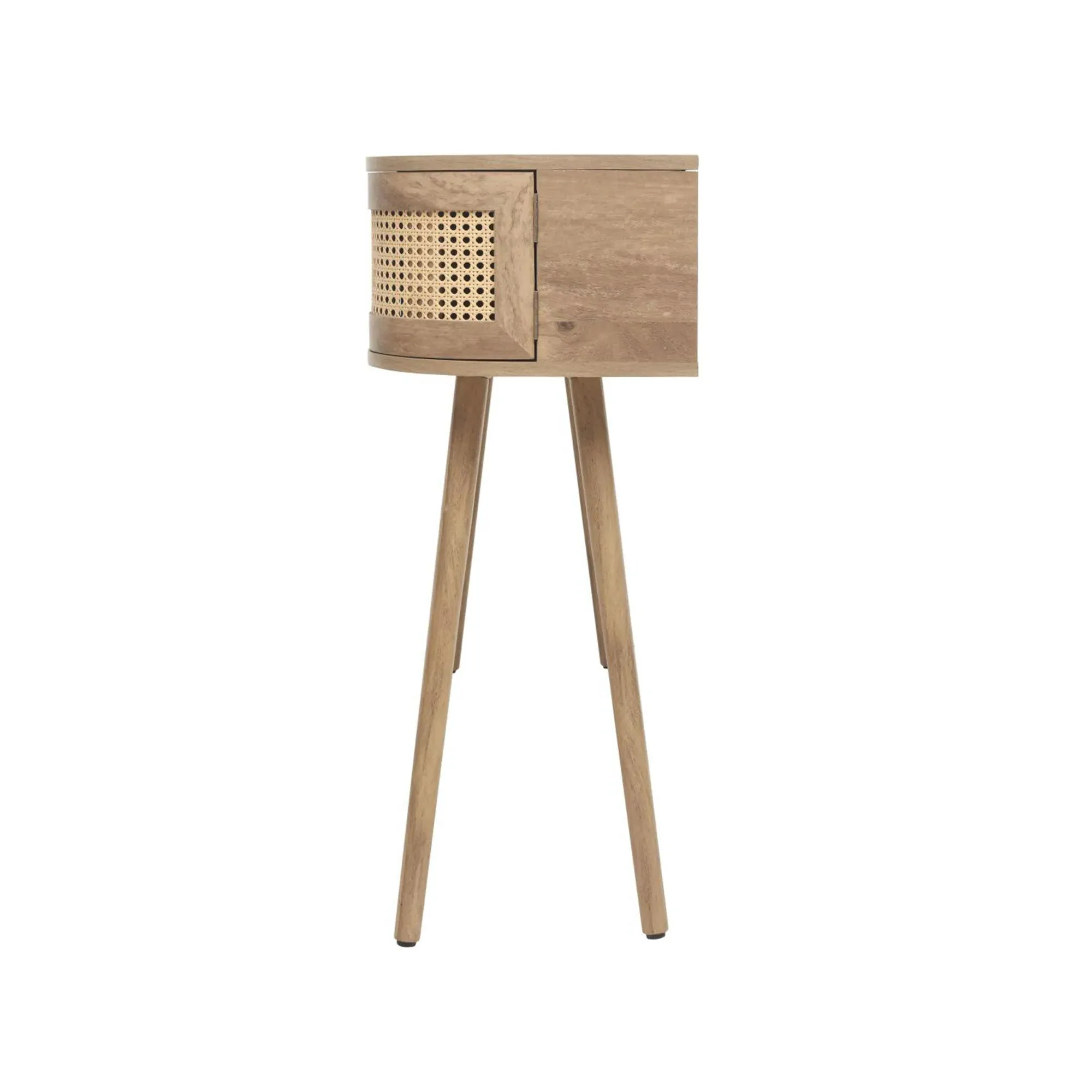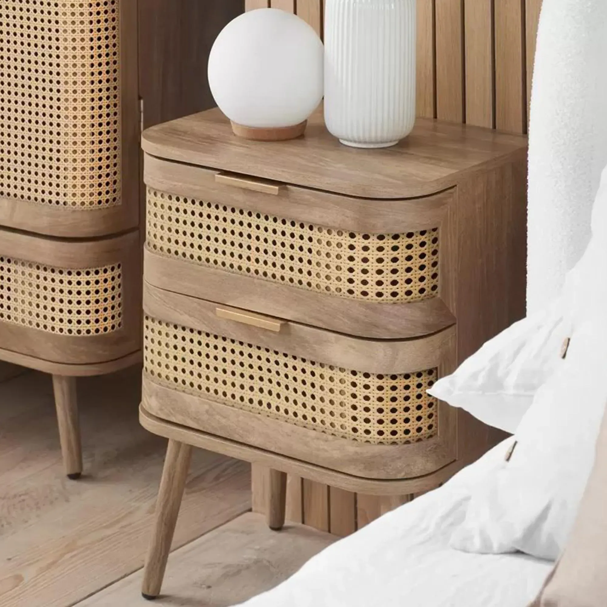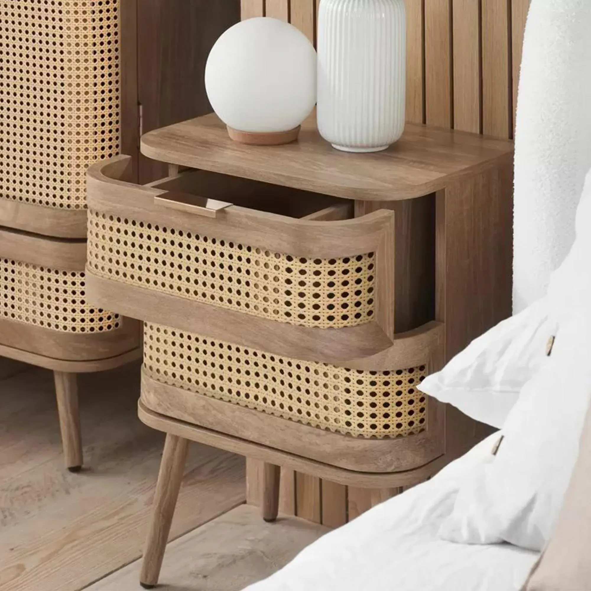 The Noah bedside table features curved styling with a single drawer for essential storage. Its oak and rattan construction offers natural texture and durability, while the compact design fits comfortably beside beds without overwhelming smaller bedroom spaces.