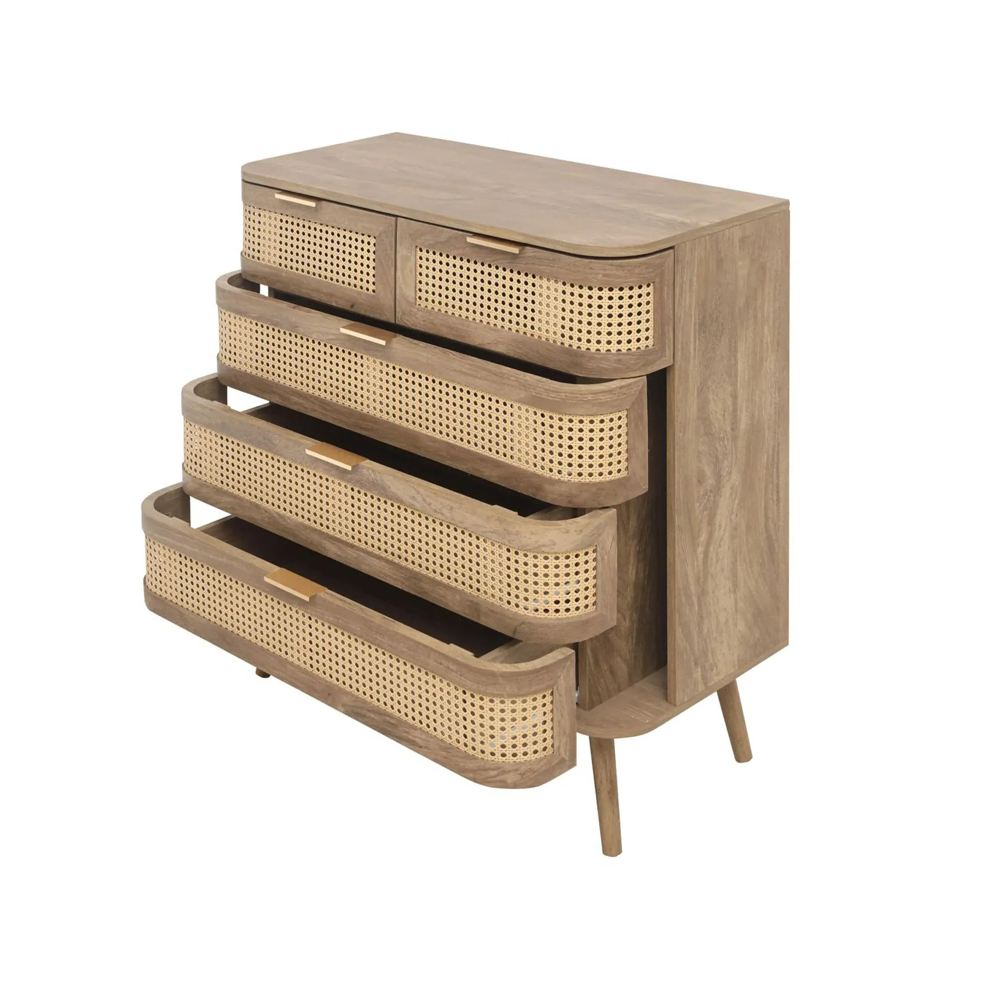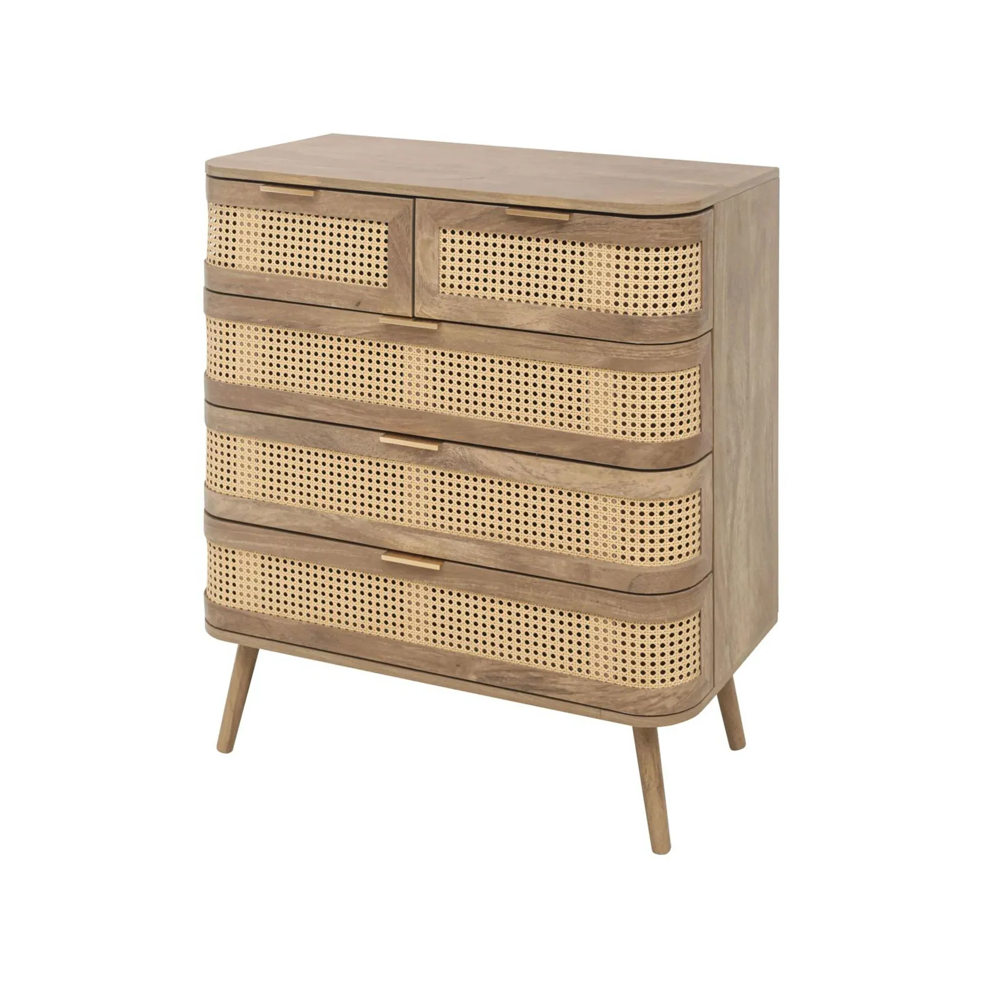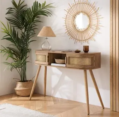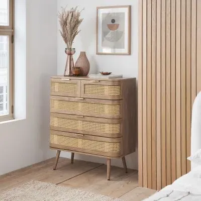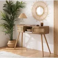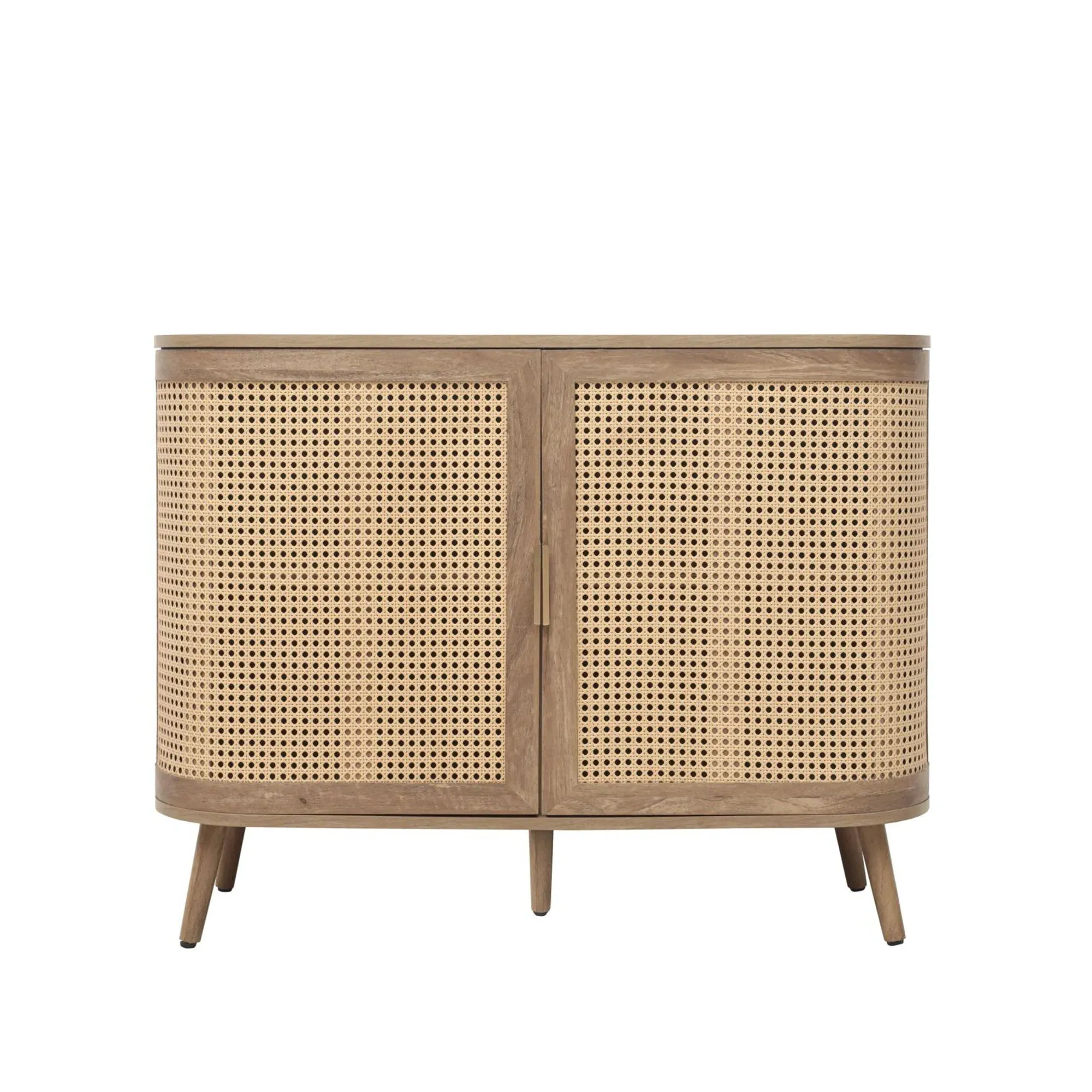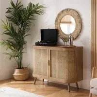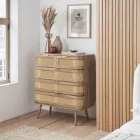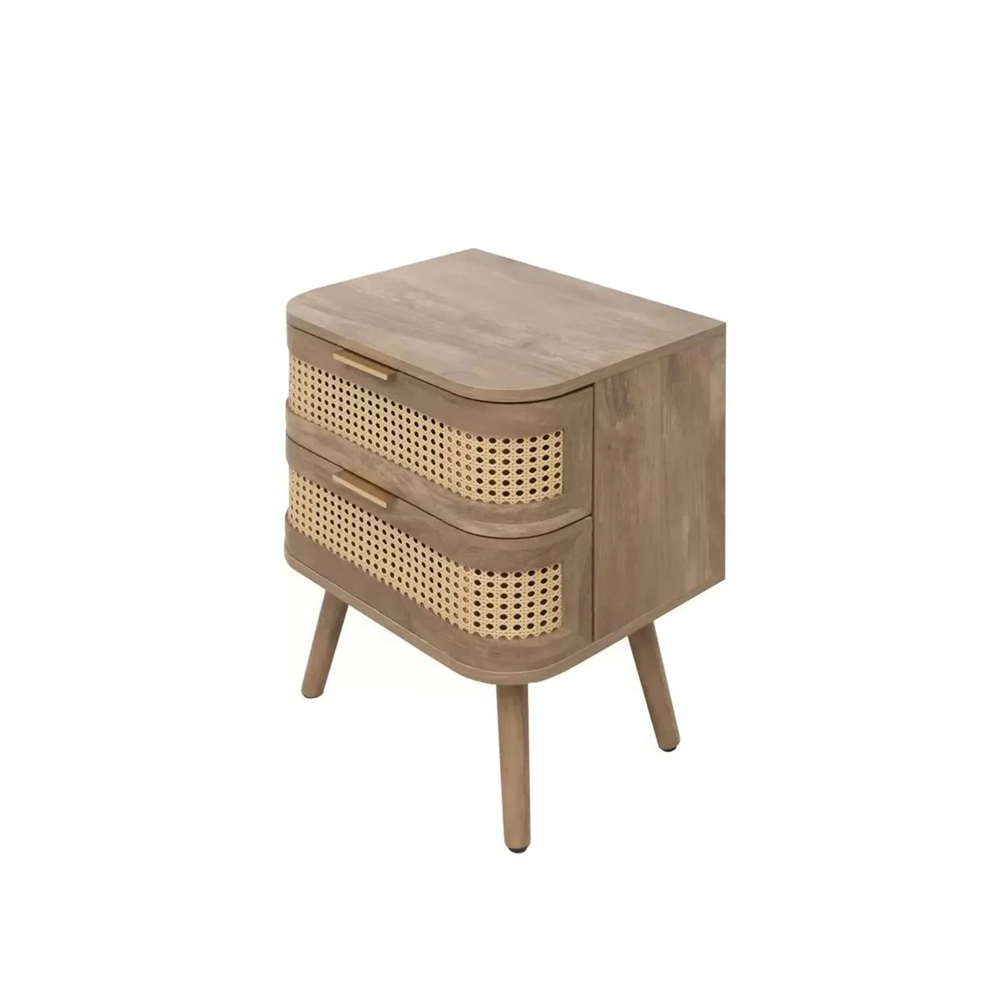 The Noah bedside table features curved styling with a single drawer for essential storage. Its oak and rattan construction offers natural texture and durability, while the compact design fits comfortably beside beds without overwhelming smaller bedroom spaces.