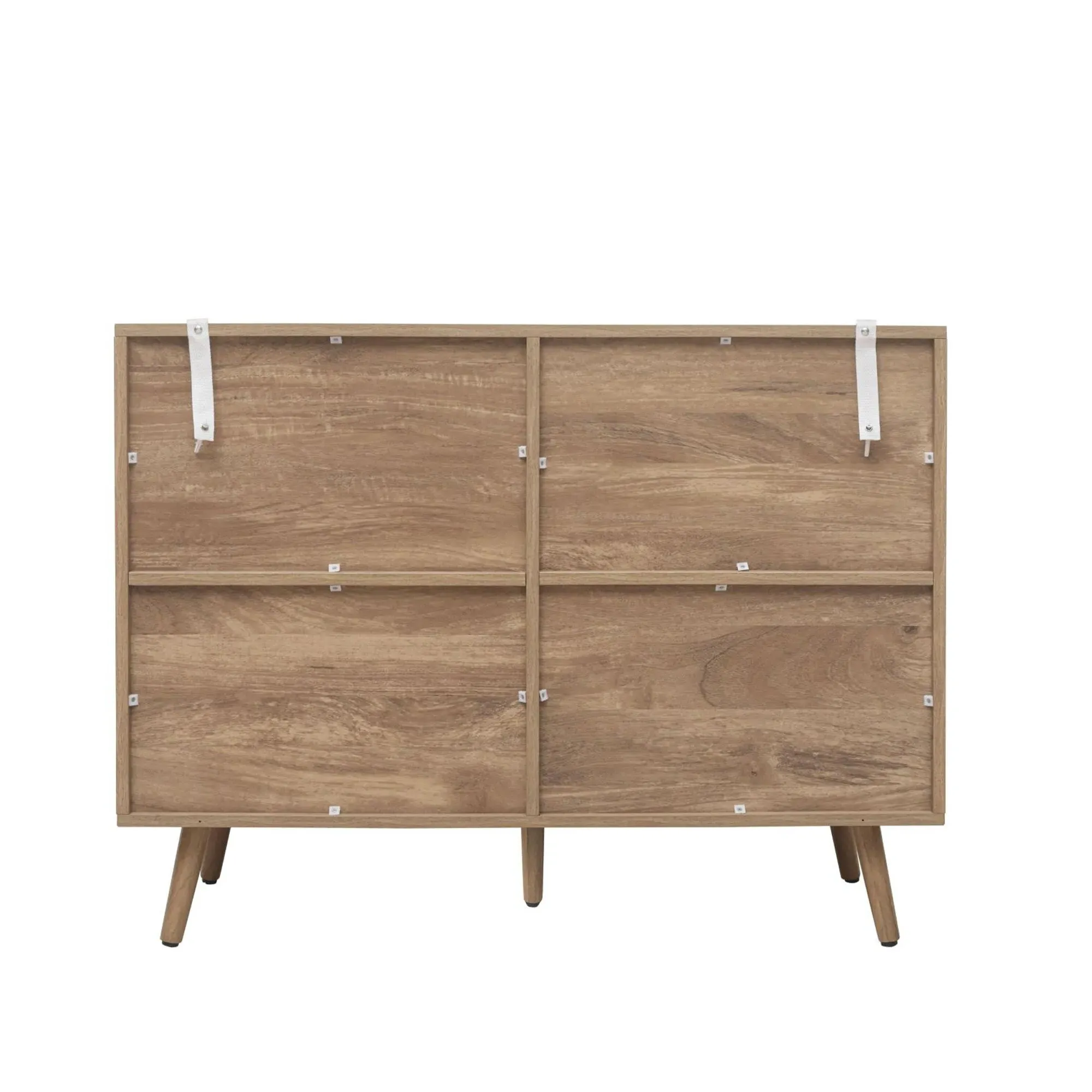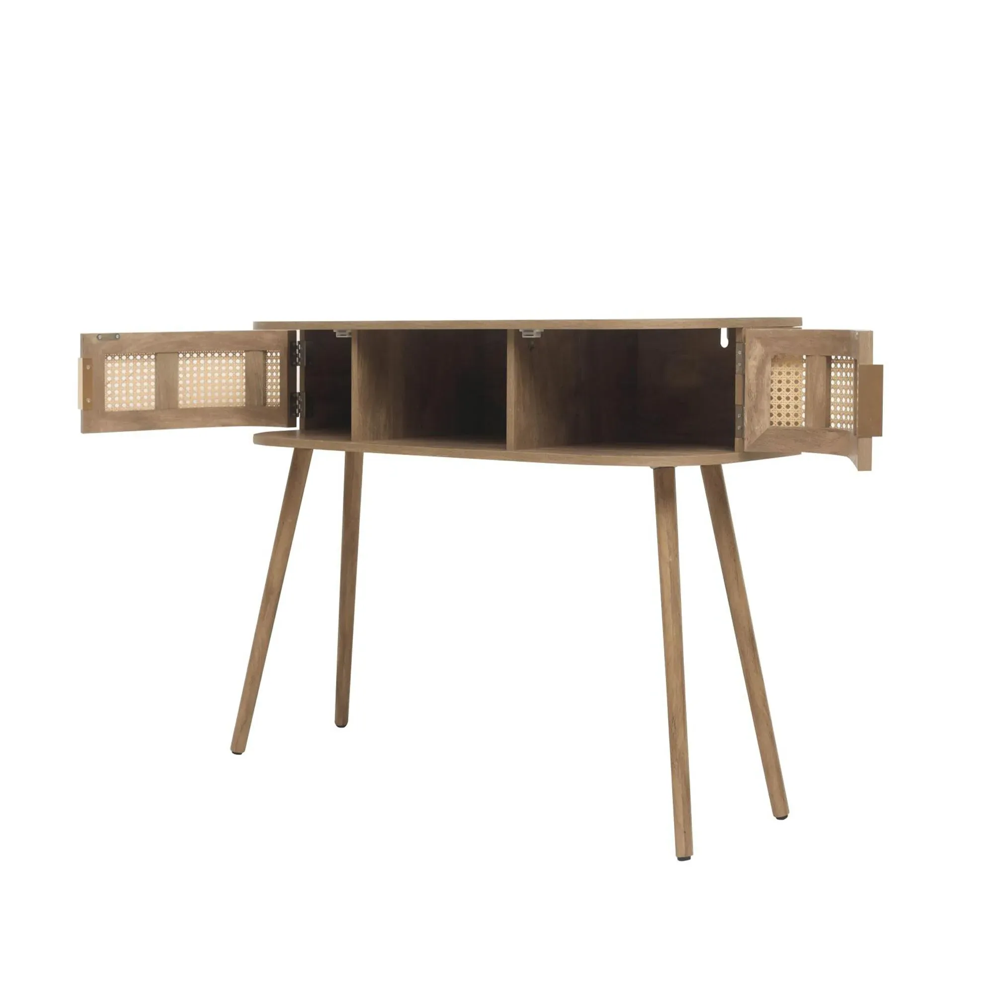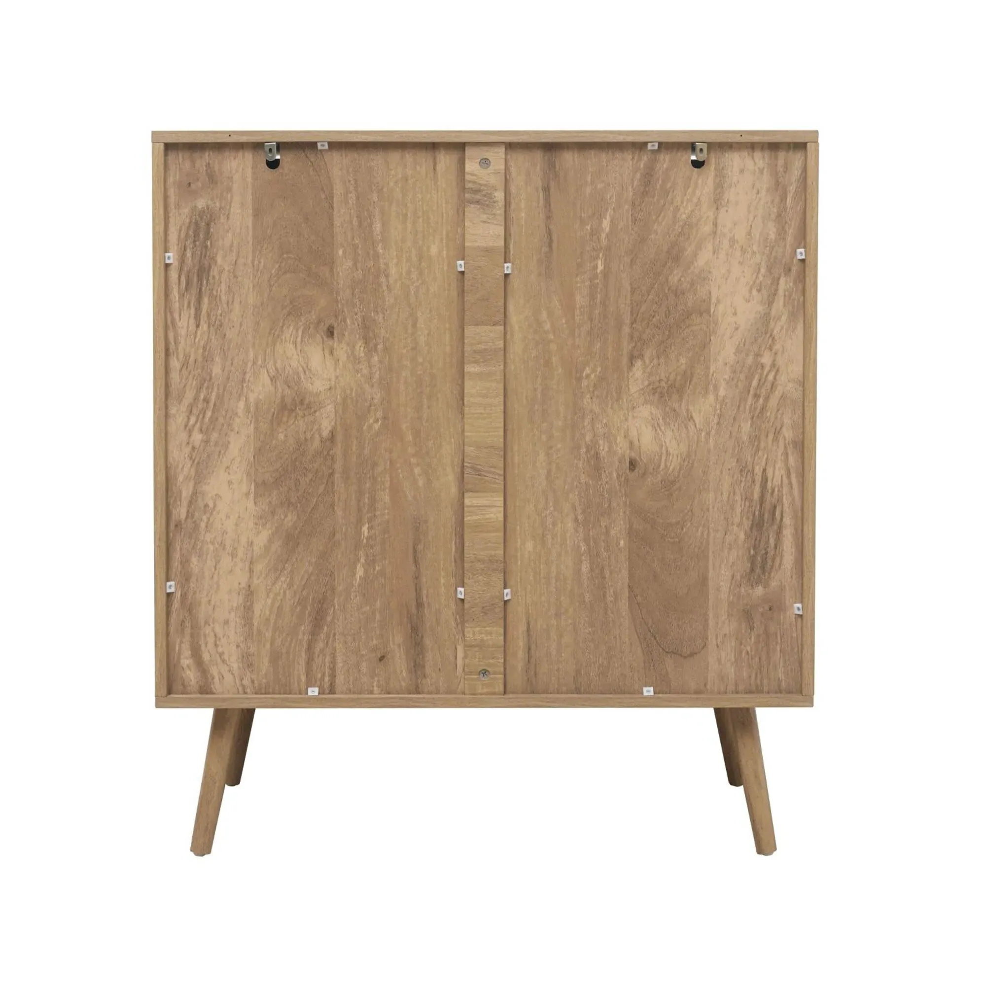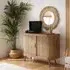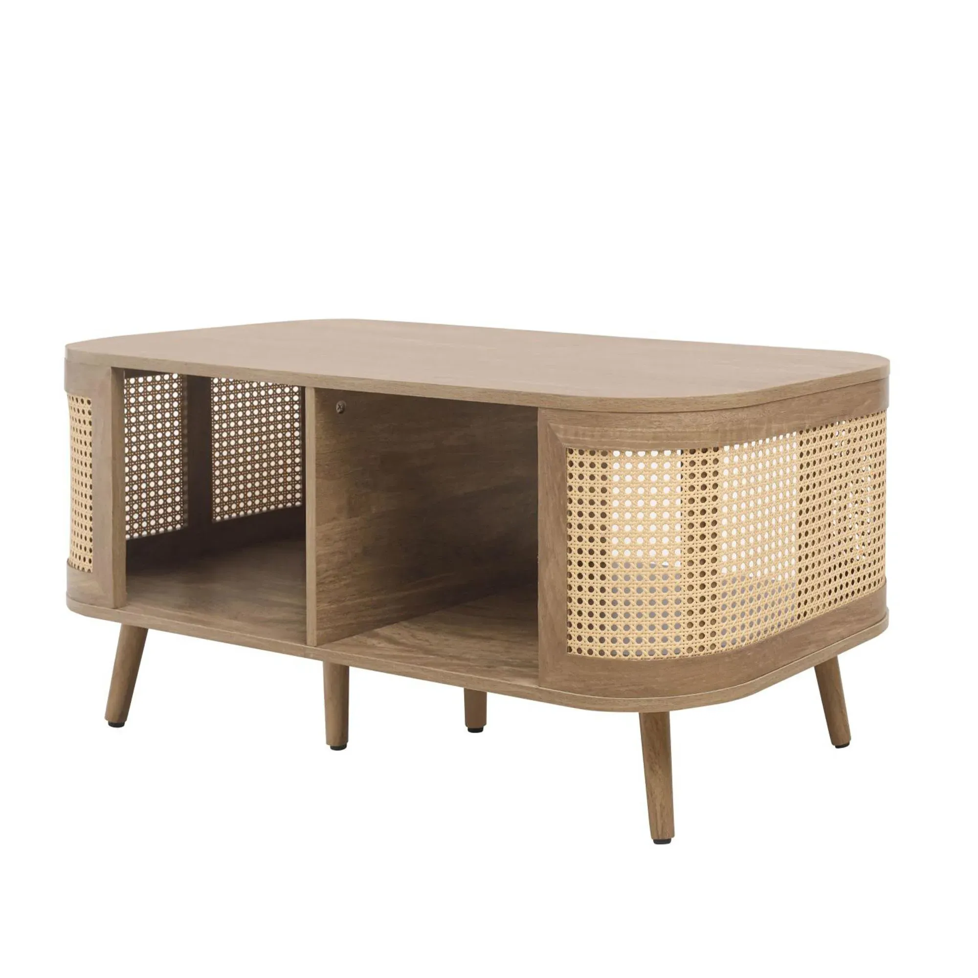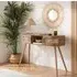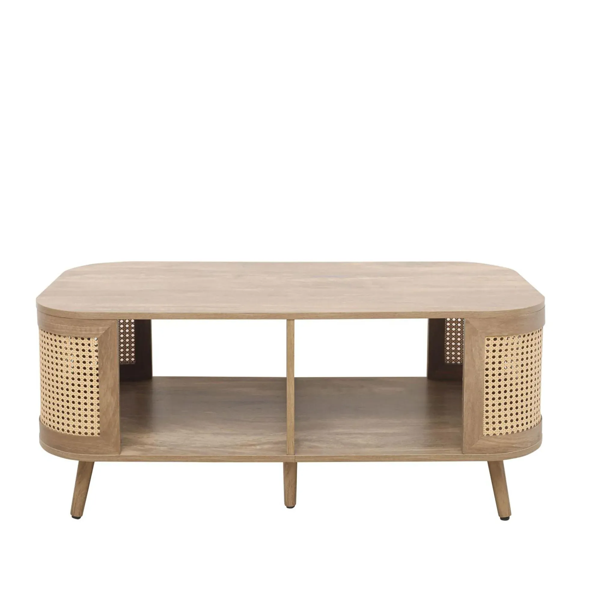 The Noah bedside table features curved styling with a single drawer for essential storage. Its oak and rattan construction offers natural texture and durability, while the compact design fits comfortably beside beds without overwhelming smaller bedroom spaces.
