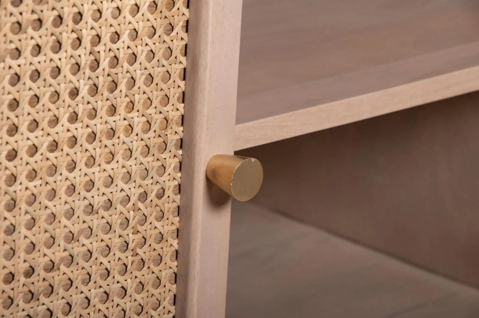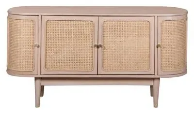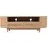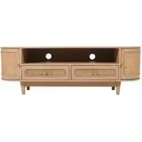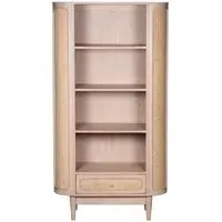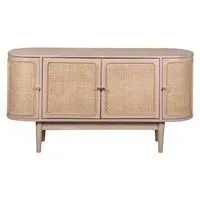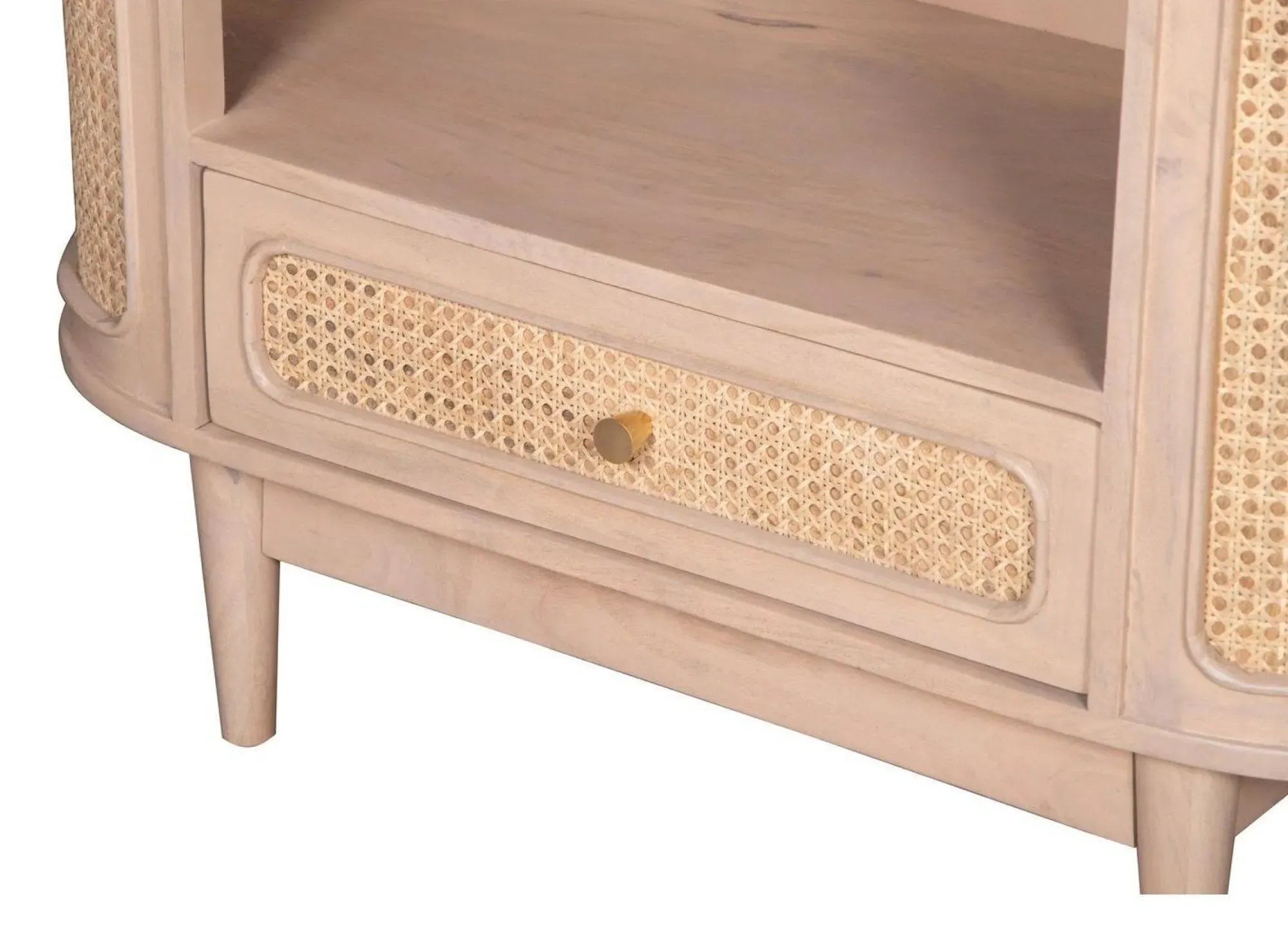 The Vance bedside table combines curved rattan detailing with mango wood construction for bedside storage. Its compact design fits alongside most bed frames, while the natural materials add warmth to bedroom decor. The lacquered finish provides durability, and the curved rattan panels create visual texture and interest.