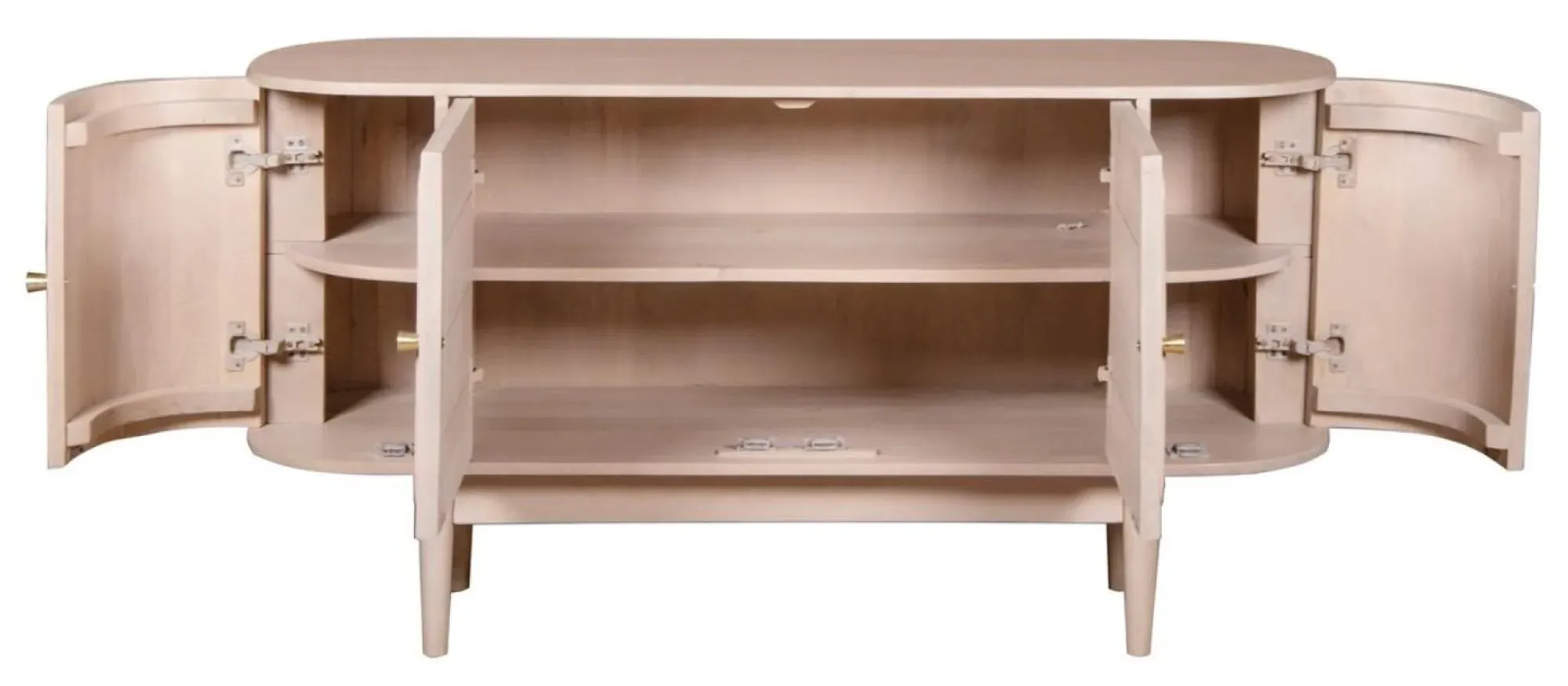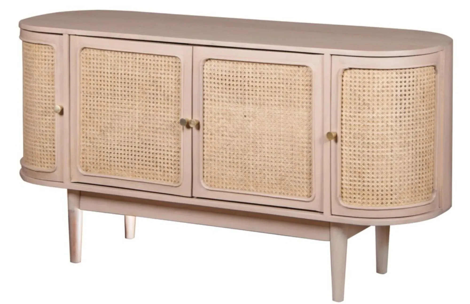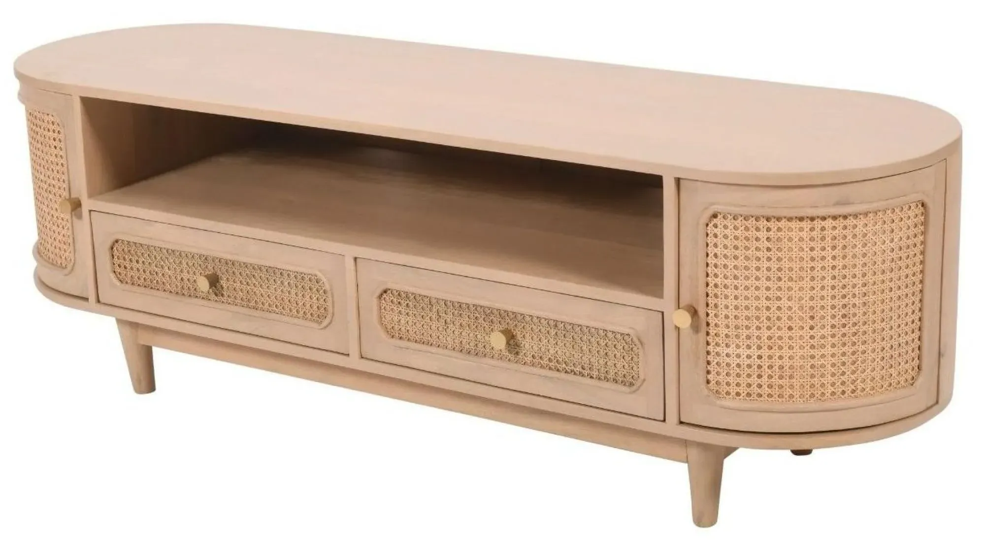 The Vance bedside table combines curved rattan detailing with mango wood construction for bedside storage. Its compact design fits alongside most bed frames, while the natural materials add warmth to bedroom decor. The lacquered finish provides durability, and the curved rattan panels create visual texture and interest.