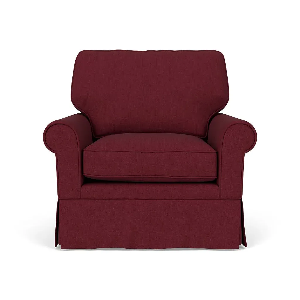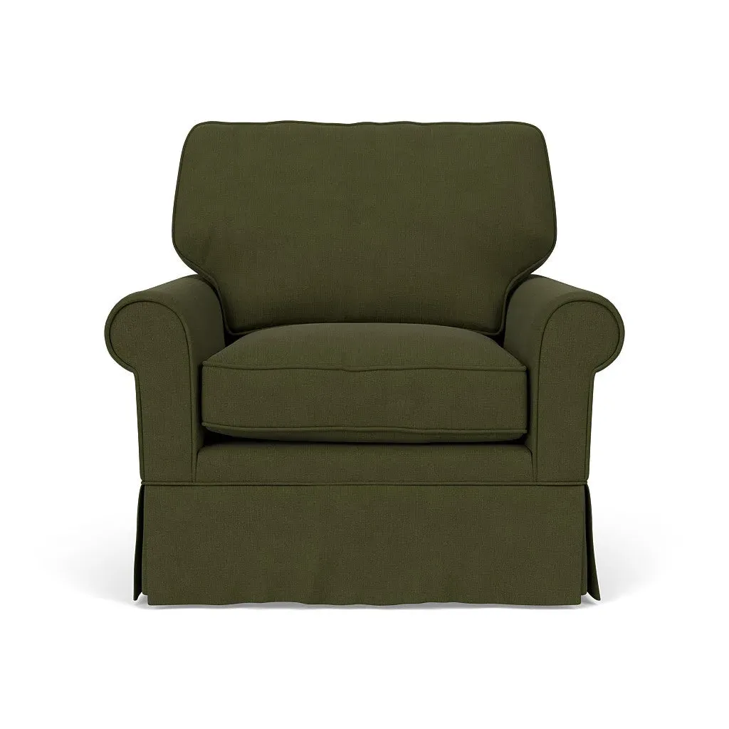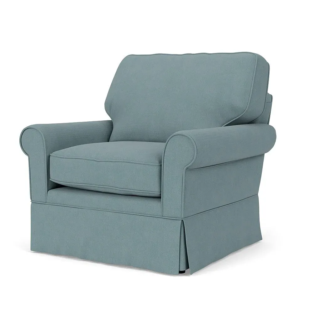 The armchair offers comfortable seating with its high back and arms that provide additional support. Its tailored skirt covers the base while small plastic glides protect your floors. The linen mix upholstery adds softness and durability to the design.