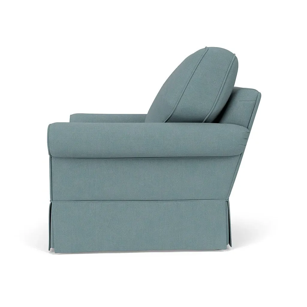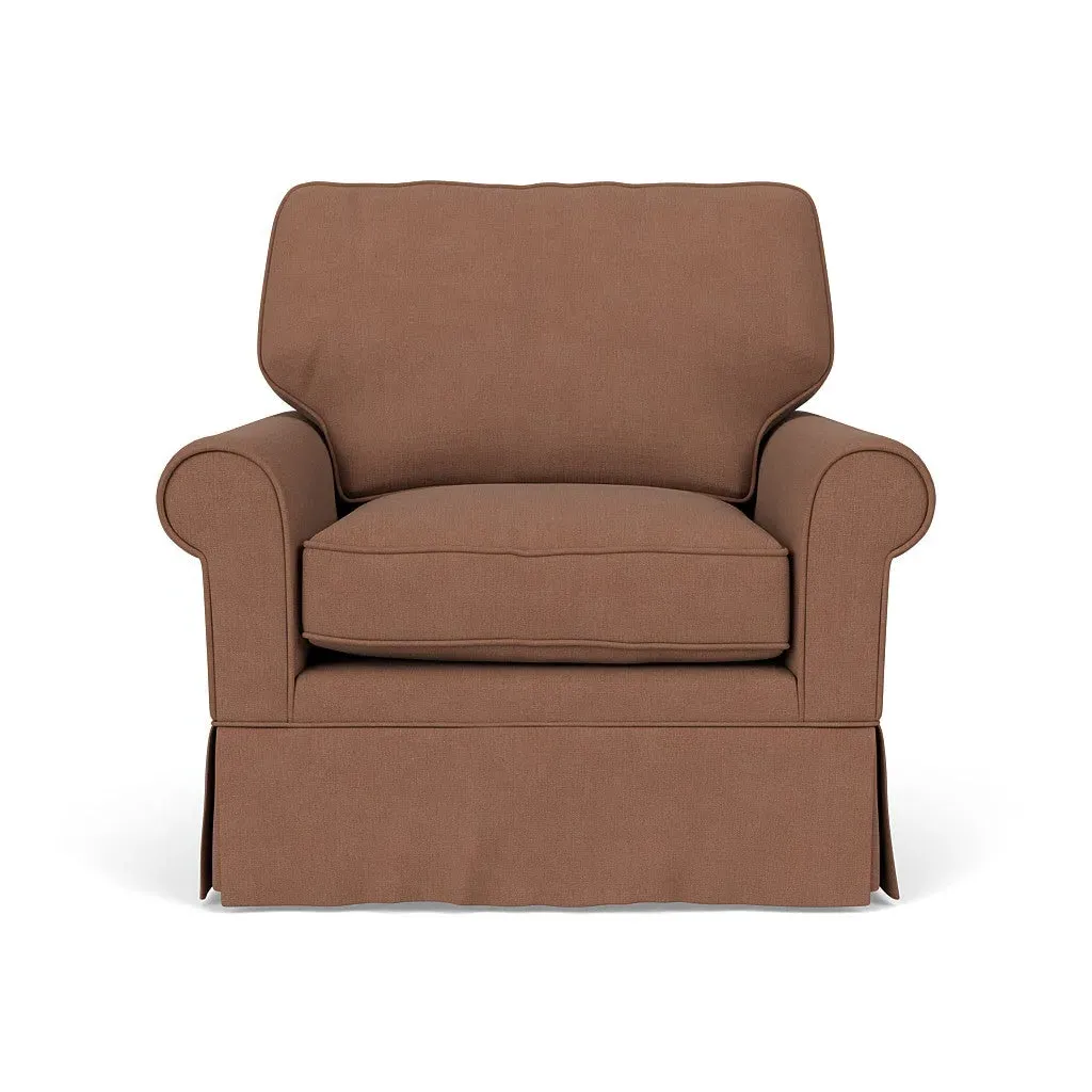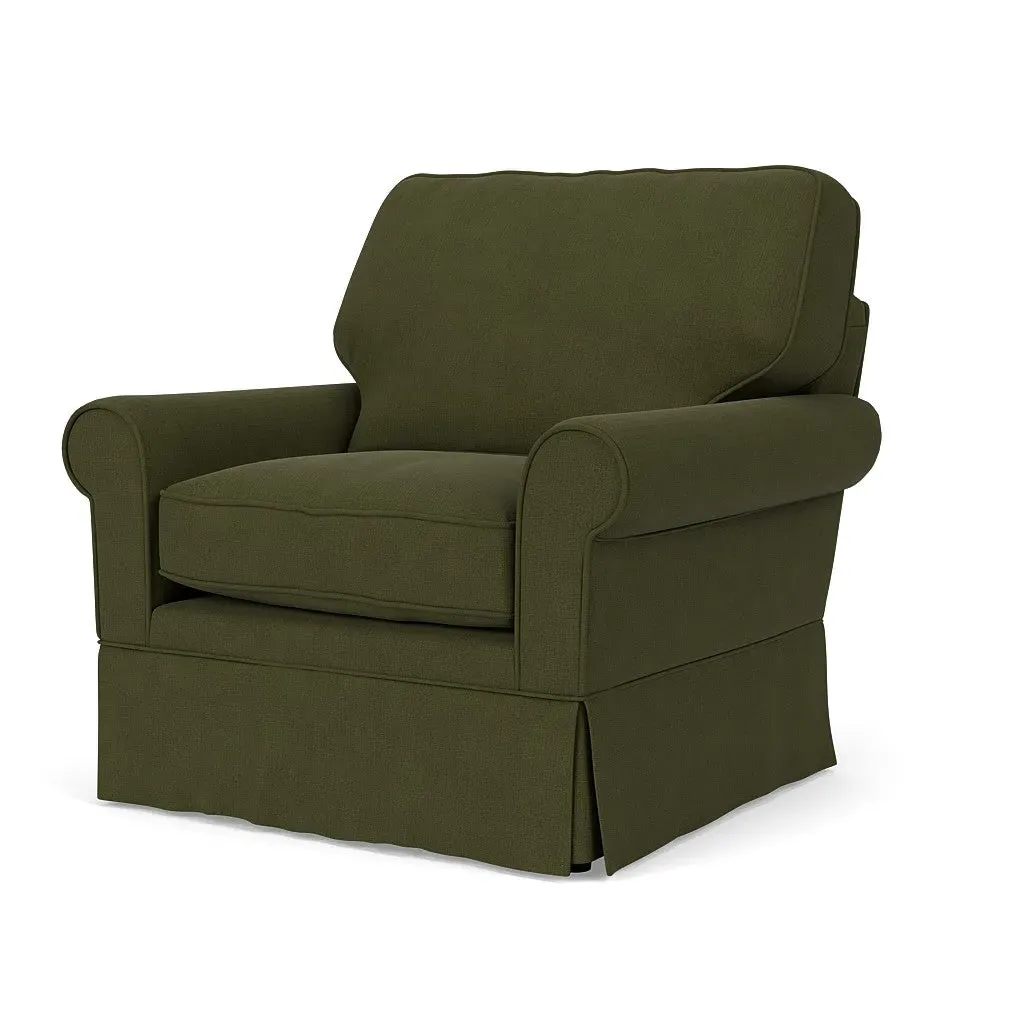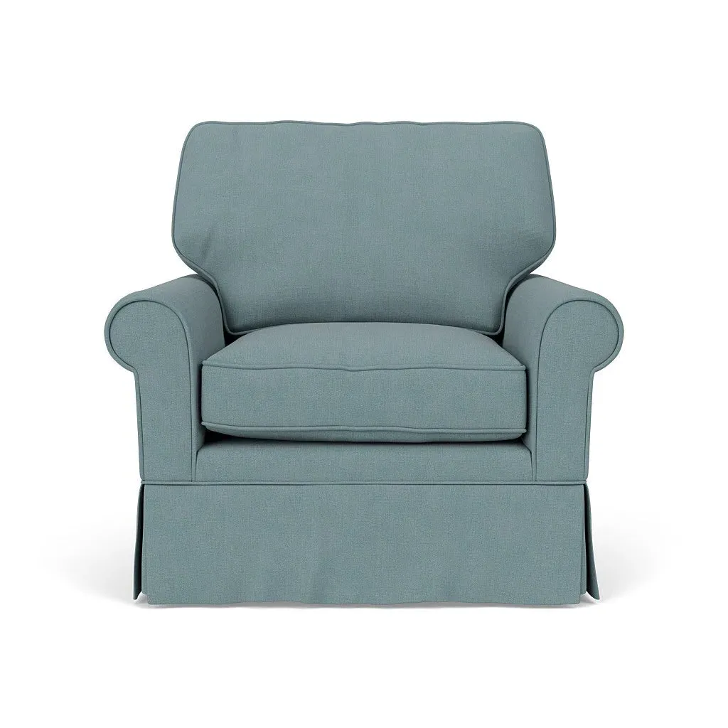 The armchair offers comfortable seating with its high back and arms that provide additional support. Its tailored skirt covers the base while small plastic glides protect your floors. The linen mix upholstery adds softness and durability to the design.
