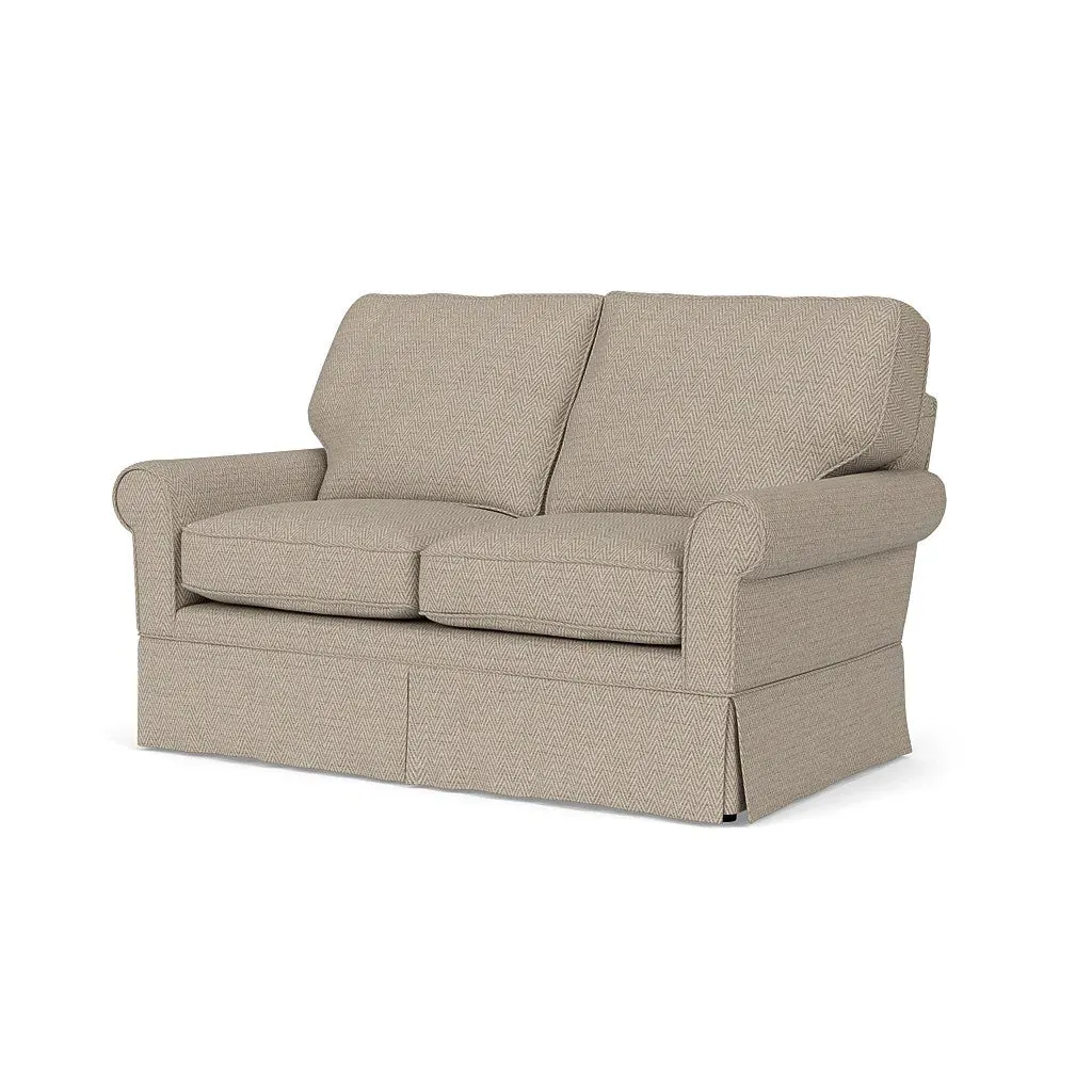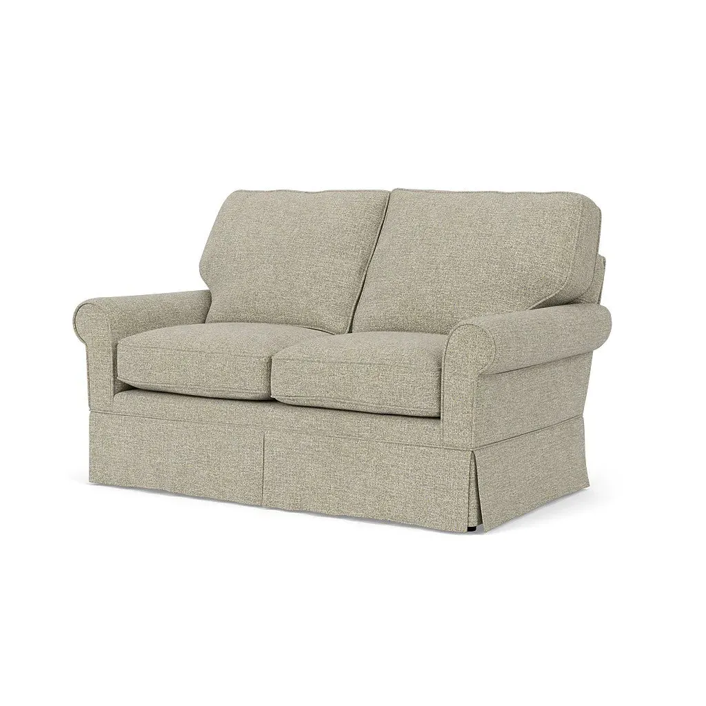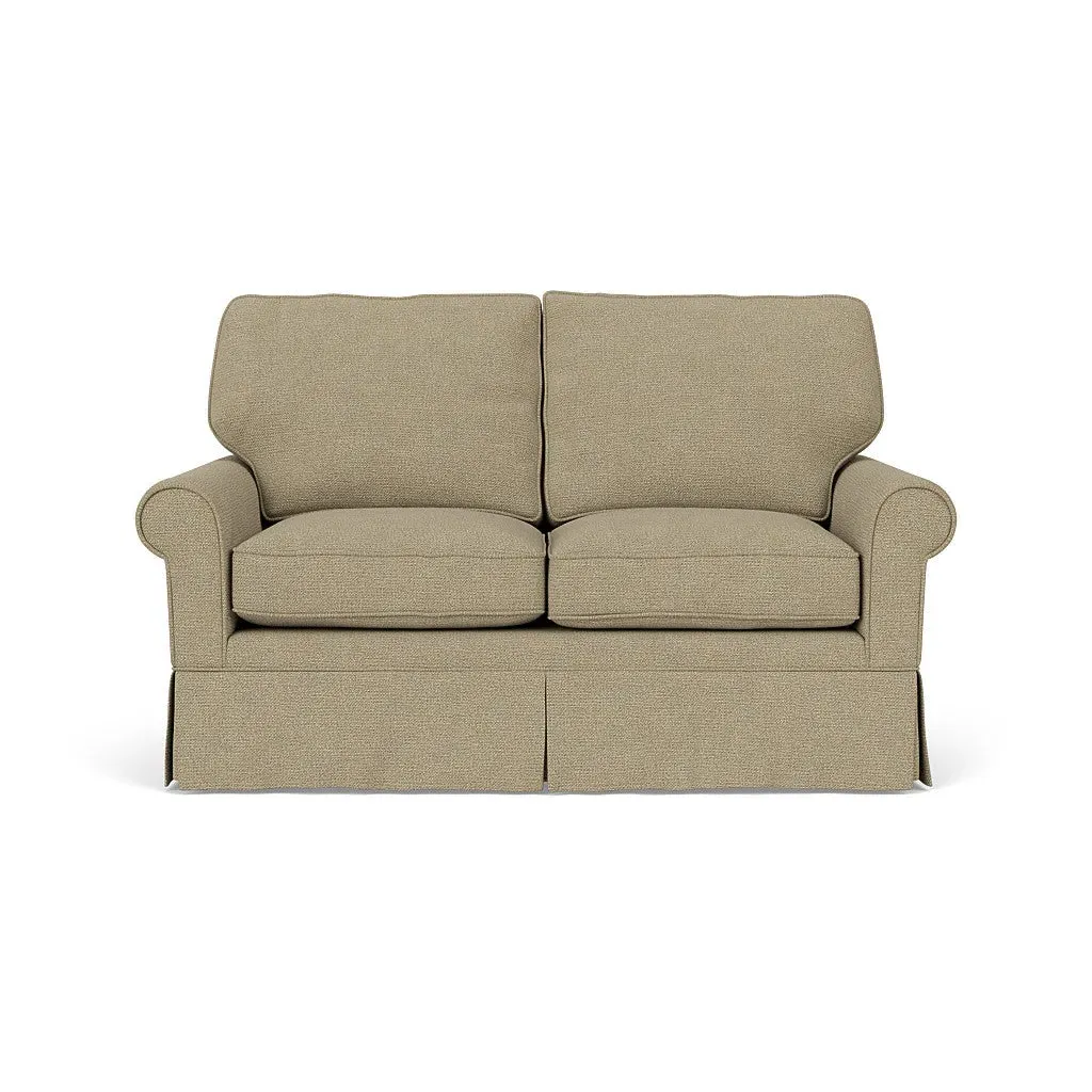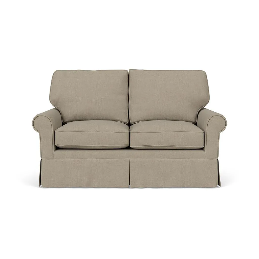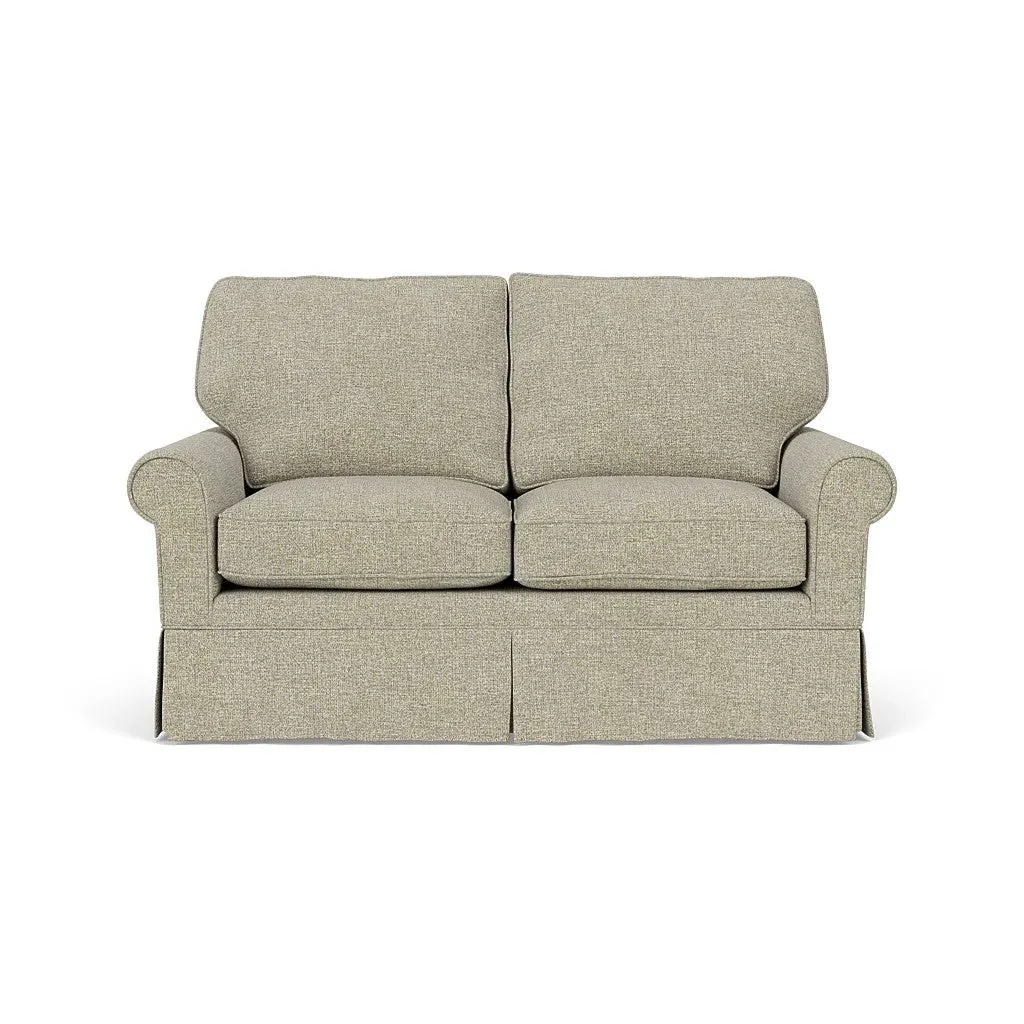 The Dawson sofa combines comfort with its high back and arms that provide enhanced support. Its tailored skirt covers the base while small plastic glides protect your floors. The house weave fabric offers durability, and the structured design ensures lasting appeal in your living space.