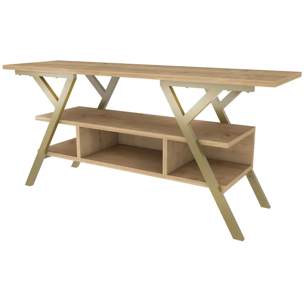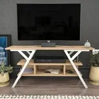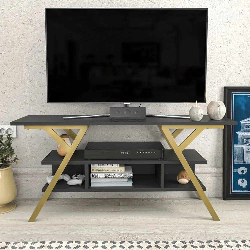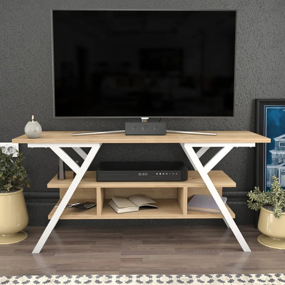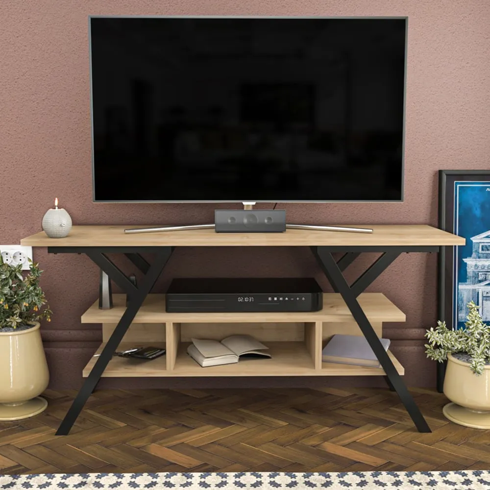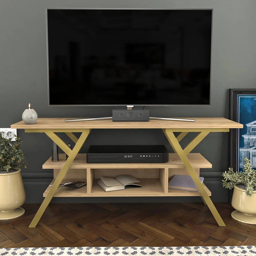 The Minerva TV unit offers practical storage with its four open shelves, accommodating TVs up to 55 inches. Its melamine-coated particle board construction features PVC edge banding for durability, while the metal legs provide sturdy support with scratch-resistant coating. The open shelving design suits media devices, books, and decorative items, and the eco-friendly materials ensure safe use. W120 x D30 x H45 cm.