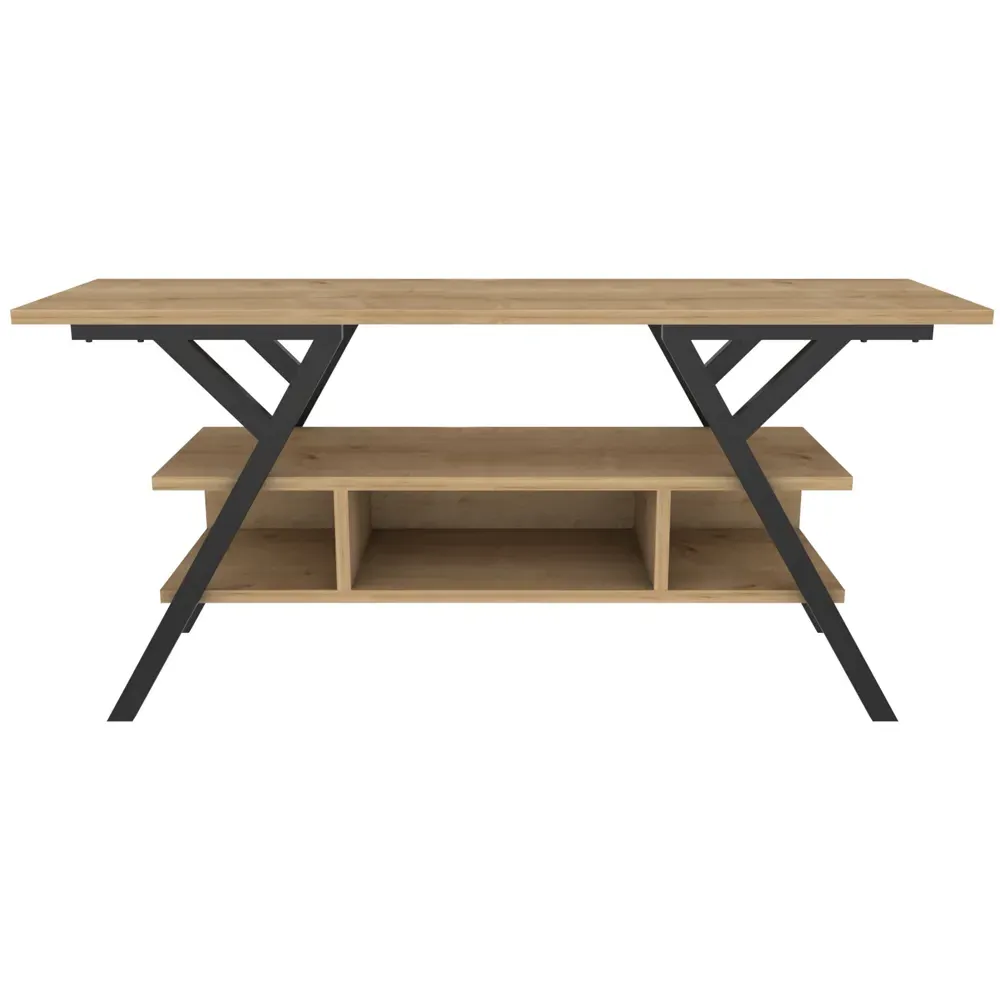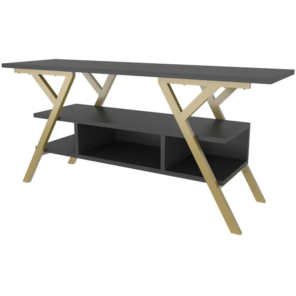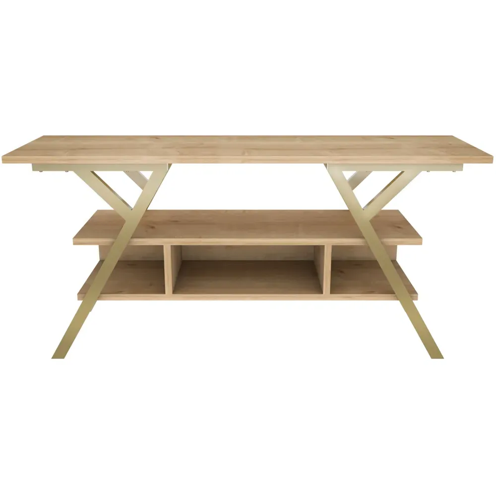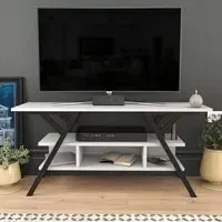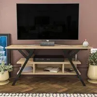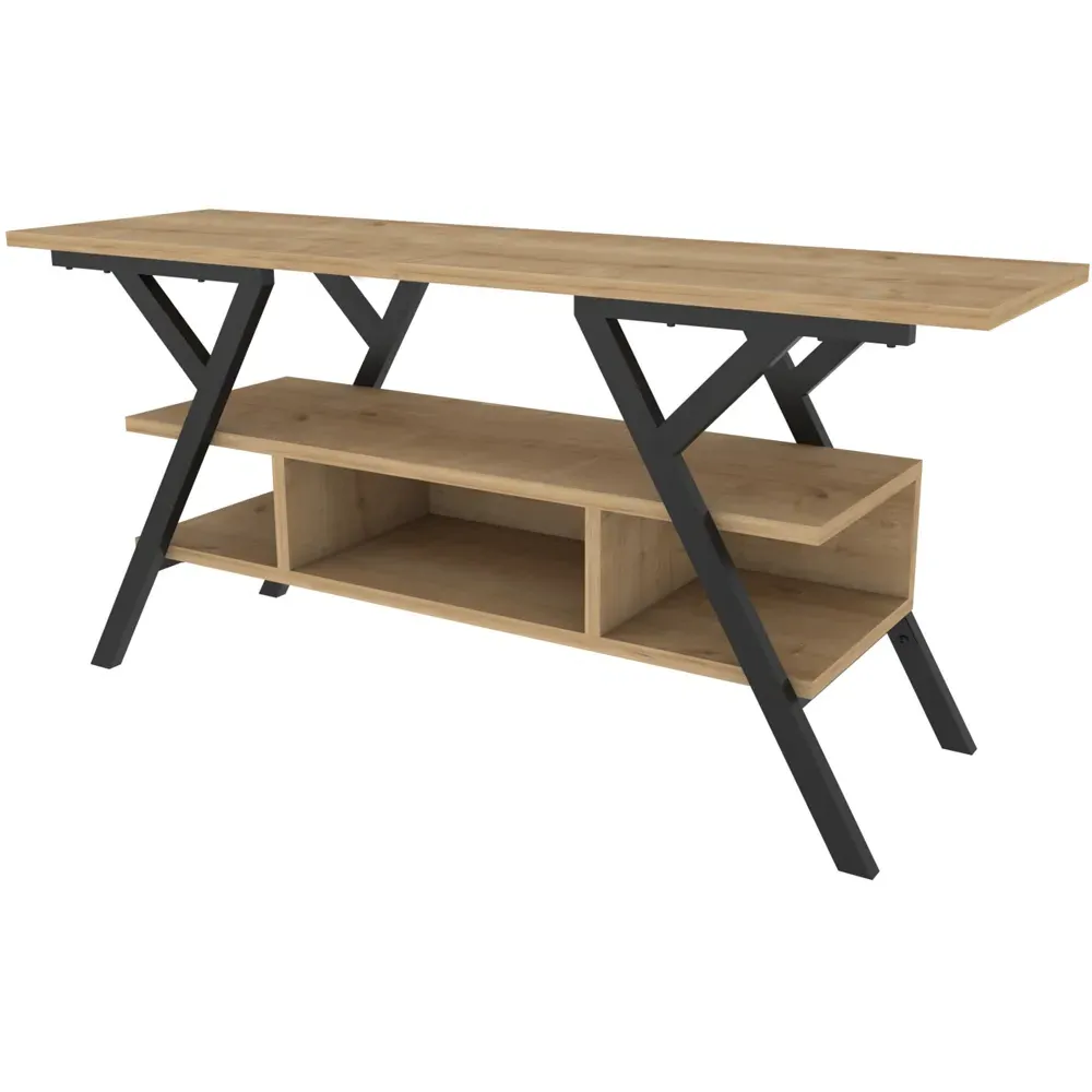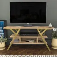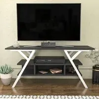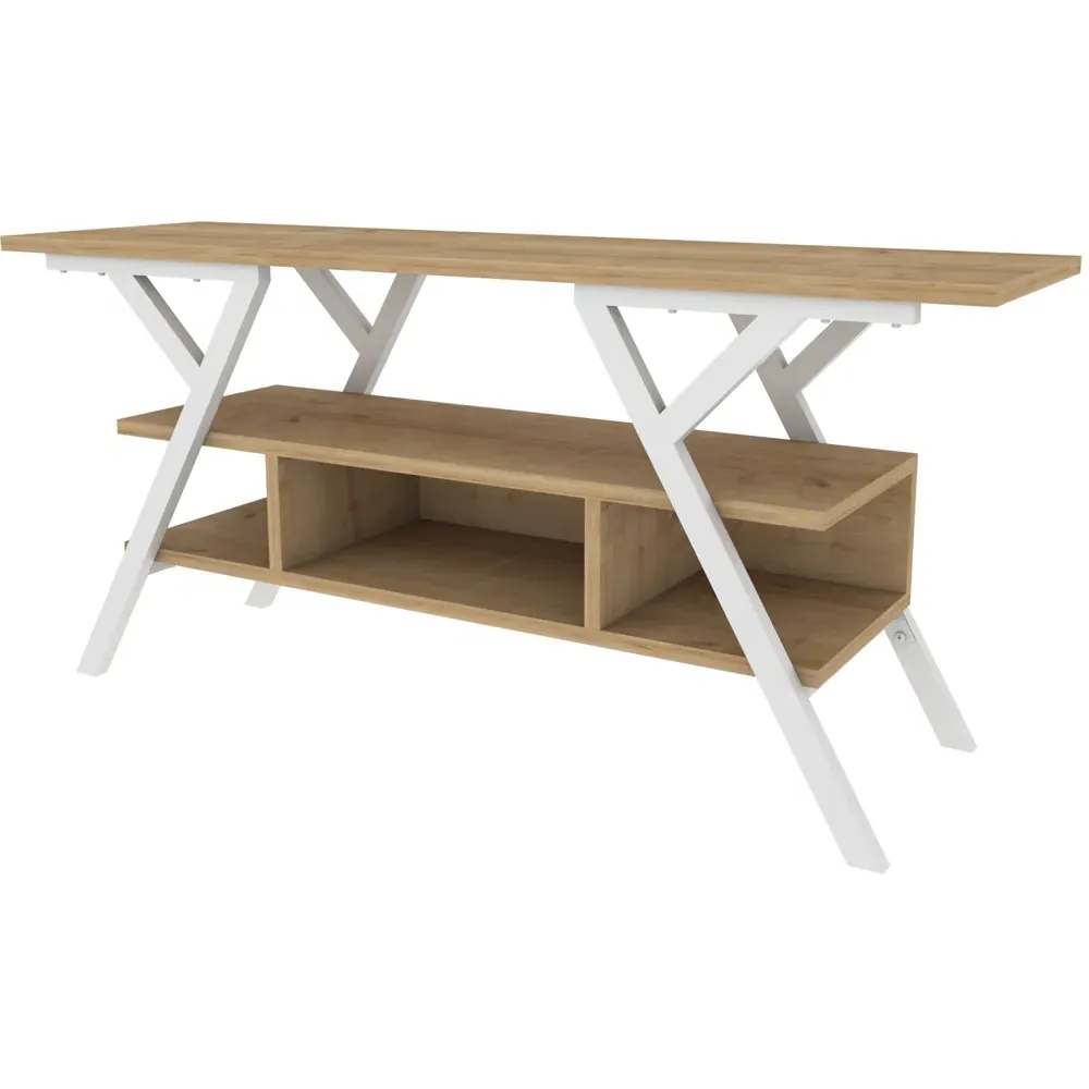 The Minerva TV unit offers practical storage with its four open shelves, accommodating TVs up to 55 inches. Its melamine-coated particle board construction features PVC edge banding for durability, while the metal legs provide sturdy support with scratch-resistant coating. The open shelving design suits media devices, books, and decorative items, and the eco-friendly materials ensure safe use. W120 x D30 x H45 cm.
