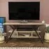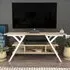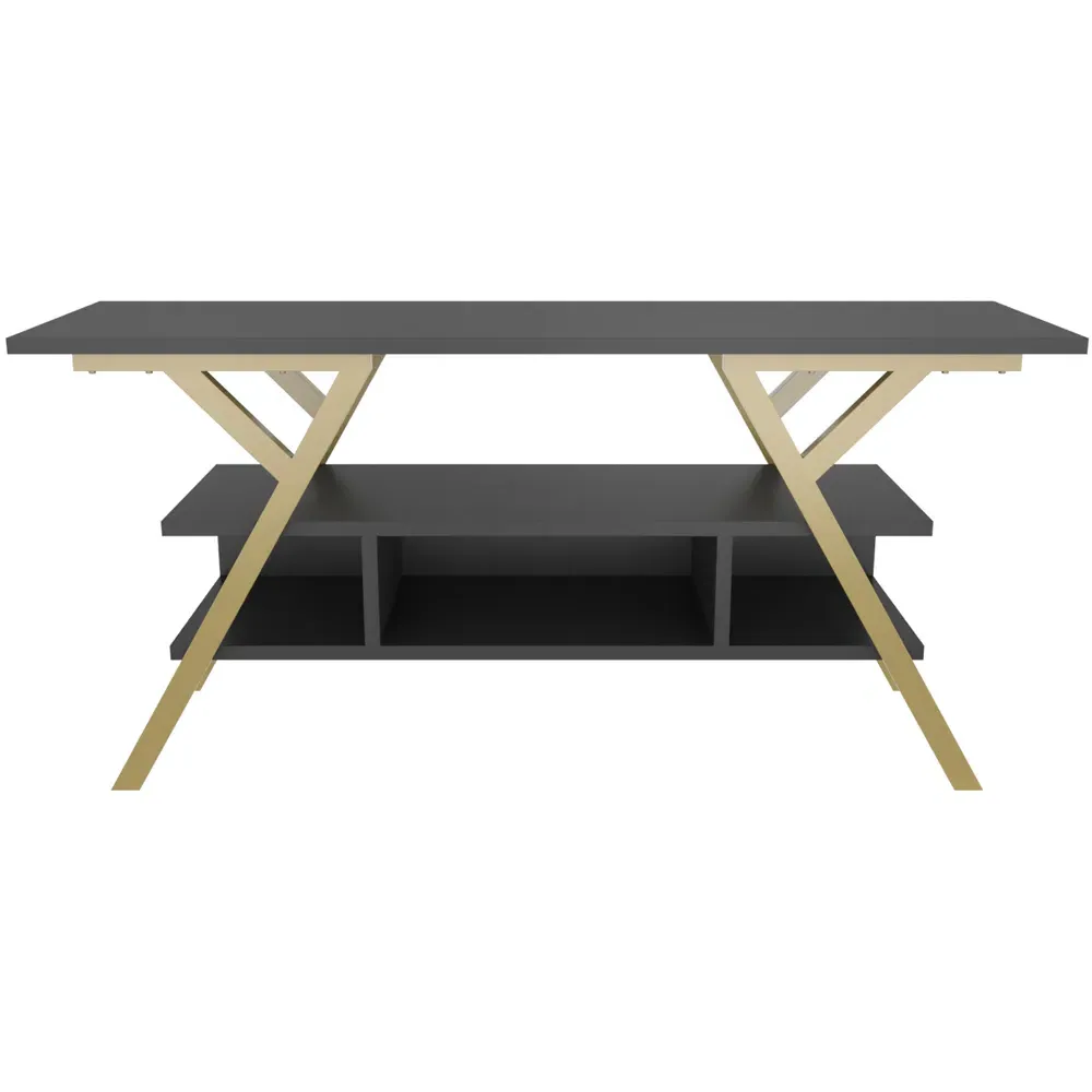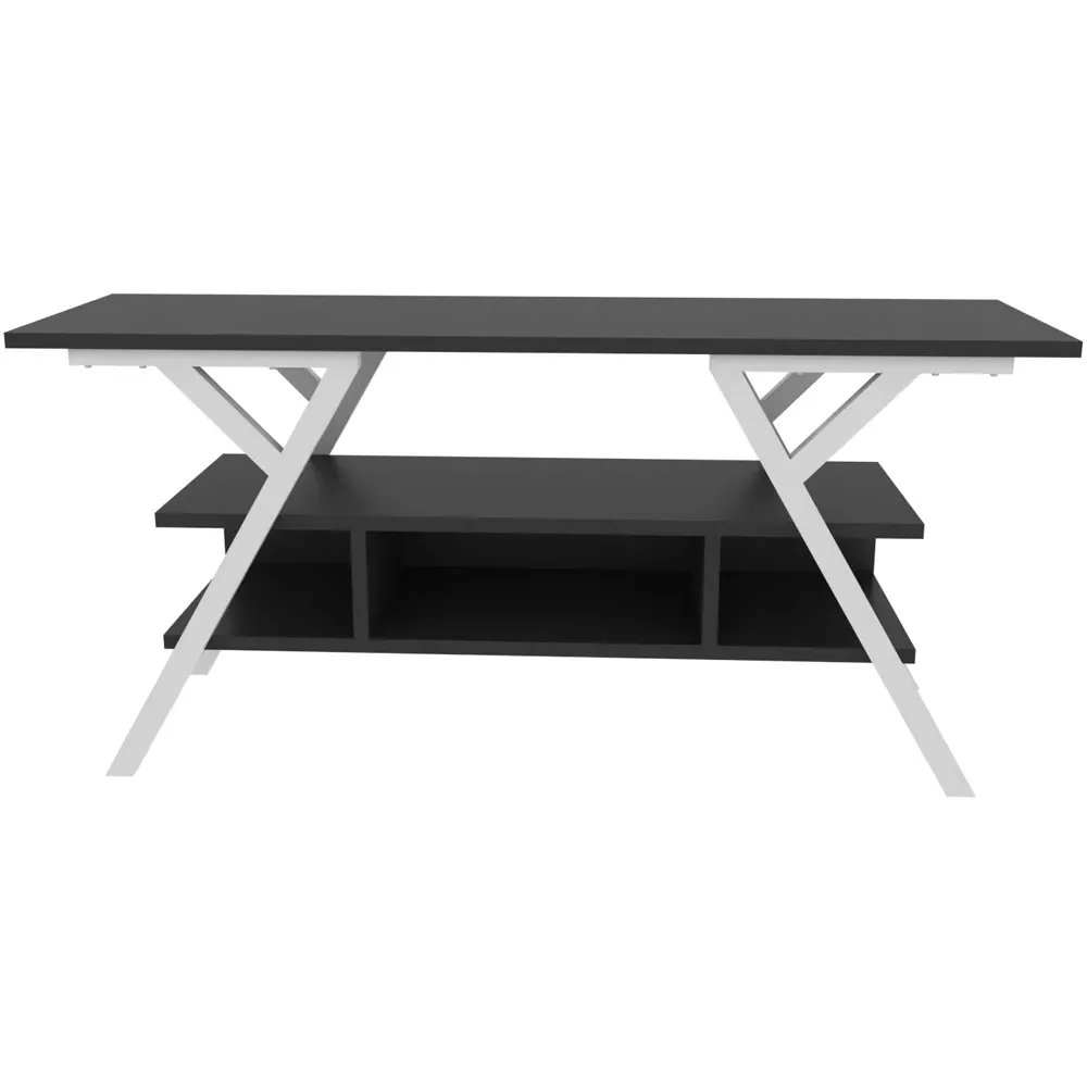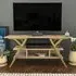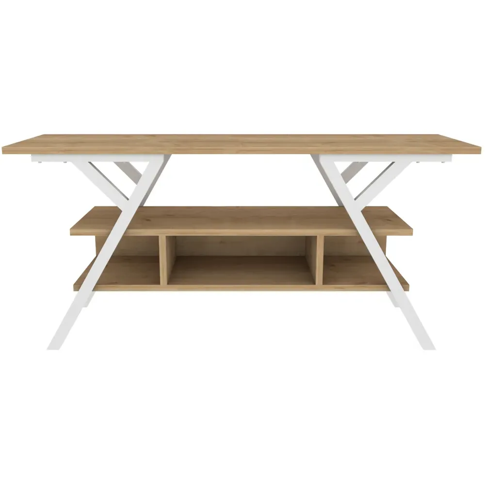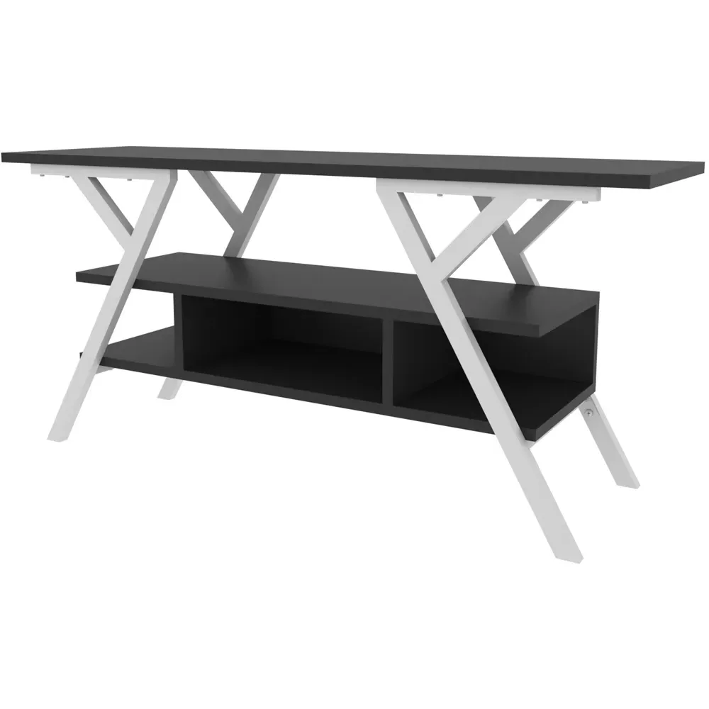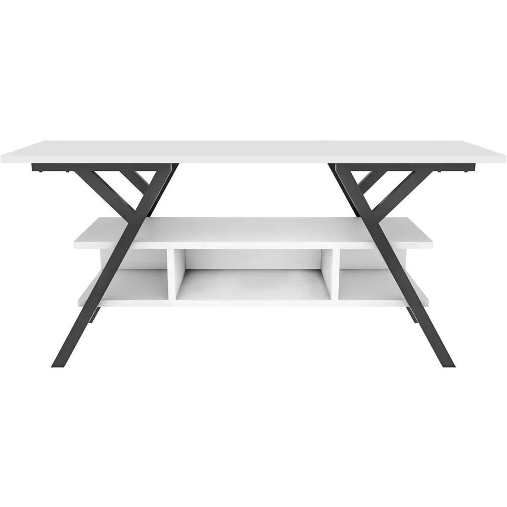 The Minerva TV unit offers practical storage with its four open shelves, accommodating TVs up to 55 inches. Its melamine-coated particle board construction features PVC edge banding for durability, while the metal legs provide sturdy support with scratch-resistant coating. The open shelving design suits media devices, books, and decorative items, and the eco-friendly materials ensure safe use. W120 x D30 x H45 cm.