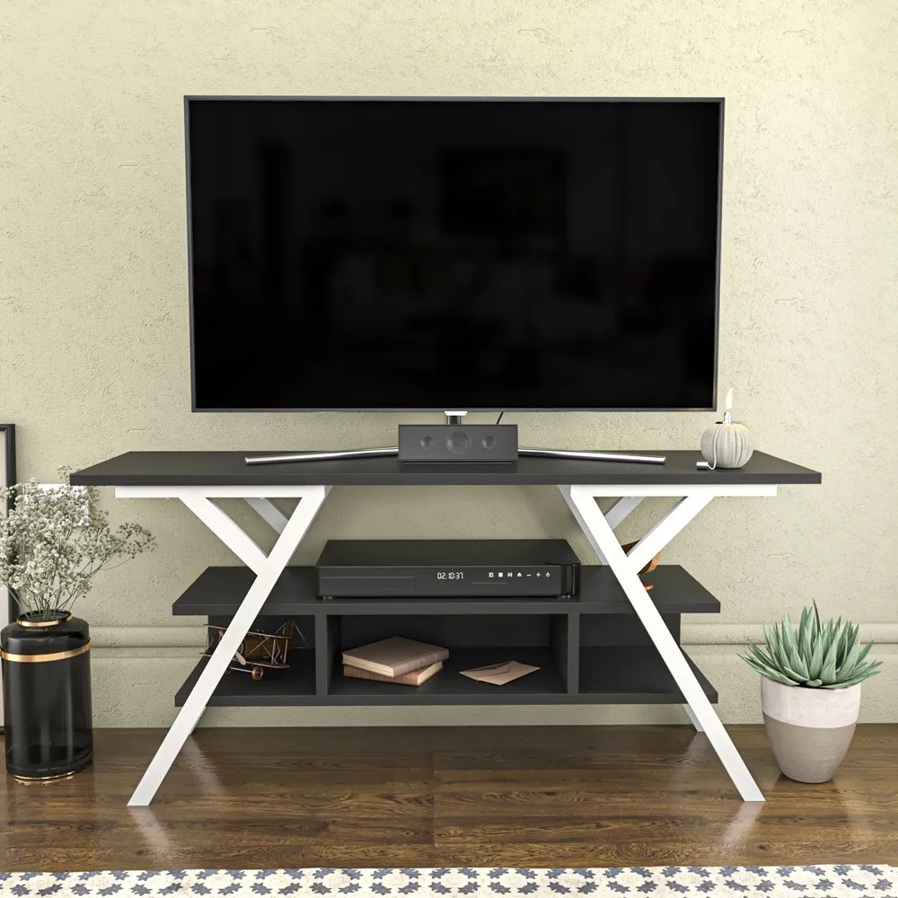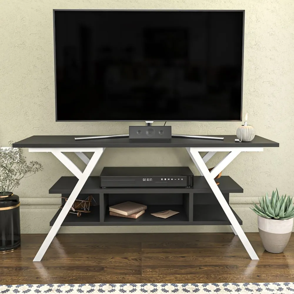 Transform your space with this Minerva 120cm wide simple and minimalist media stand for TVs up to 55 inch is defined by practical functionality and streamlined design. With four open shelves, this design offers huge storage space for your books, magazines, TV tuner, remote controller, or other media devices and collections. Top this design with a sleek flat-screen TV, then deck out vertical open shelves with your favourite books and DVDs, framed family photos, while using horizontal open shelves for your new video game console, tuner, and cable box. The media stand is made of 18mm-thick quality melamine-coated particle board and banded with first-class PVC edge banding tape. The stand is also enhanced and strengthened with metal legs which makes it sturdy and durable. Metal legs are coated with scratch and impact-resistant industrial static paint. It is manufactured using eco-friendly and health-friendly TSE-certified materials. The product will be delivered to the customer in the original package as disassembled. It is designed to be assembled by the customer easily using simple household tools like a power drill or screwdriver. Assembly instructions and installation hardware are included in the package. For fast and error-free installation, product parts are numbered with stickers in accordance with the assembly guide.
