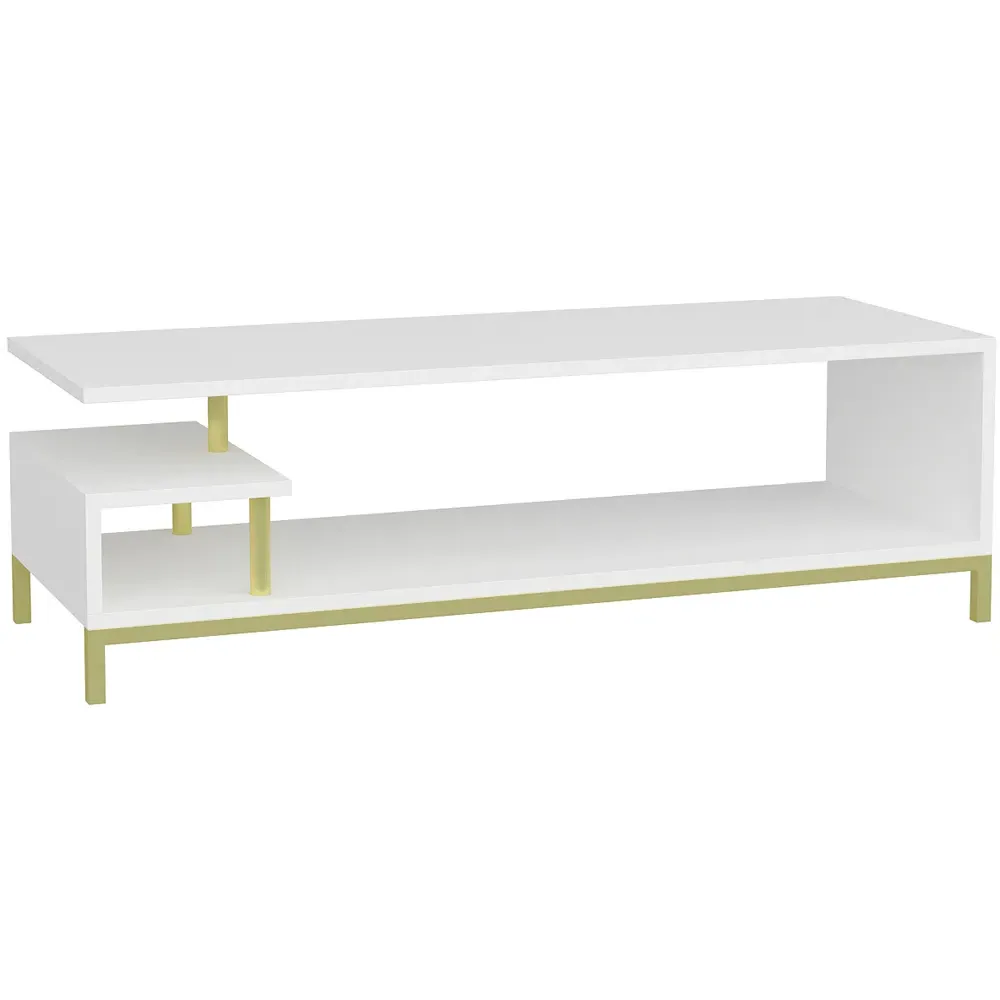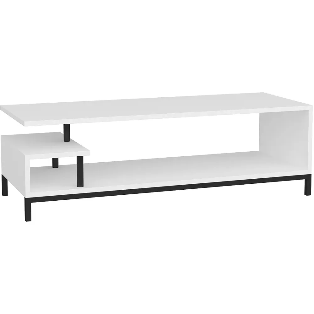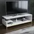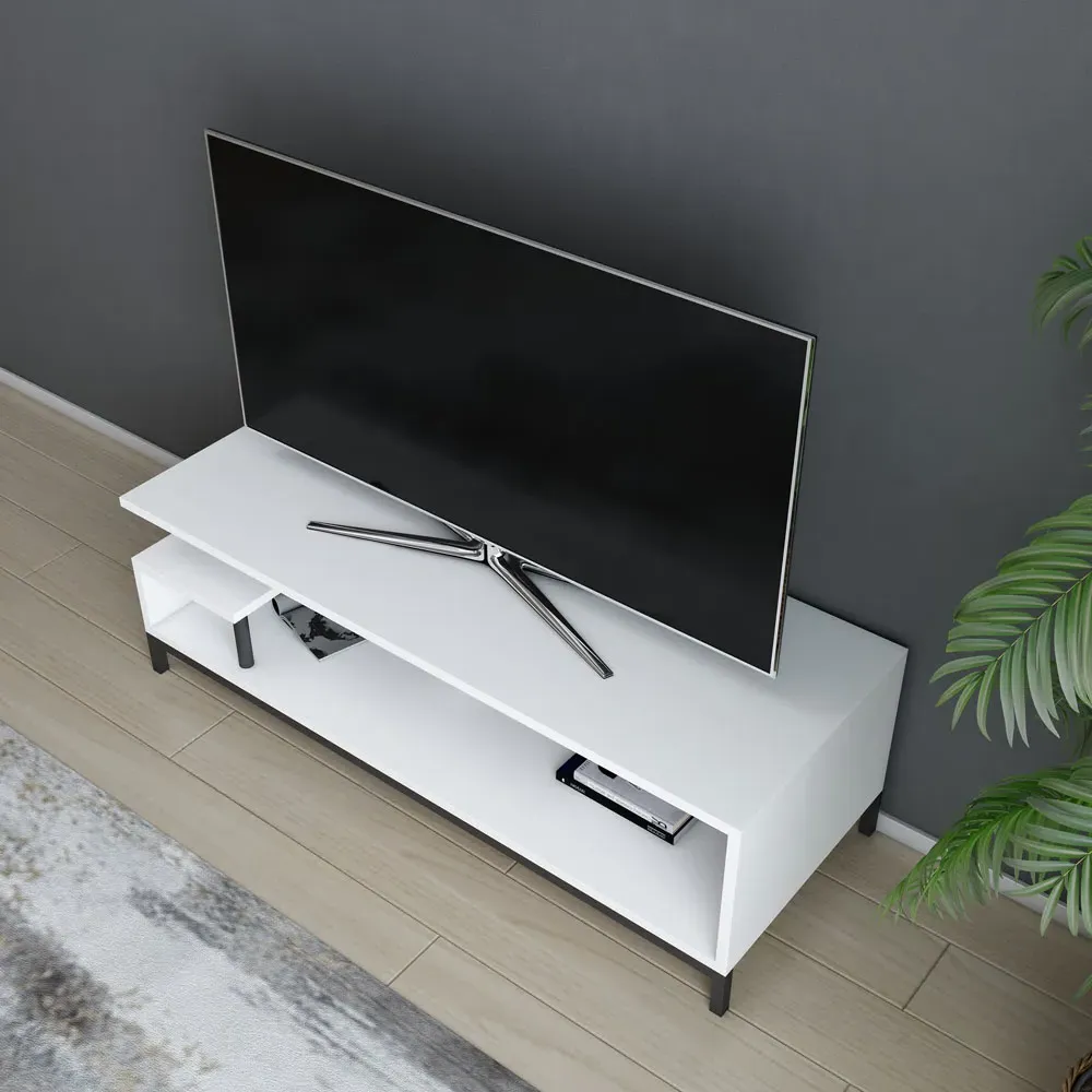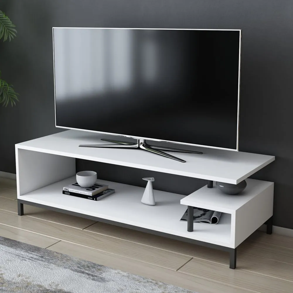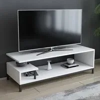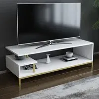 The Reilly TV unit combines functionality with its 2-shelf design, accommodating TVs up to 55 inches. Its open shelf configuration provides additional storage for books and accessories, while the 18mm thick manufactured wood construction with PVC edge banding ensures durability. The unit features eco-friendly materials and a solid structure that supports long-term use, with easy assembly using numbered parts and included hardware.