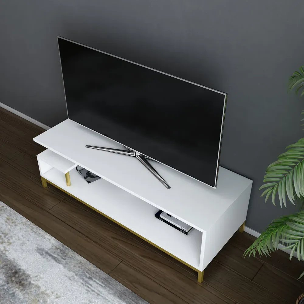 Reilly TV stand and media console for TVs up to 55 inch is a combination of functionality and on-trend design. It will fit every room and every style in your home. It is made of 18mm thick quality manufactured wood and metal. Manufactured wood is banded with first-class 8mm PVC edge banding tape. Overall, the media stand is manufactured using eco-friendly and health-friendly materials. The open shelf design will provide an additional storage compartment for books, magazines, and other decorative accessories, making your media entertainment centre tidy and organised. A durable, solid structure will give you the opportunity to use this TV stand for a long time. It can easily be assembled and disassembled, so you will not have a problem while moving to your new house. The product will be delivered to the customer in the original package as disassembled. It is designed to be assembled by the customer easily using simple household tools like a power drill or wrench. Assembly instructions and installation hardware are included in the package. For fast and error-free installation, product parts are numbered with stickers in accordance with the assembly guide.
