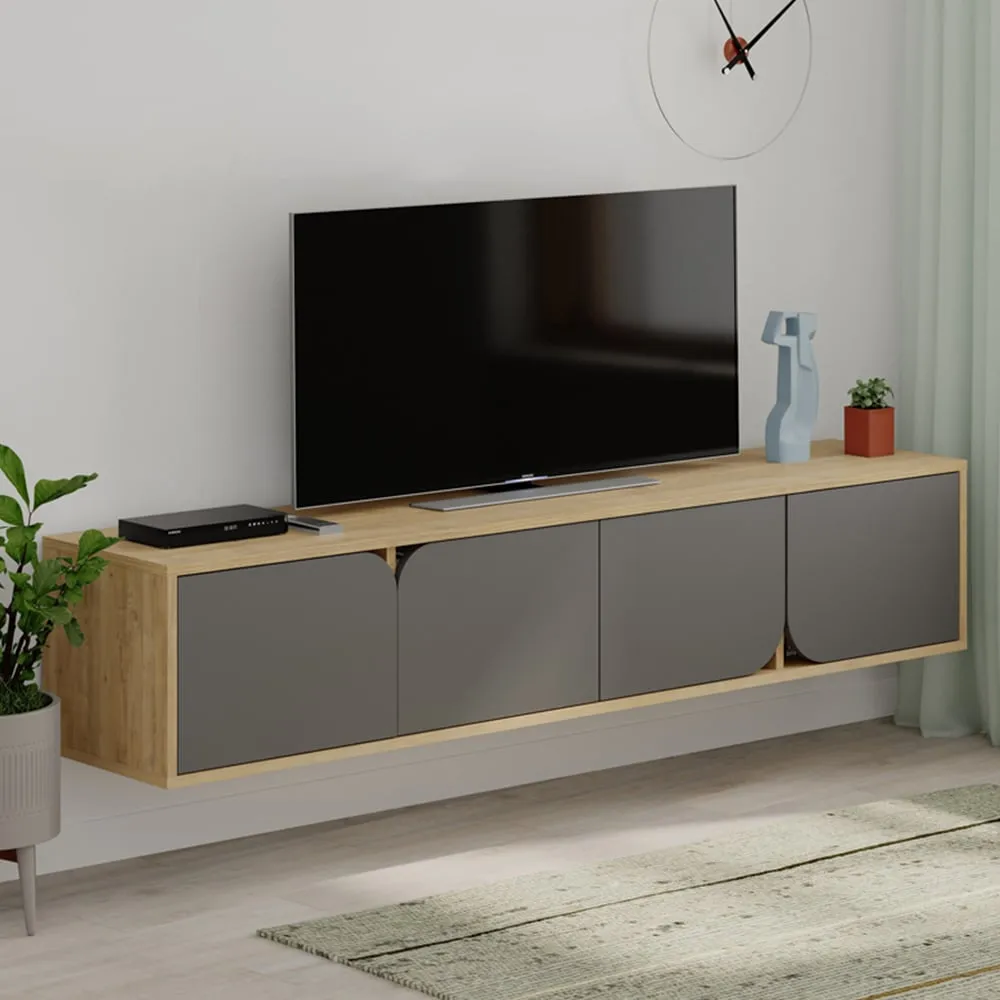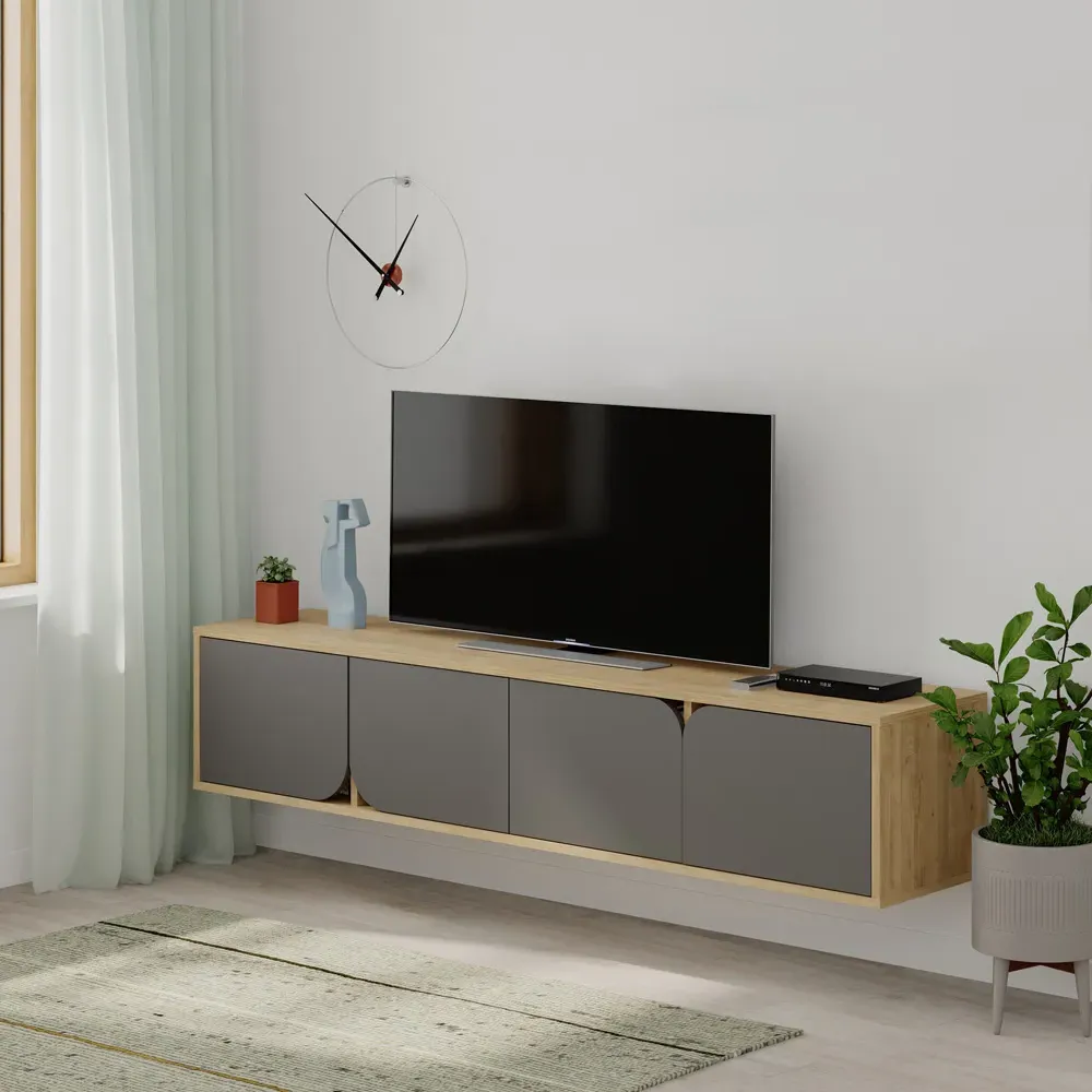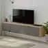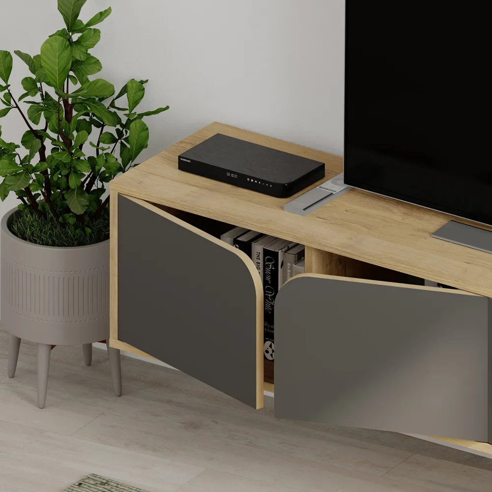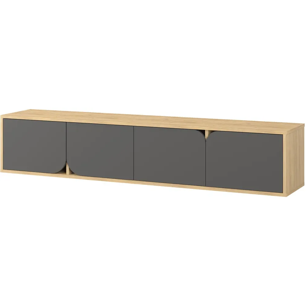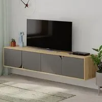 The Spark TV unit offers practical multimedia storage with its four-door design and oak effect finishes, featuring both enclosed and open compartments for flexible organization. Its spacious interior accommodates various devices and accessories, while the open shelving displays books or decorative pieces. The unit handles TVs up to 70 inches with its robust construction, and the oak detailing adds warmth to the design. W180 x D40 x H50 cm.