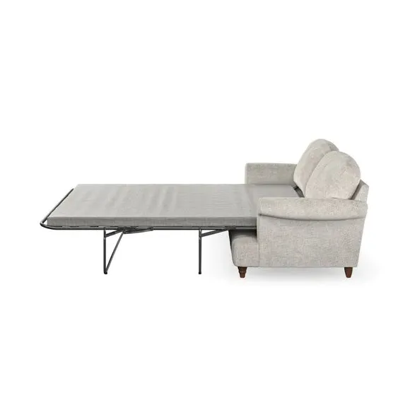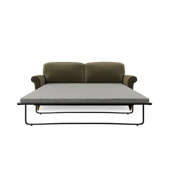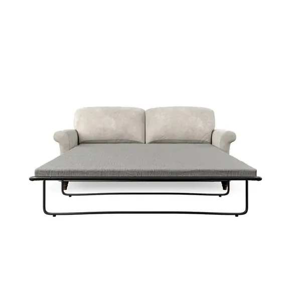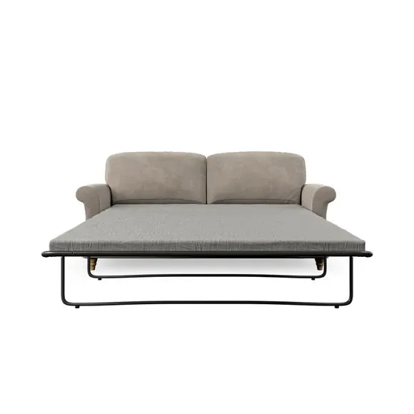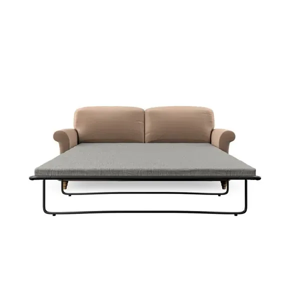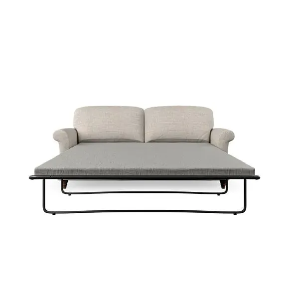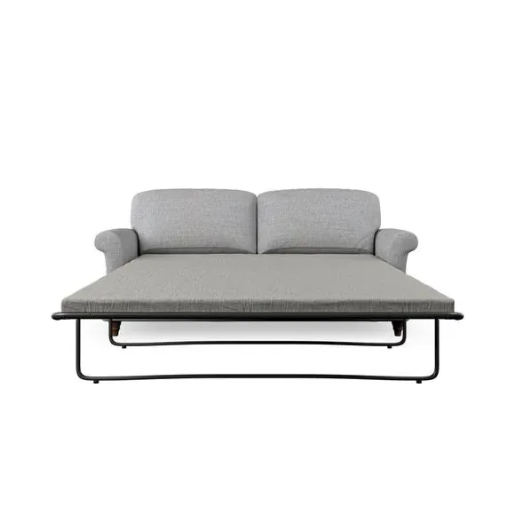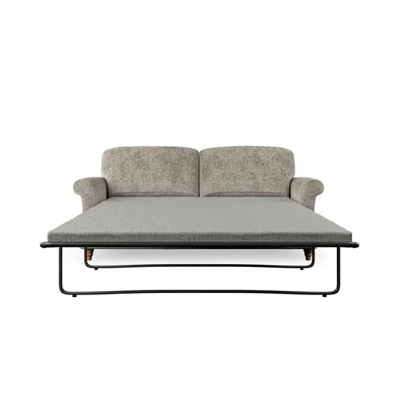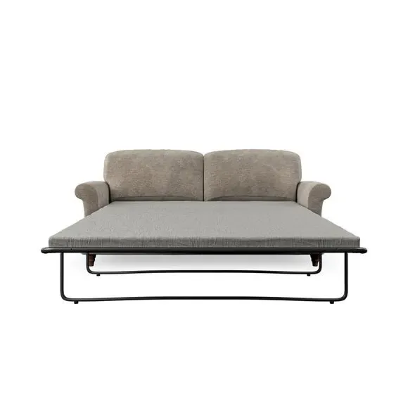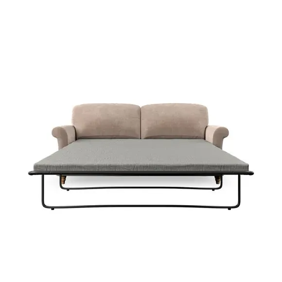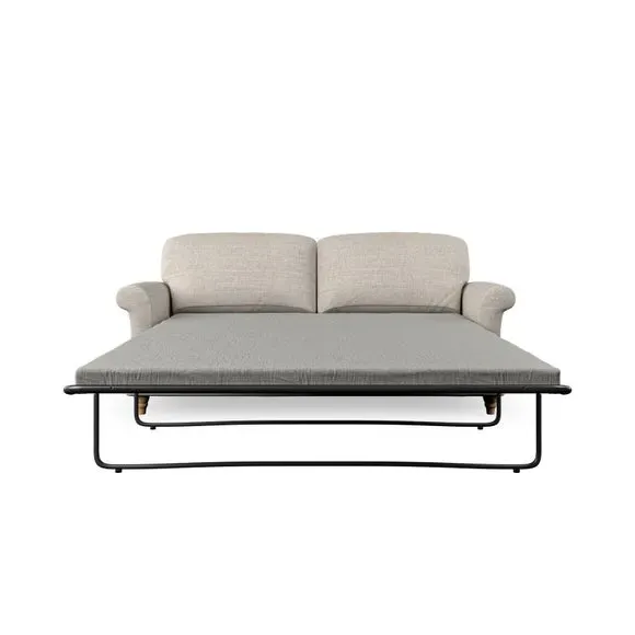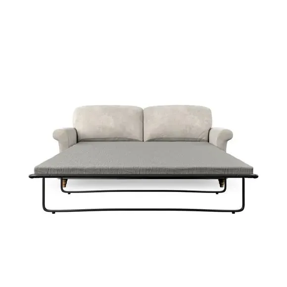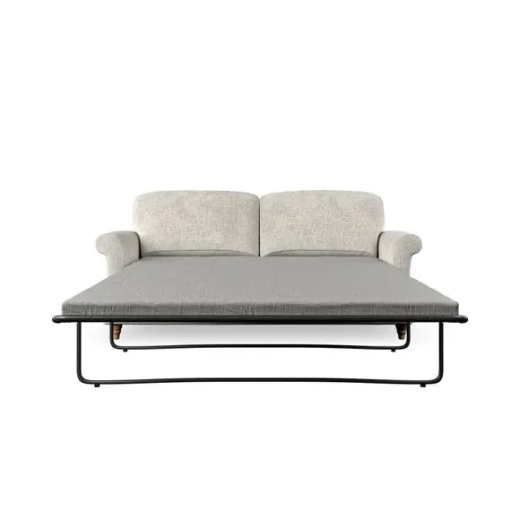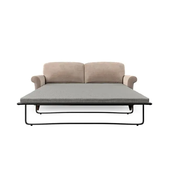 The sofa bed combines classic design with practical functionality, featuring elegant scroll arms and lugged seat cushions. Its serpentine seat springs provide reliable support, while the fibre-filled back cushions offer comfortable seating. The hidden bed mechanism converts easily for guest sleeping, and the customizable fabric options allow personal styling preferences.