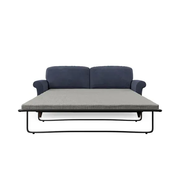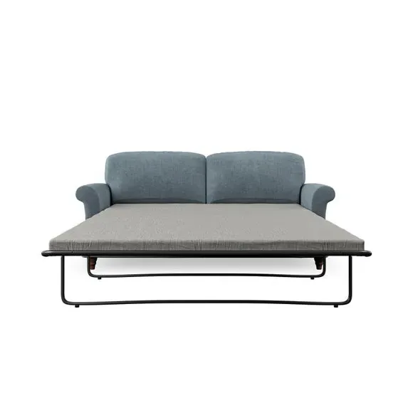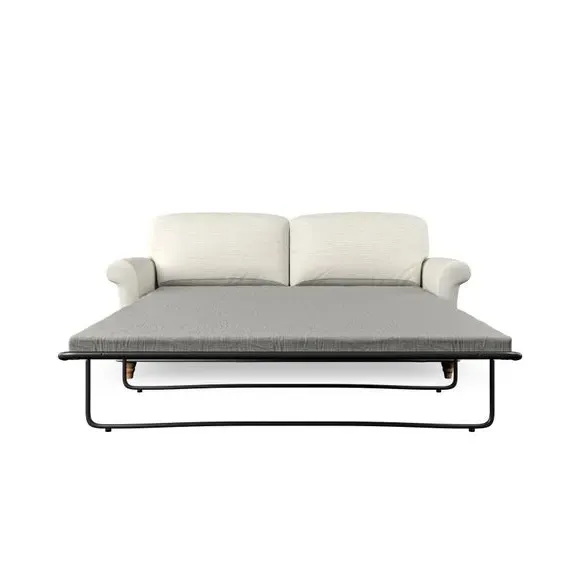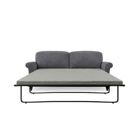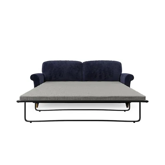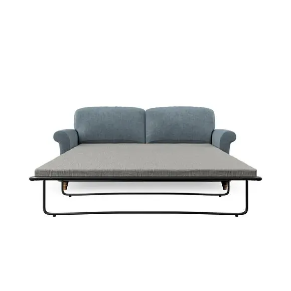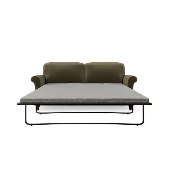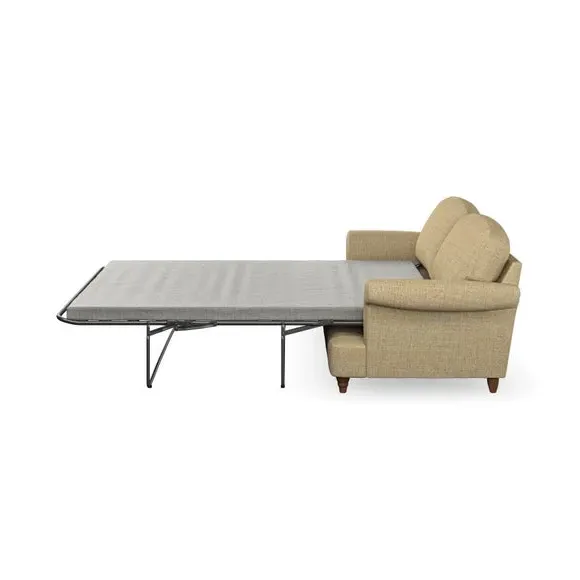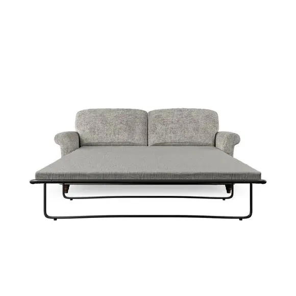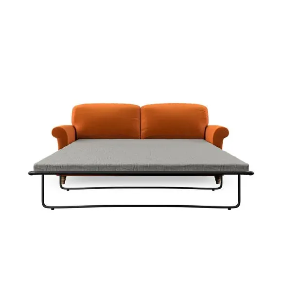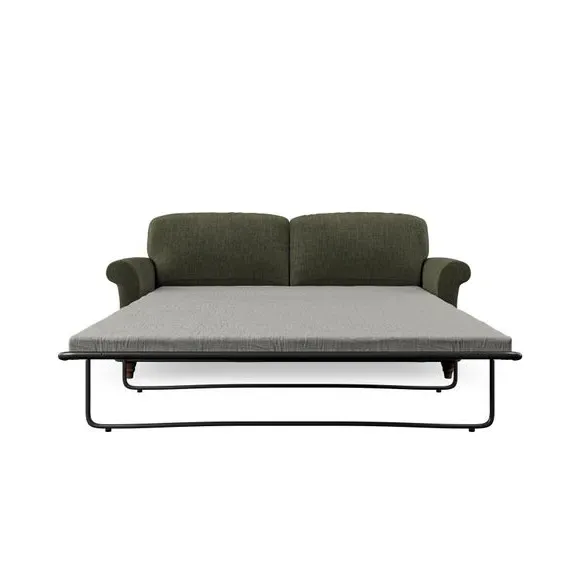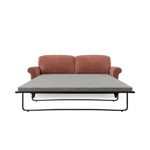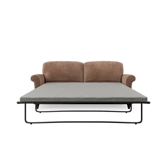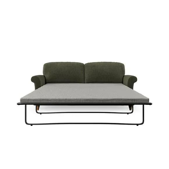 The sofa bed combines classic design with practical functionality, featuring elegant scroll arms and lugged seat cushions. Its serpentine seat springs provide reliable support, while the fibre-filled back cushions offer comfortable seating. The hidden bed mechanism converts easily for guest sleeping, and the customizable fabric options allow personal styling preferences.