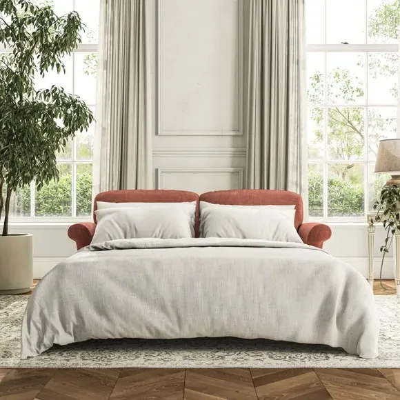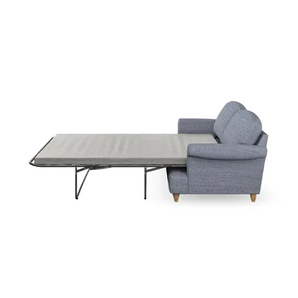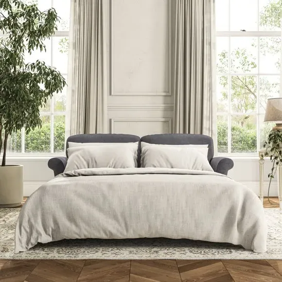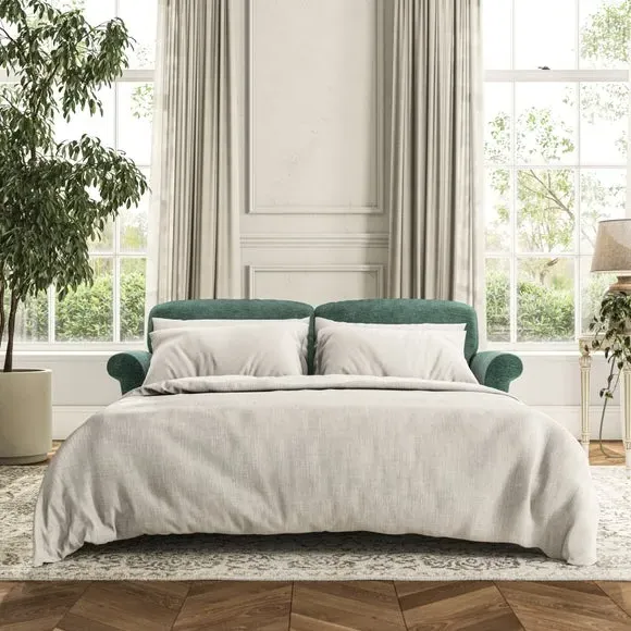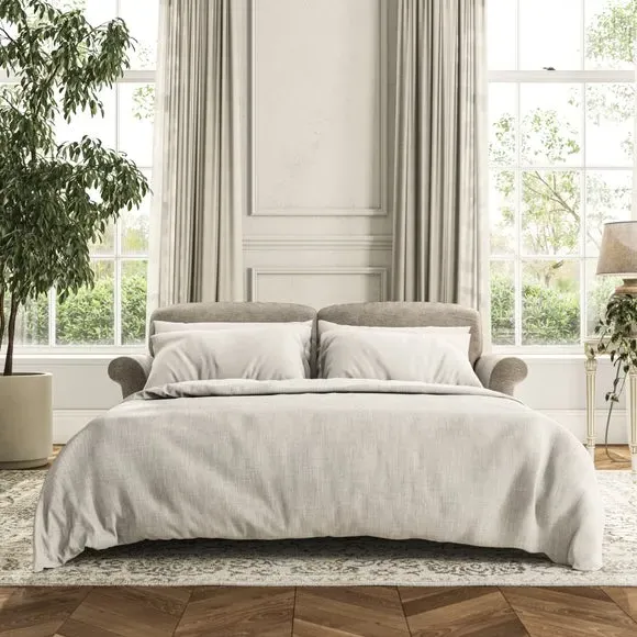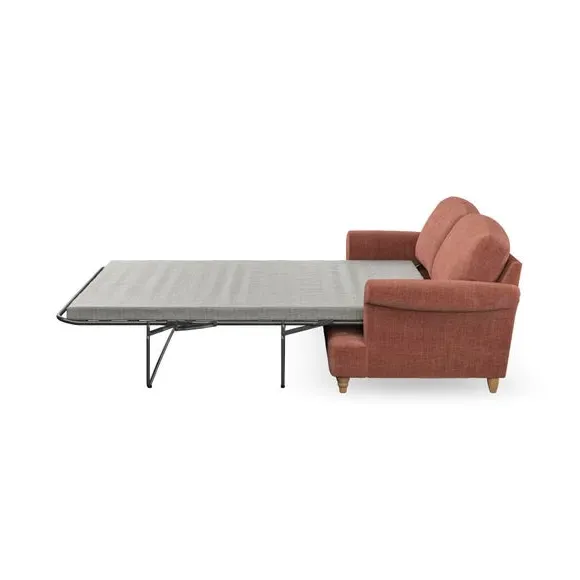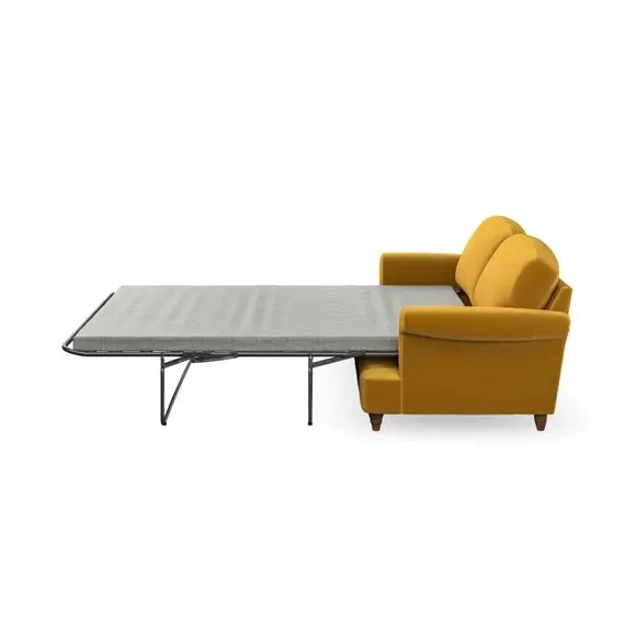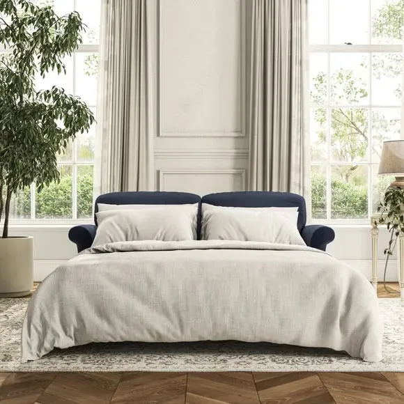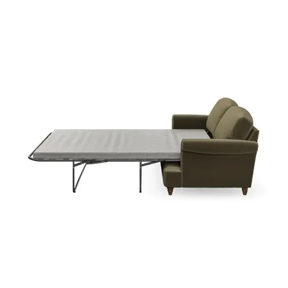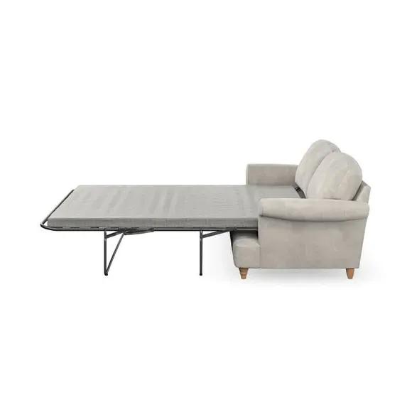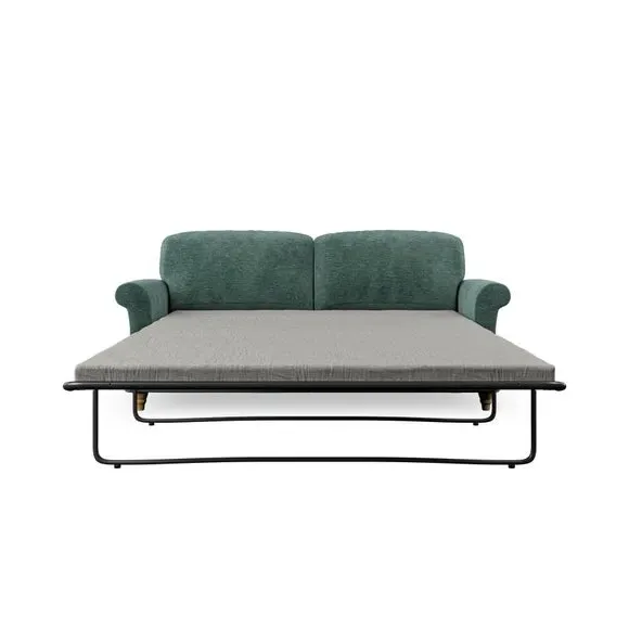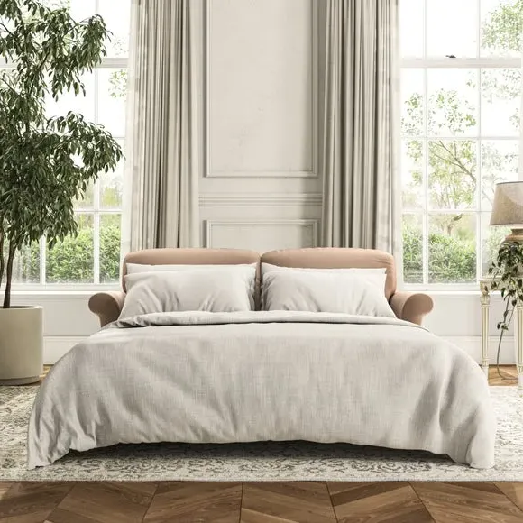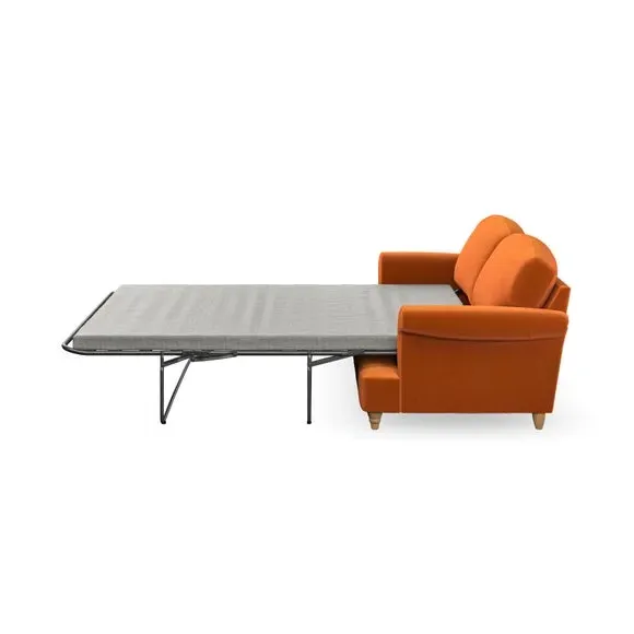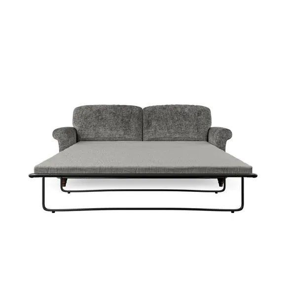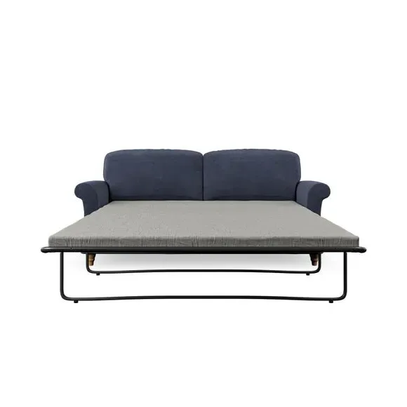 The sofa bed combines classic design with practical functionality, featuring elegant scroll arms and lugged seat cushions. Its serpentine seat springs provide reliable support, while the fibre-filled back cushions offer comfortable seating. The hidden bed mechanism converts easily for guest sleeping, and the customizable fabric options allow personal styling preferences.