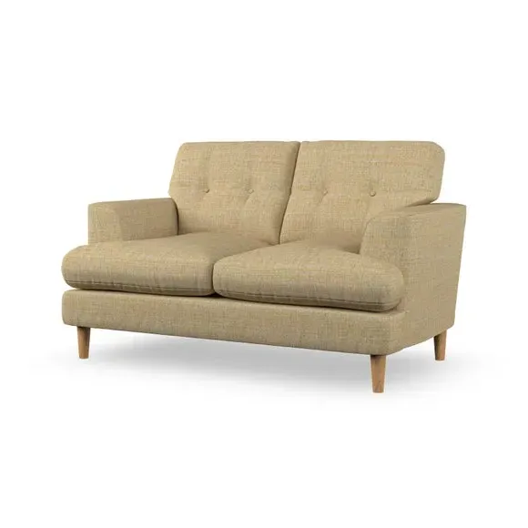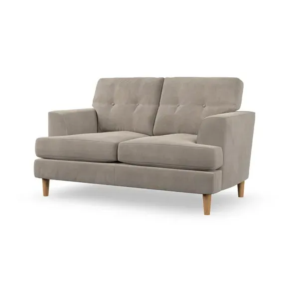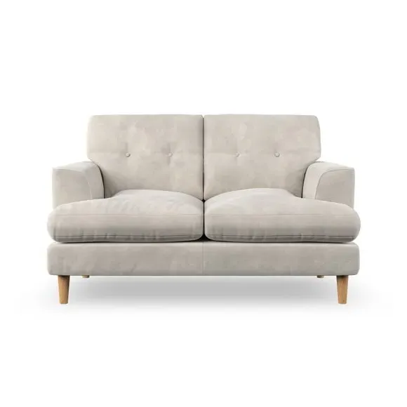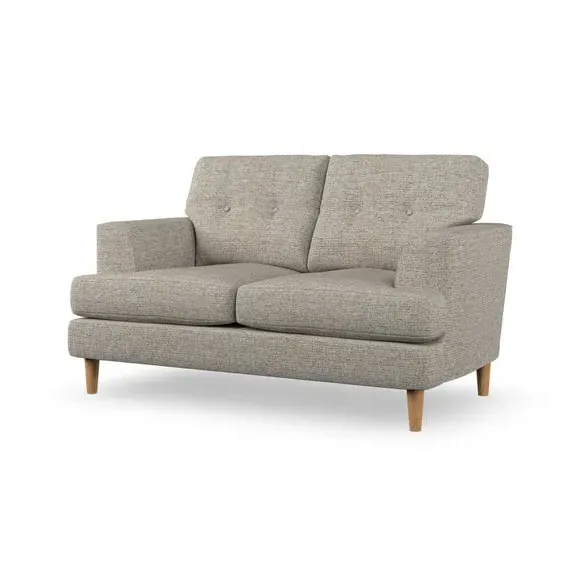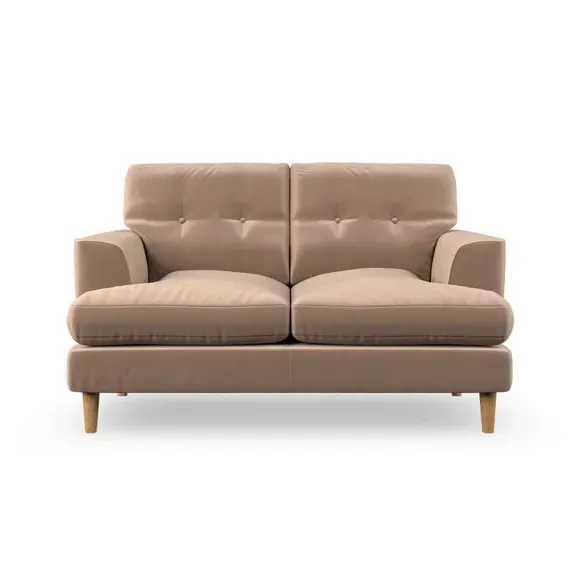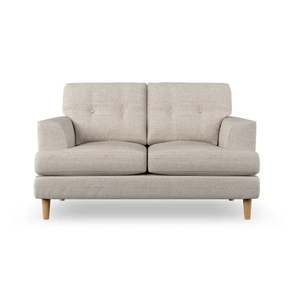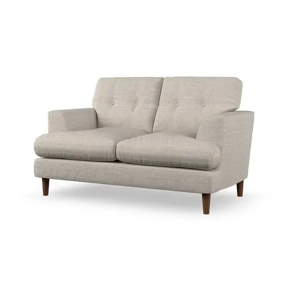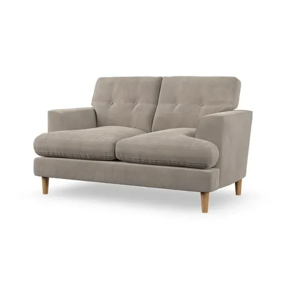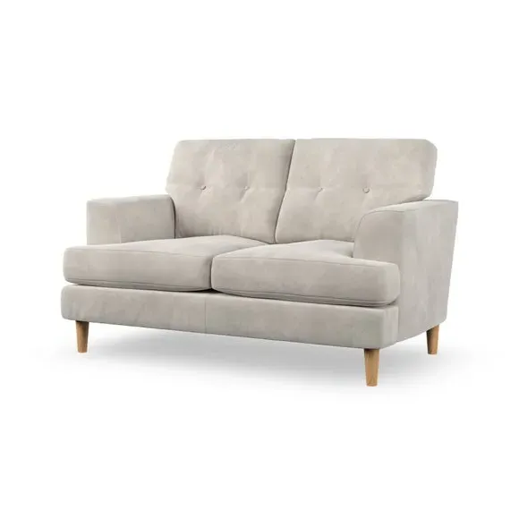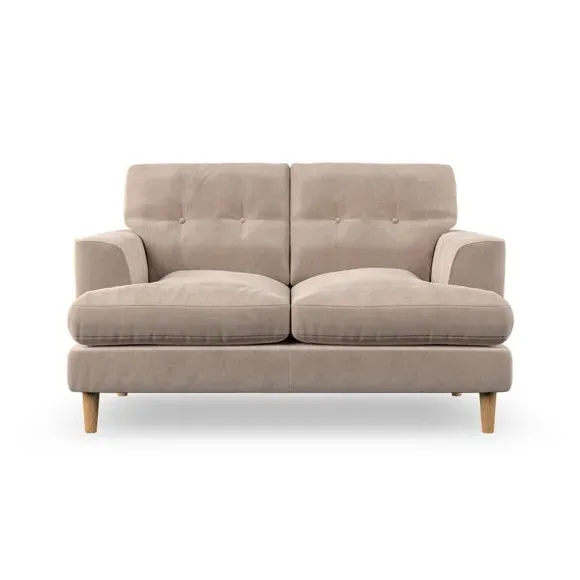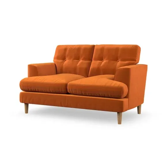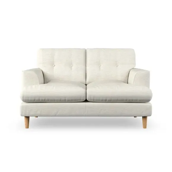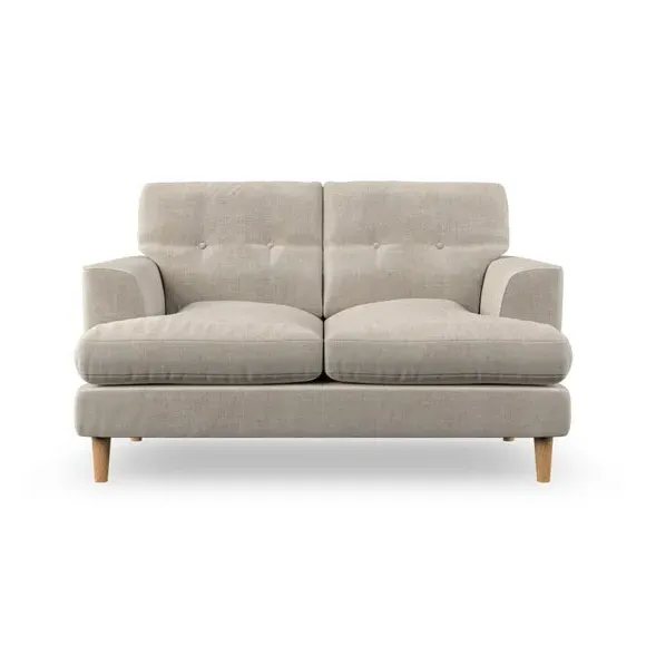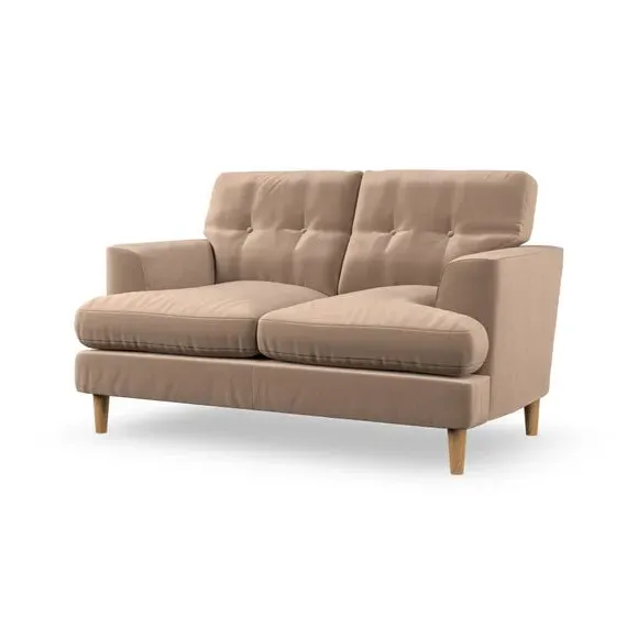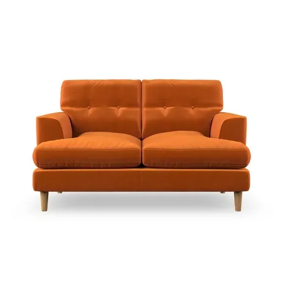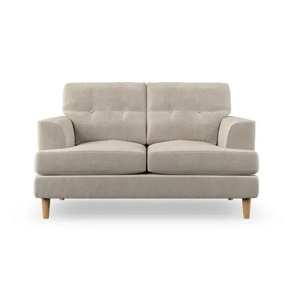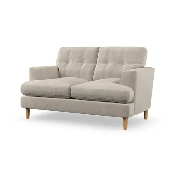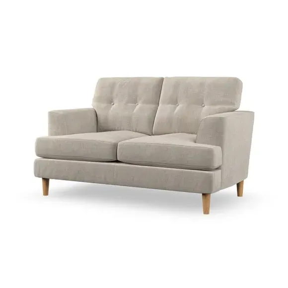* Scandi inspired design* High legs* Button pull detailing* Choose the cushion filling, leg colour and fabric Compact yet sophisticated, the Cooper 2 Seater Sofa is perfect for smaller spaces or as a complementary piece in larger rooms. Drawing inspiration from Scandinavian furniture design, it features an elegant high-leg frame, clean lines, and generous T-shaped seat cushions. The fibre-filled back cushions, detailed with button pulls, deliver comfort and charm. Customise your sofa with a range of fabric types, leg finishes, and cushion fillings to make it uniquely yours.
