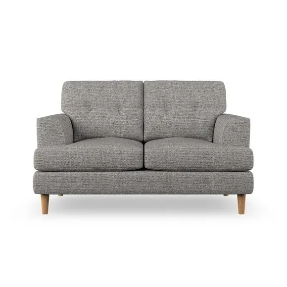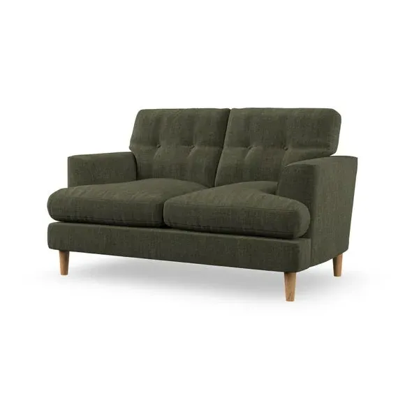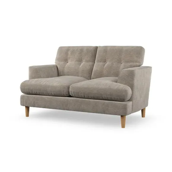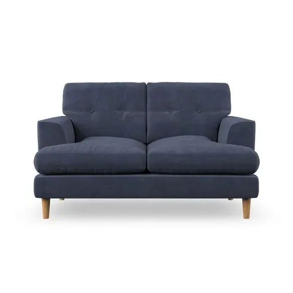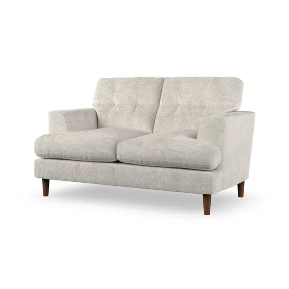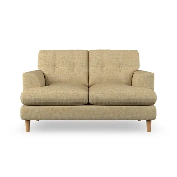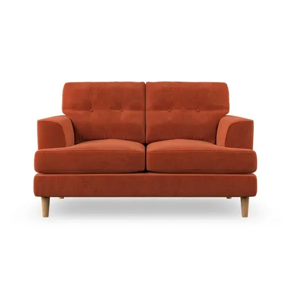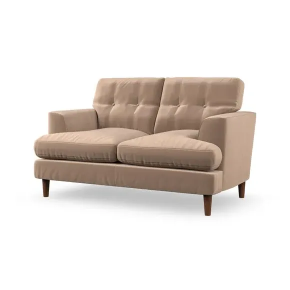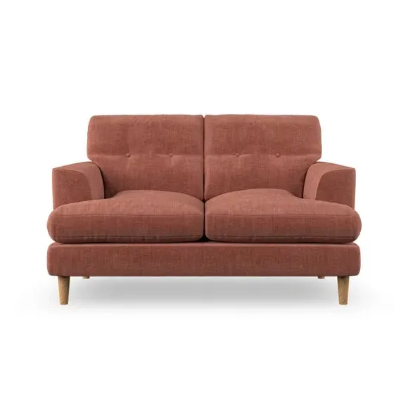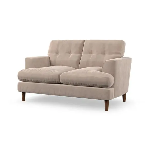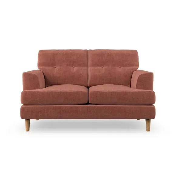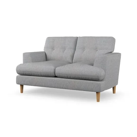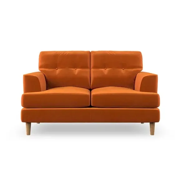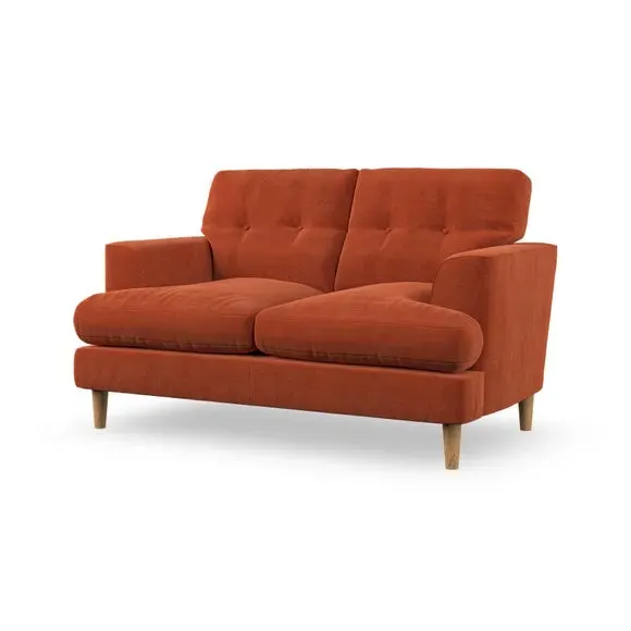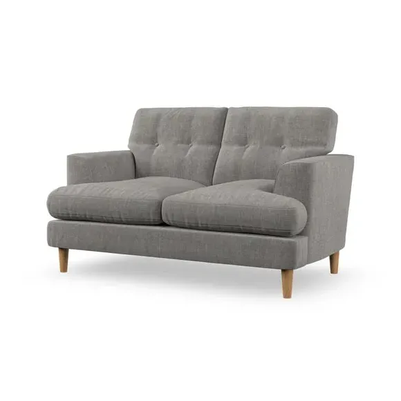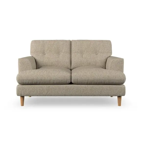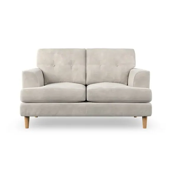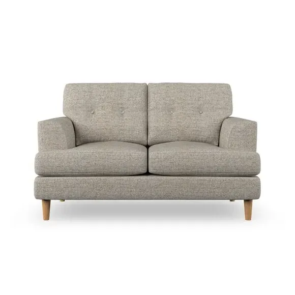 * Scandi inspired design* High legs* Button pull detailing* Choose the cushion filling, leg colour and fabric Compact yet sophisticated, the Cooper 2 Seater Sofa is perfect for smaller spaces or as a complementary piece in larger rooms. Drawing inspiration from Scandinavian furniture design, it features an elegant high-leg frame, clean lines, and generous T-shaped seat cushions. The fibre-filled back cushions, detailed with button pulls, deliver comfort and charm. Customise your sofa with a range of fabric types, leg finishes, and cushion fillings to make it uniquely yours.