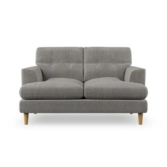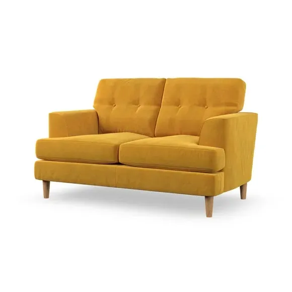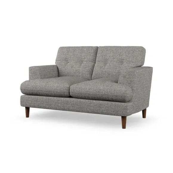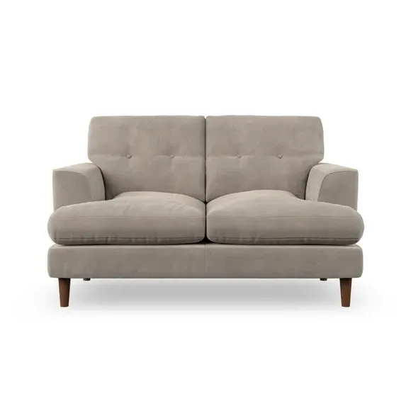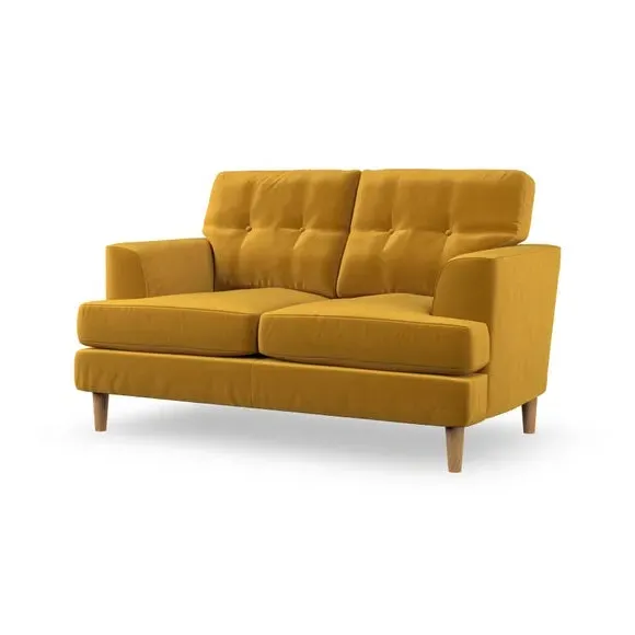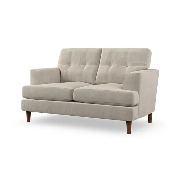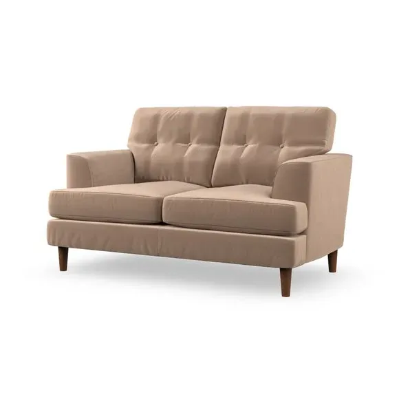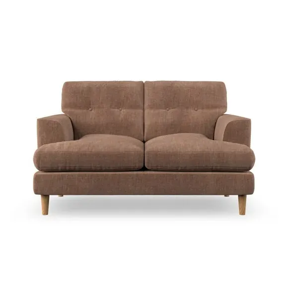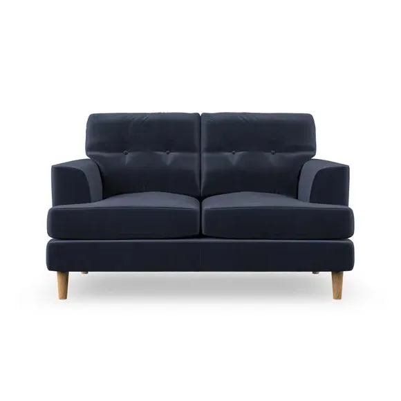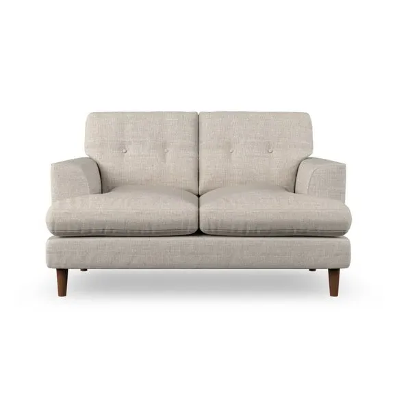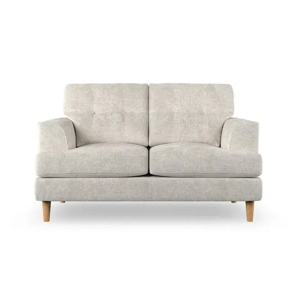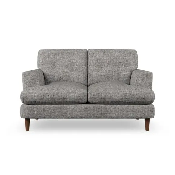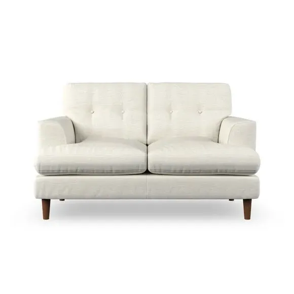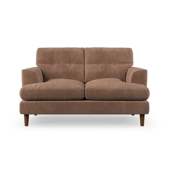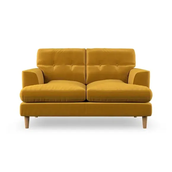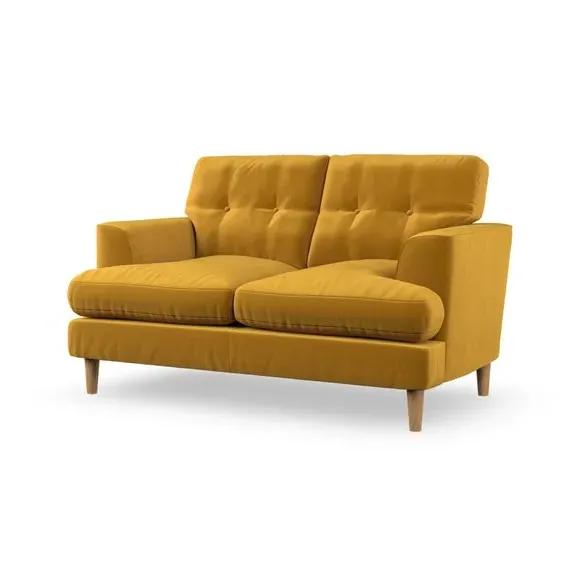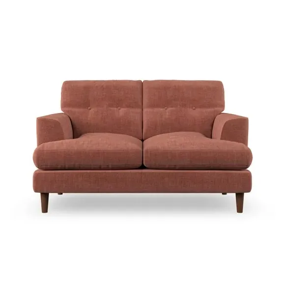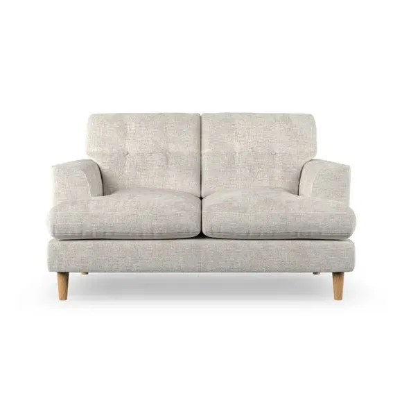 * Scandi inspired design* High legs* Button pull detailing* Choose the cushion filling, leg colour and fabric Compact yet sophisticated, the Cooper 2 Seater Sofa is perfect for smaller spaces or as a complementary piece in larger rooms. Drawing inspiration from Scandinavian furniture design, it features an elegant high-leg frame, clean lines, and generous T-shaped seat cushions. The fibre-filled back cushions, detailed with button pulls, deliver comfort and charm. Customise your sofa with a range of fabric types, leg finishes, and cushion fillings to make it uniquely yours.