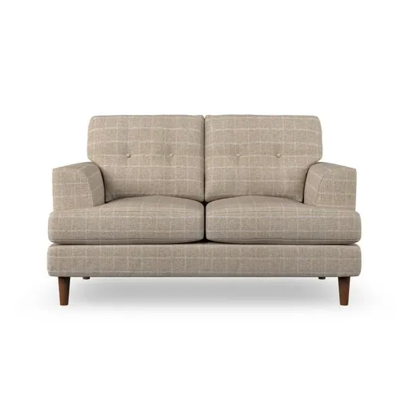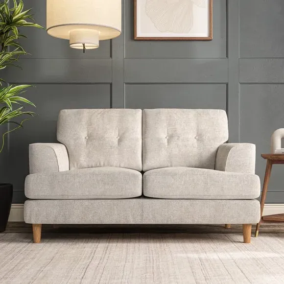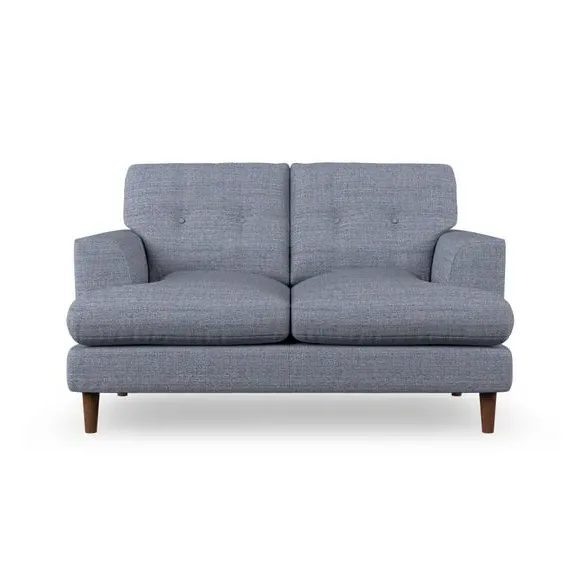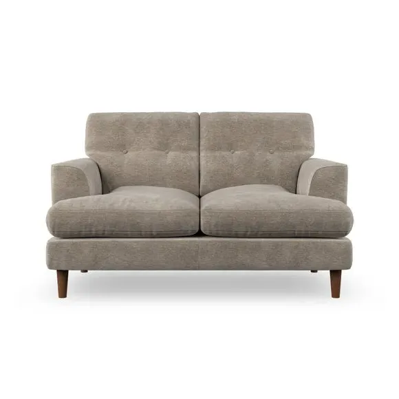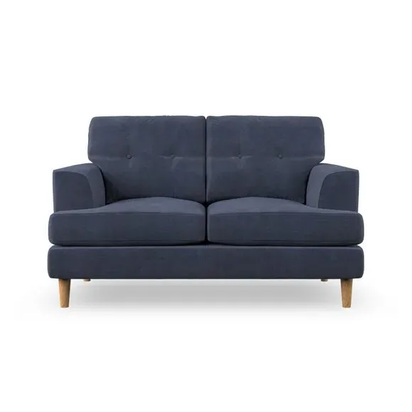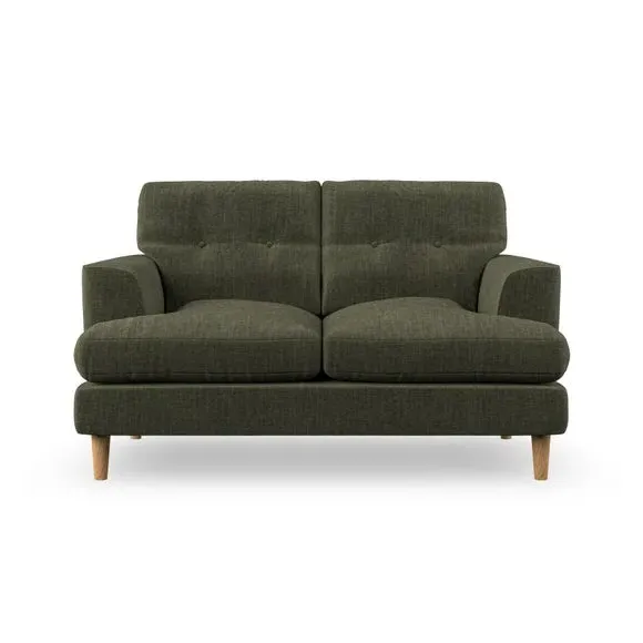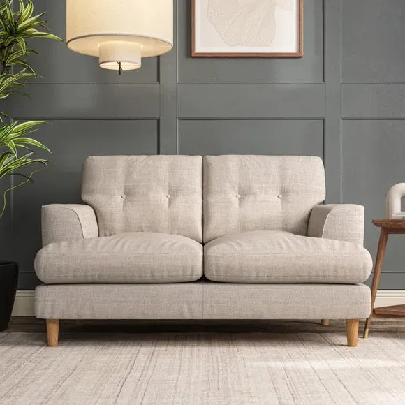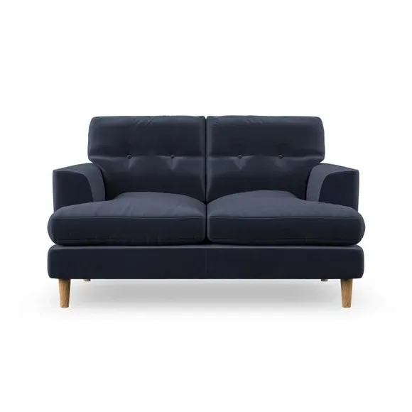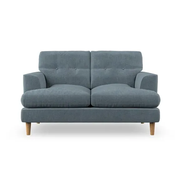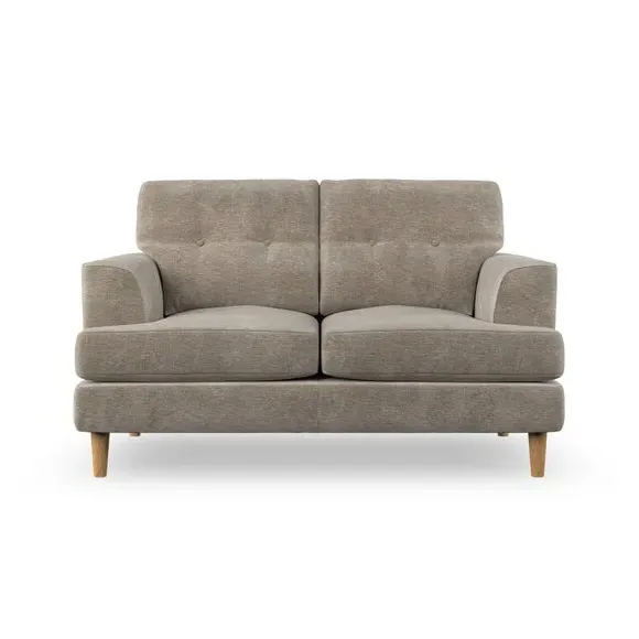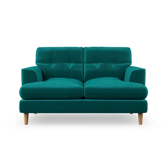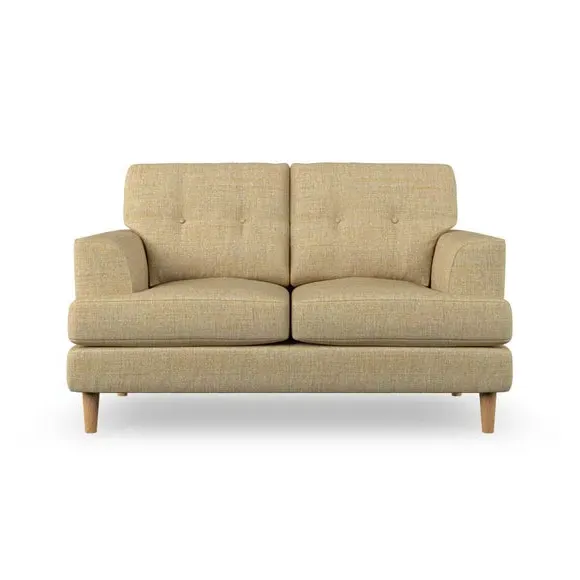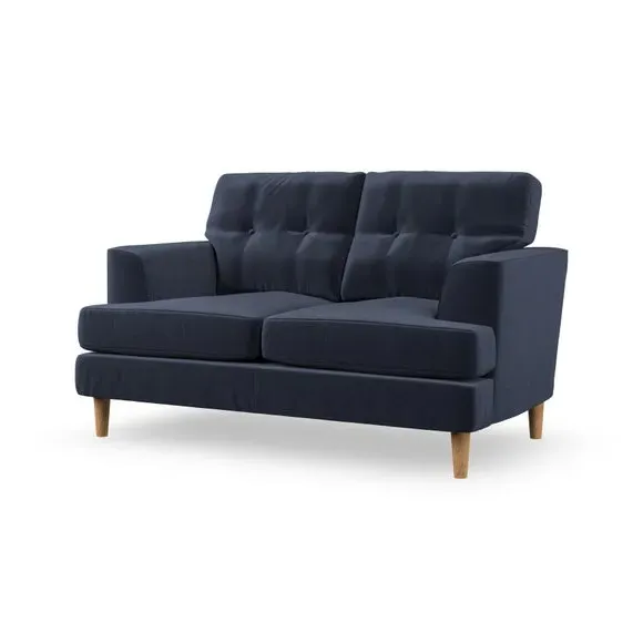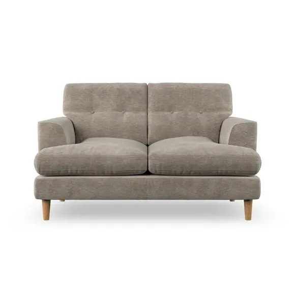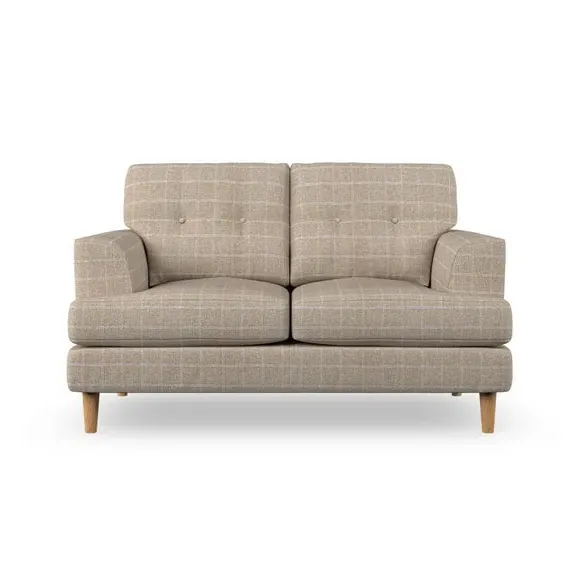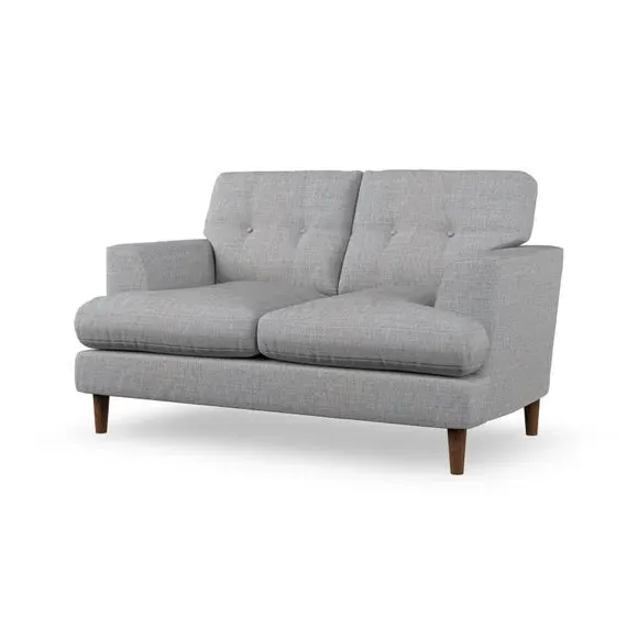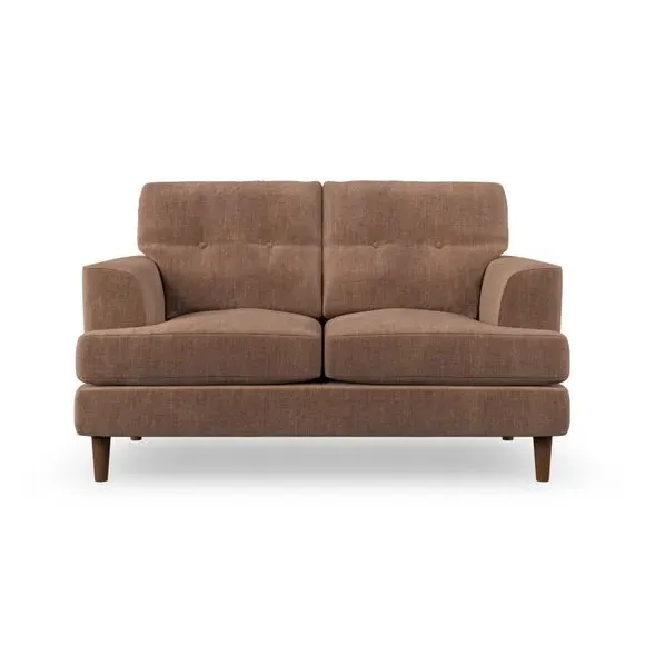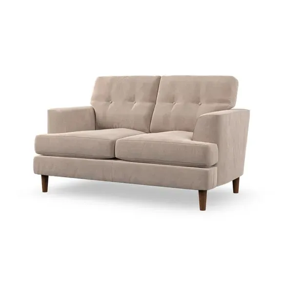 * Scandi inspired design* High legs* Button pull detailing* Choose the cushion filling, leg colour and fabric Compact yet sophisticated, the Cooper 2 Seater Sofa is perfect for smaller spaces or as a complementary piece in larger rooms. Drawing inspiration from Scandinavian furniture design, it features an elegant high-leg frame, clean lines, and generous T-shaped seat cushions. The fibre-filled back cushions, detailed with button pulls, deliver comfort and charm. Customise your sofa with a range of fabric types, leg finishes, and cushion fillings to make it uniquely yours.