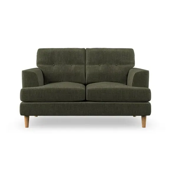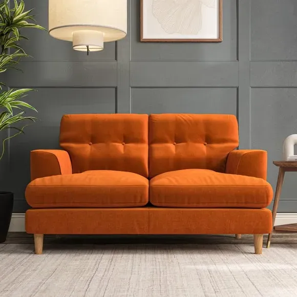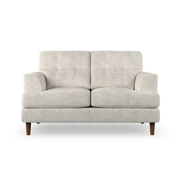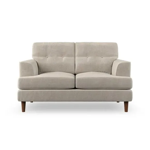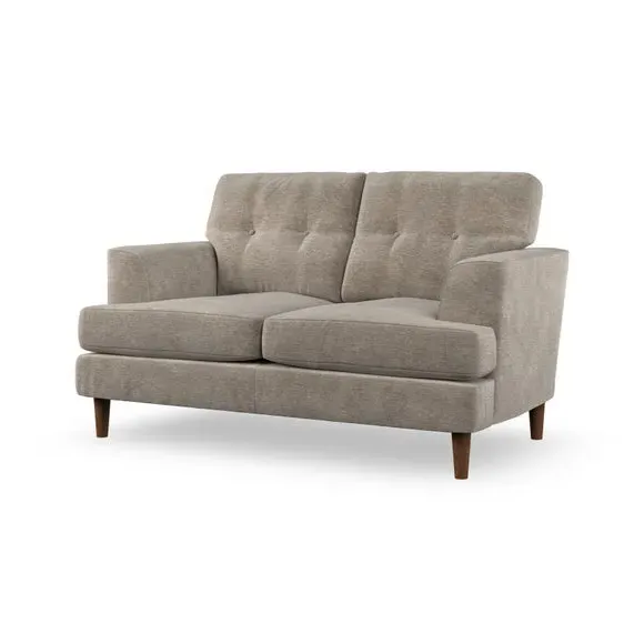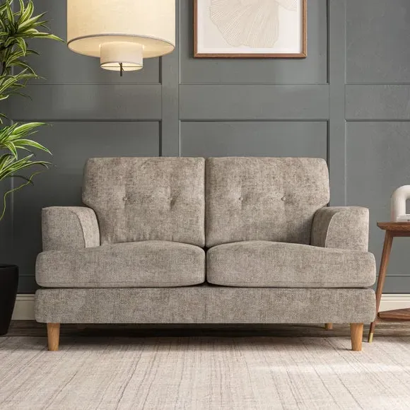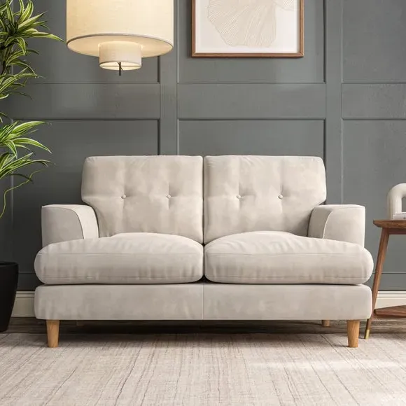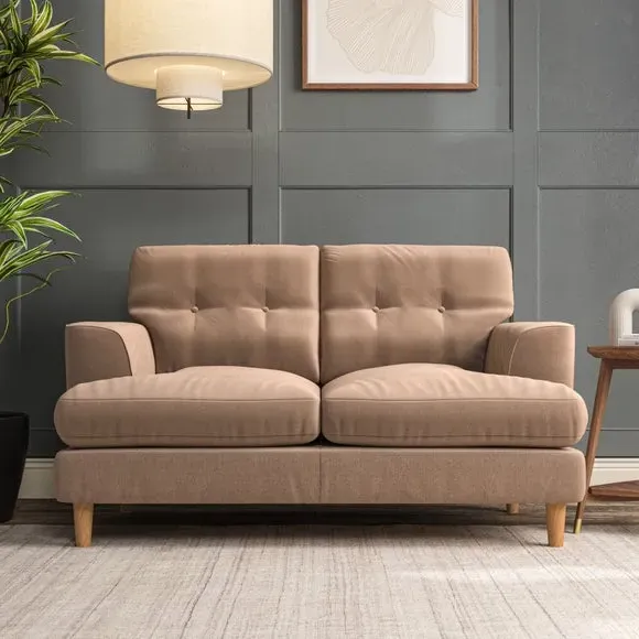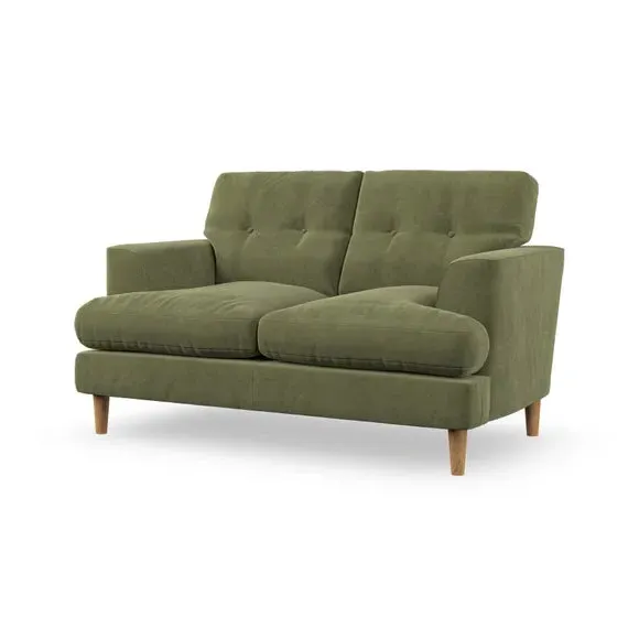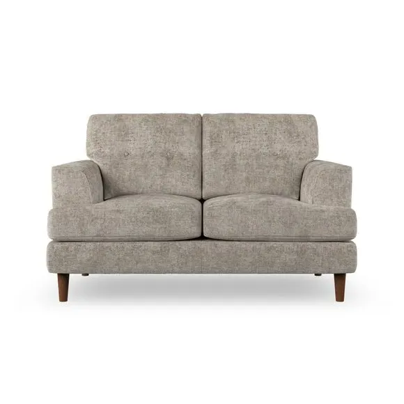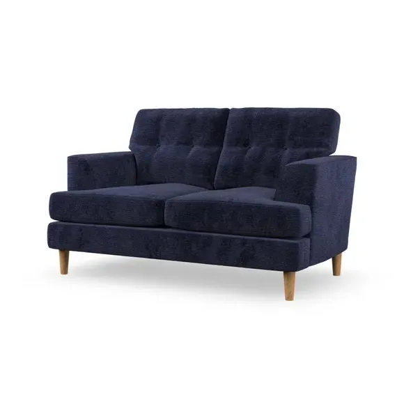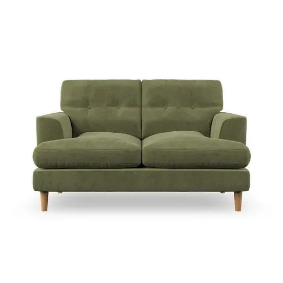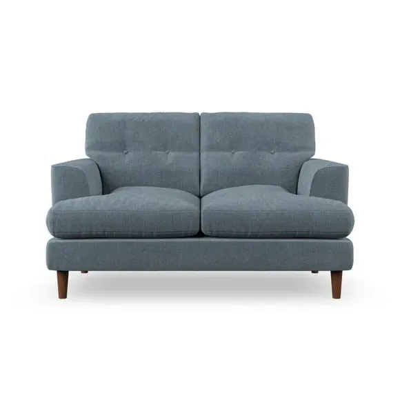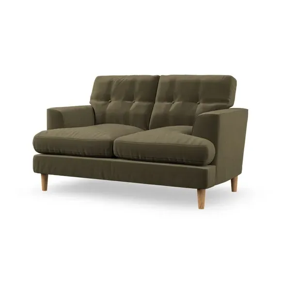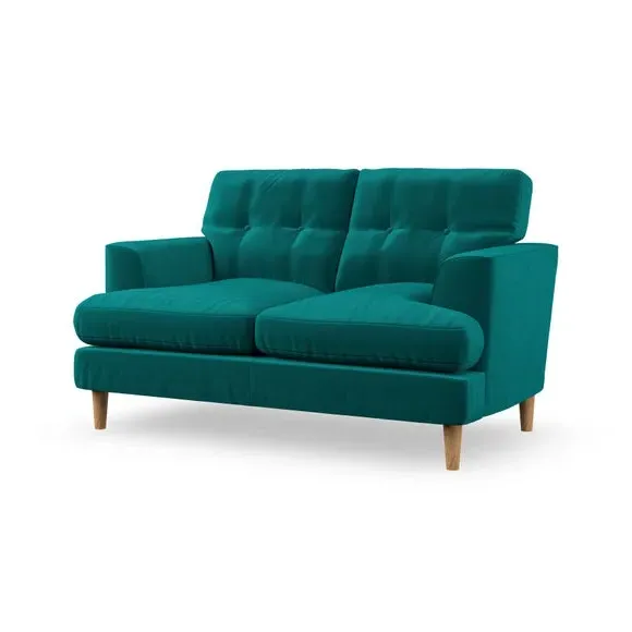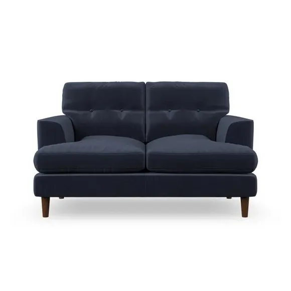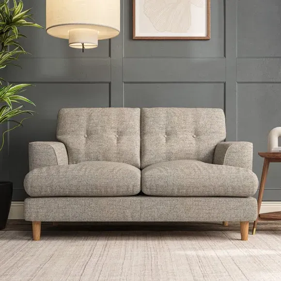 * Scandi inspired design* High legs* Button pull detailing* Choose the cushion filling, leg colour and fabric Compact yet sophisticated, the Cooper 2 Seater Sofa is perfect for smaller spaces or as a complementary piece in larger rooms. Drawing inspiration from Scandinavian furniture design, it features an elegant high-leg frame, clean lines, and generous T-shaped seat cushions. The fibre-filled back cushions, detailed with button pulls, deliver comfort and charm. Customise your sofa with a range of fabric types, leg finishes, and cushion fillings to make it uniquely yours.