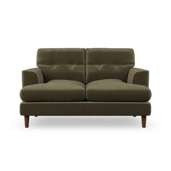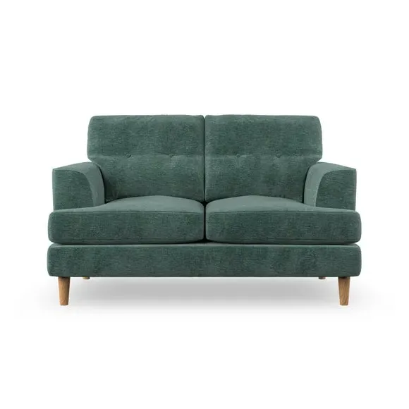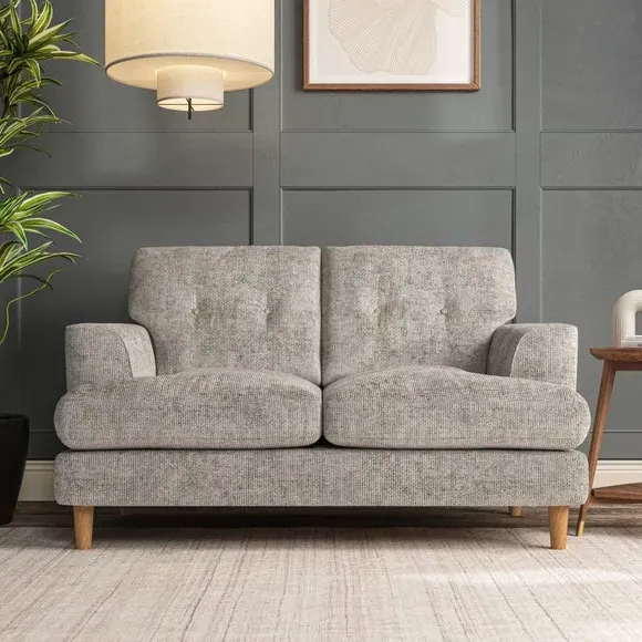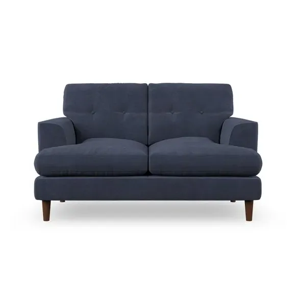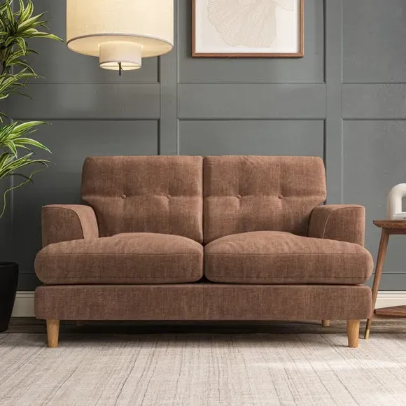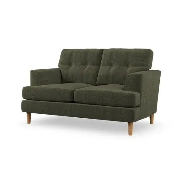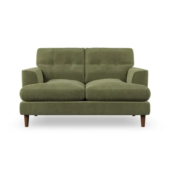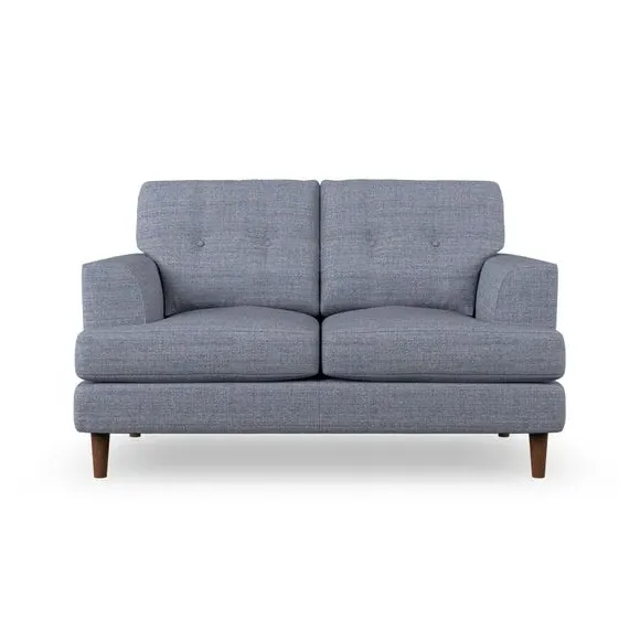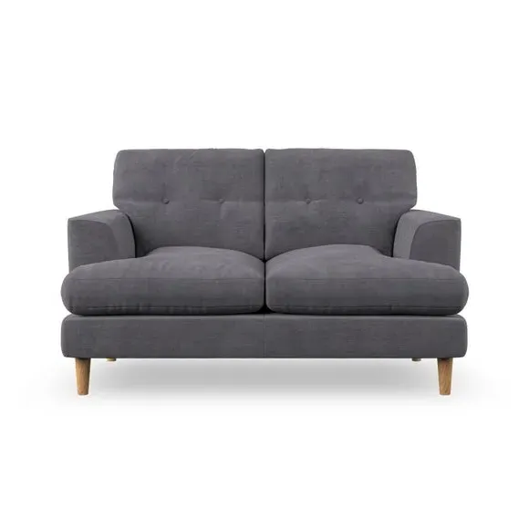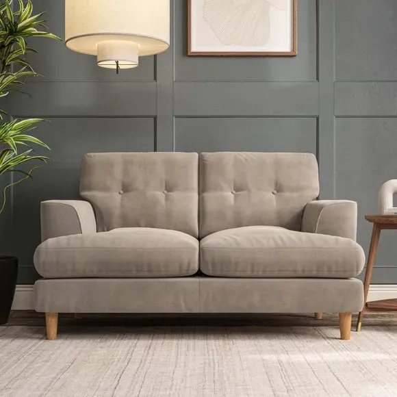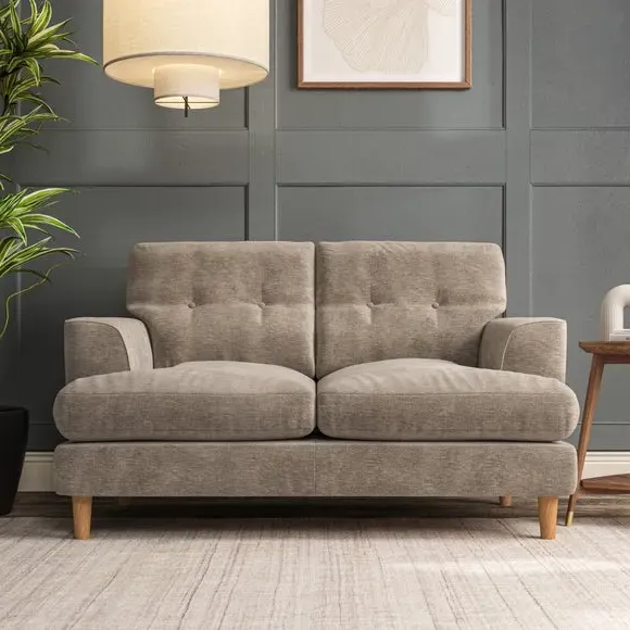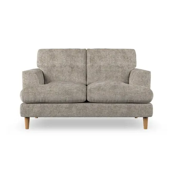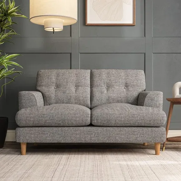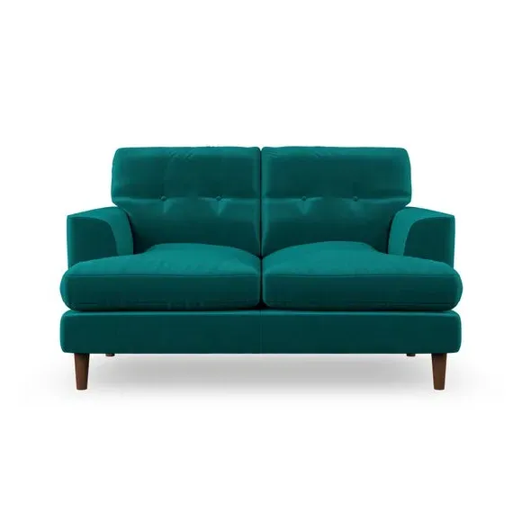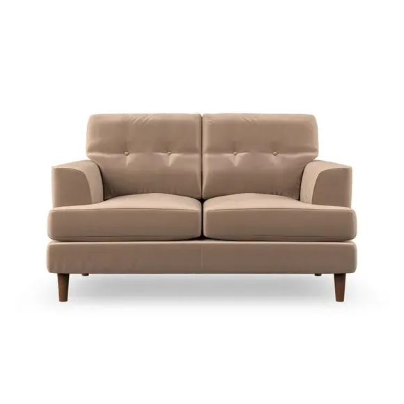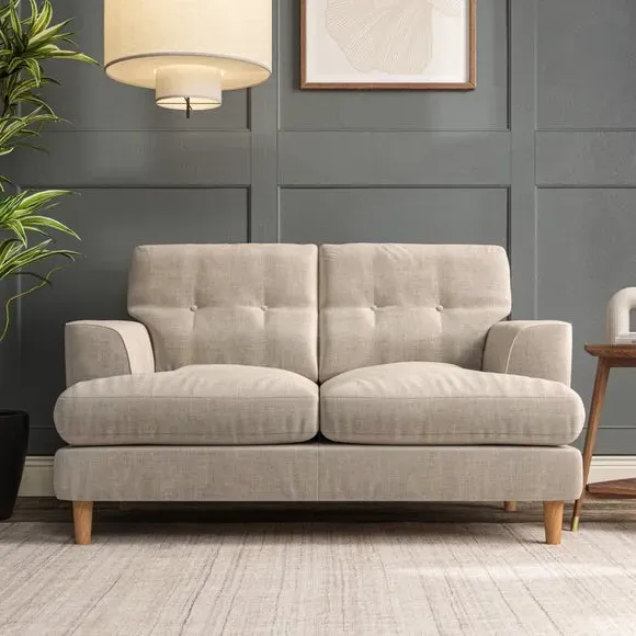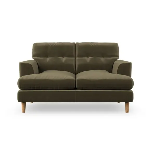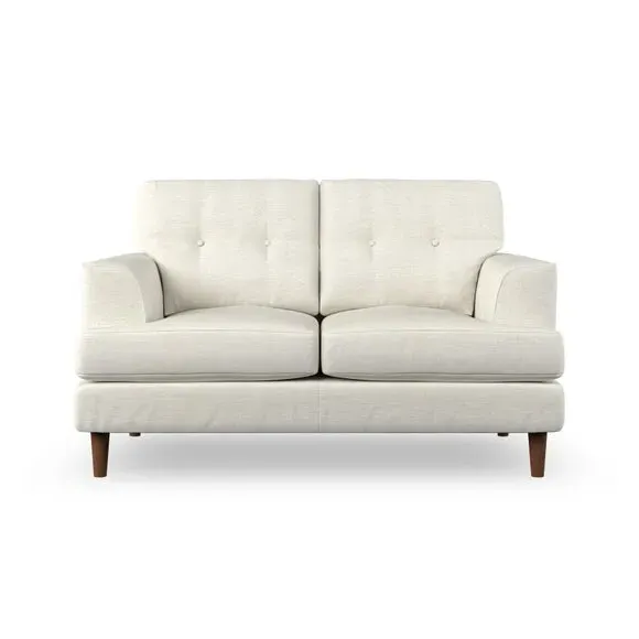 * Scandi inspired design* High legs* Button pull detailing* Choose the cushion filling, leg colour and fabric Compact yet sophisticated, the Cooper 2 Seater Sofa is perfect for smaller spaces or as a complementary piece in larger rooms. Drawing inspiration from Scandinavian furniture design, it features an elegant high-leg frame, clean lines, and generous T-shaped seat cushions. The fibre-filled back cushions, detailed with button pulls, deliver comfort and charm. Customise your sofa with a range of fabric types, leg finishes, and cushion fillings to make it uniquely yours.