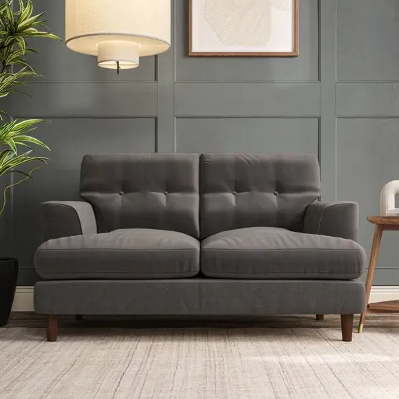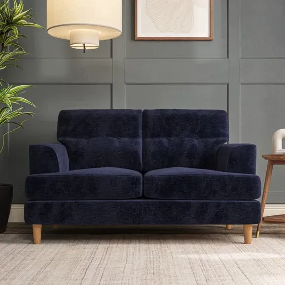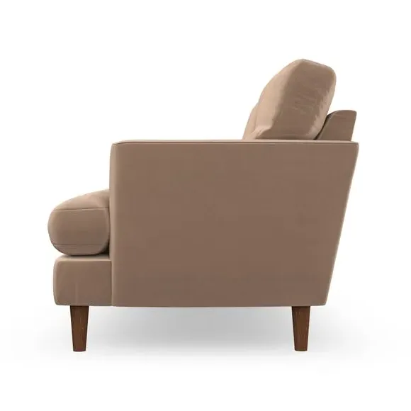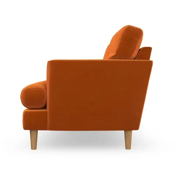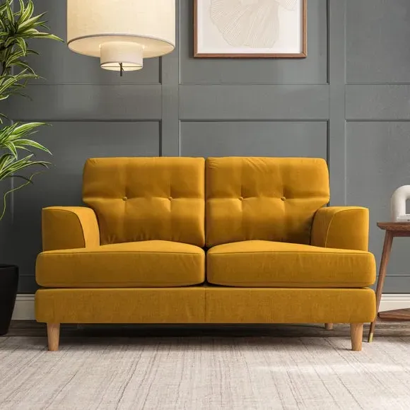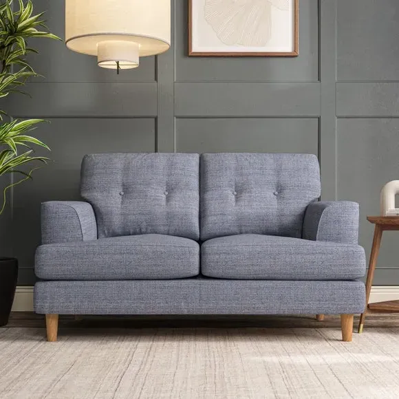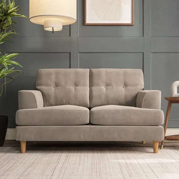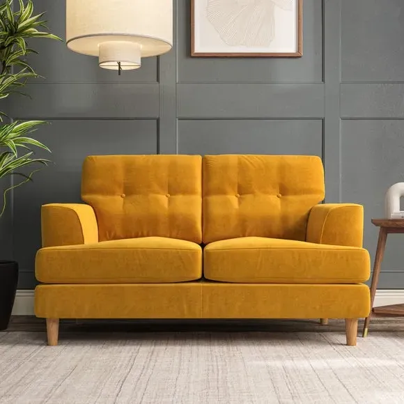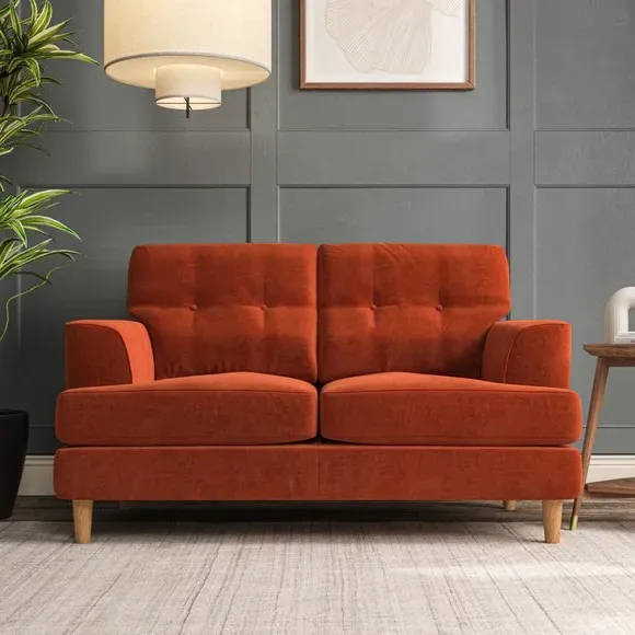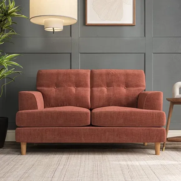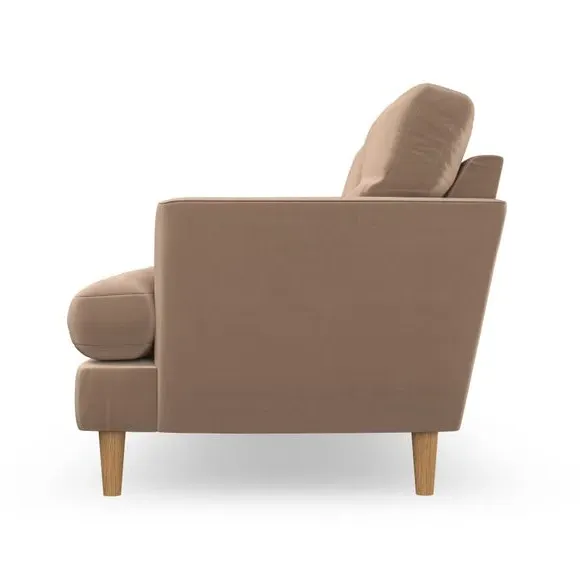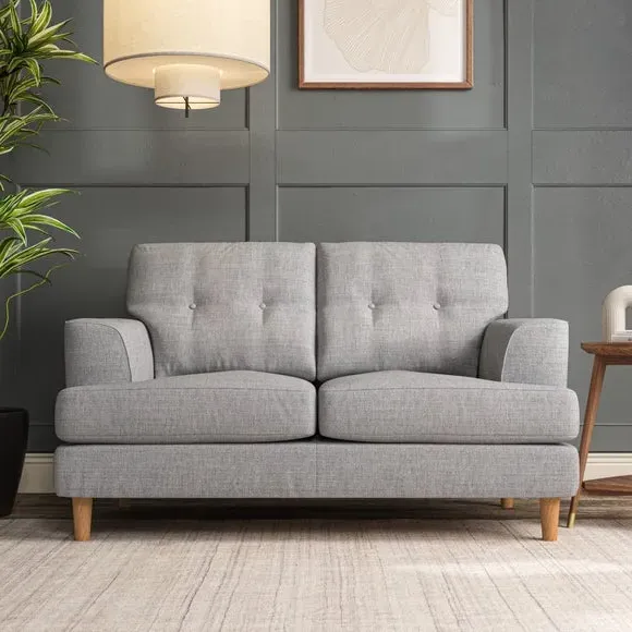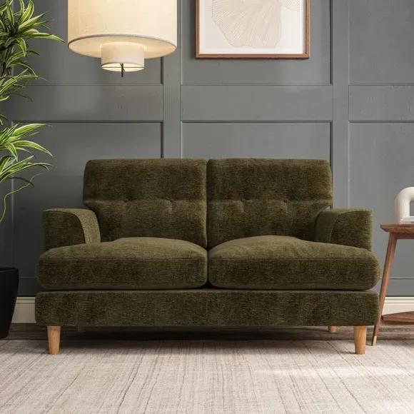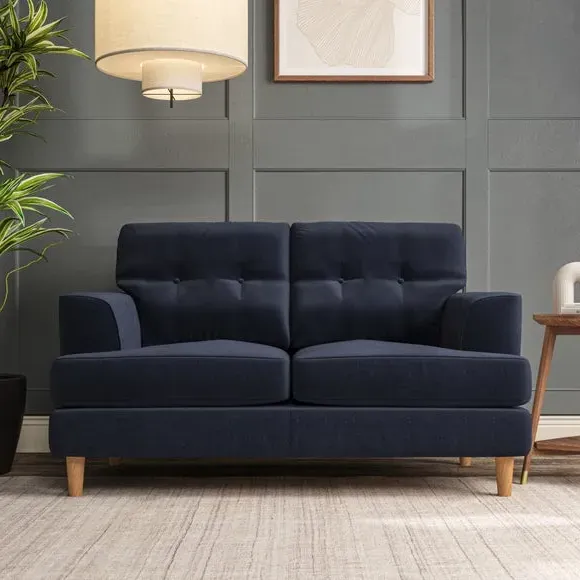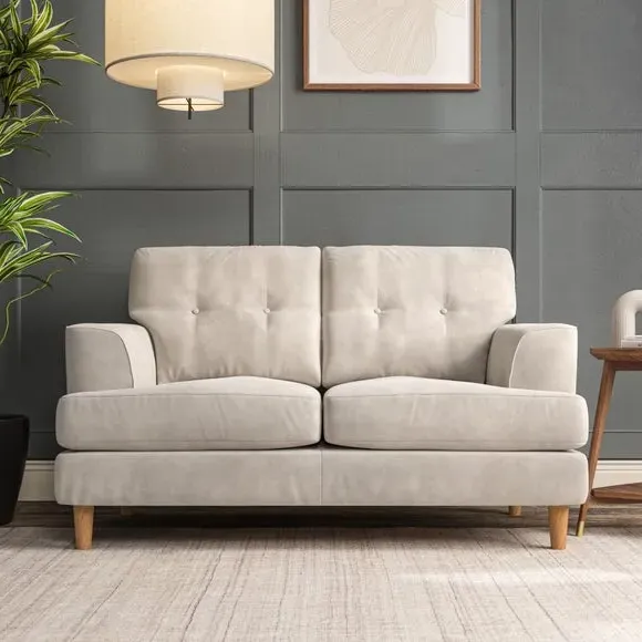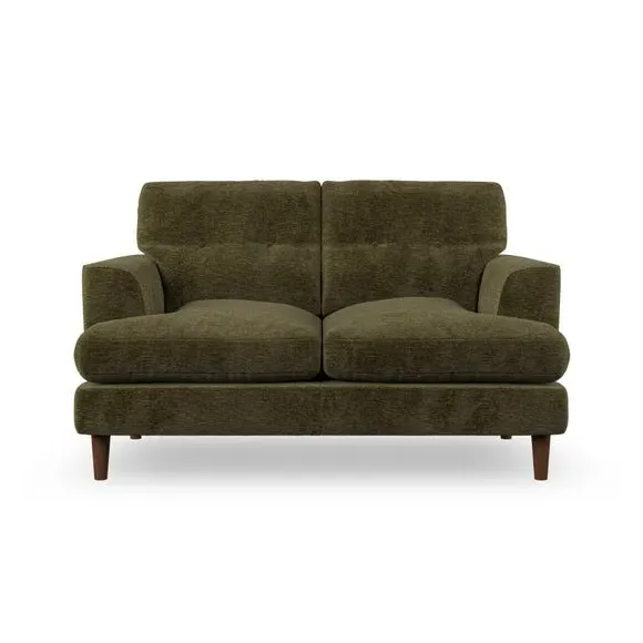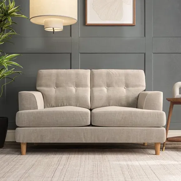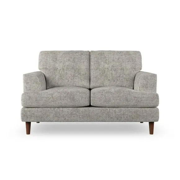 * Scandi inspired design* High legs* Button pull detailing* Choose the cushion filling, leg colour and fabric Compact yet sophisticated, the Cooper 2 Seater Sofa is perfect for smaller spaces or as a complementary piece in larger rooms. Drawing inspiration from Scandinavian furniture design, it features an elegant high-leg frame, clean lines, and generous T-shaped seat cushions. The fibre-filled back cushions, detailed with button pulls, deliver comfort and charm. Customise your sofa with a range of fabric types, leg finishes, and cushion fillings to make it uniquely yours.