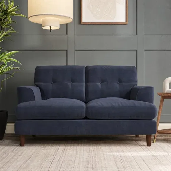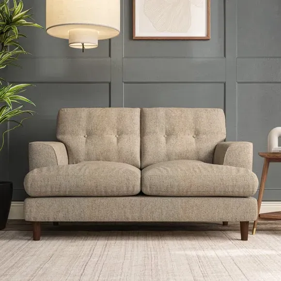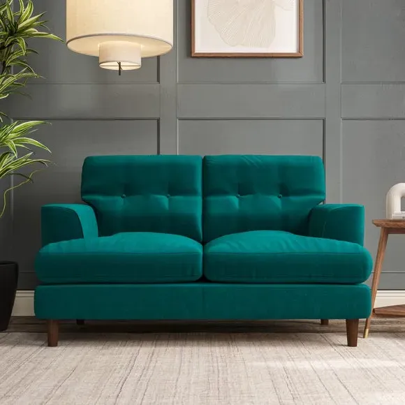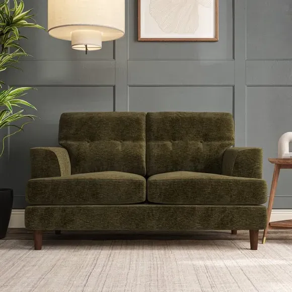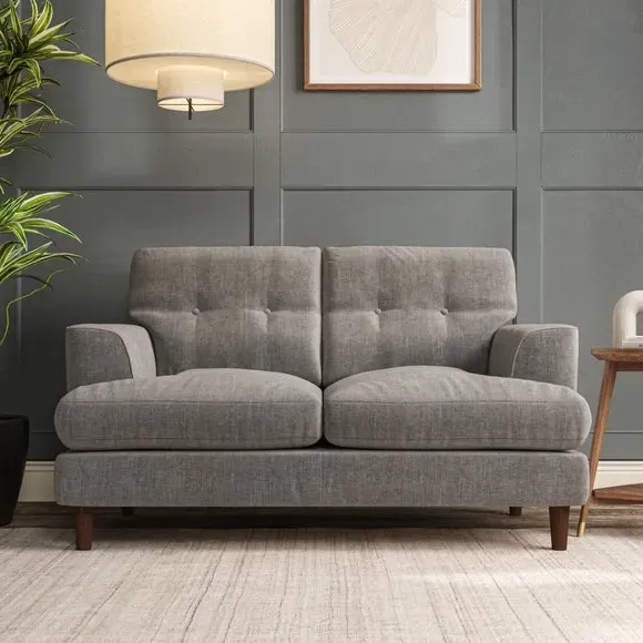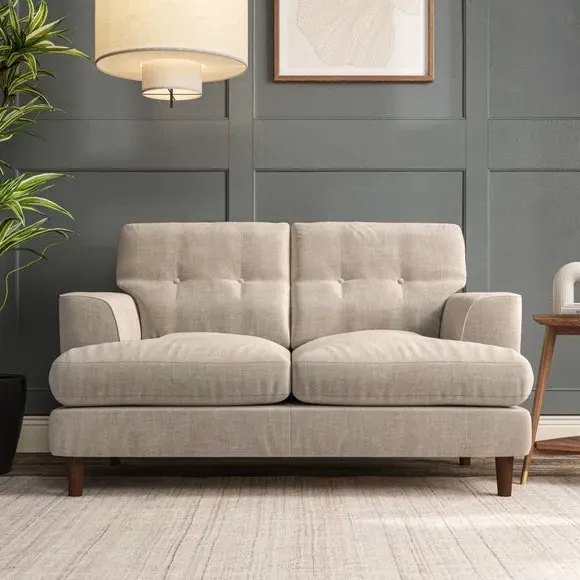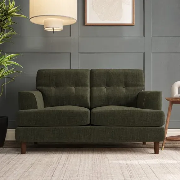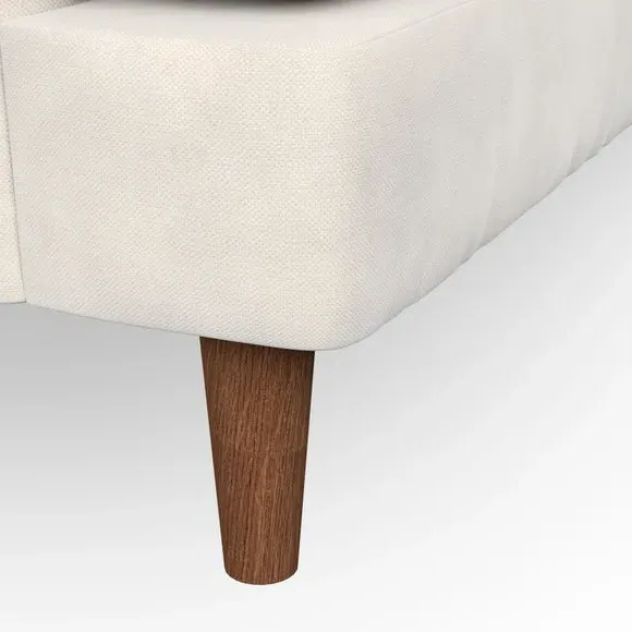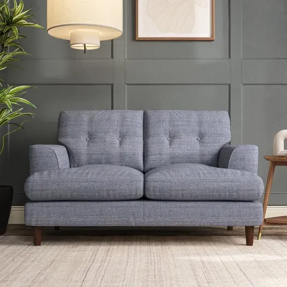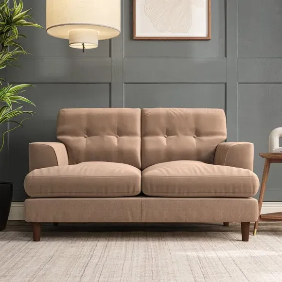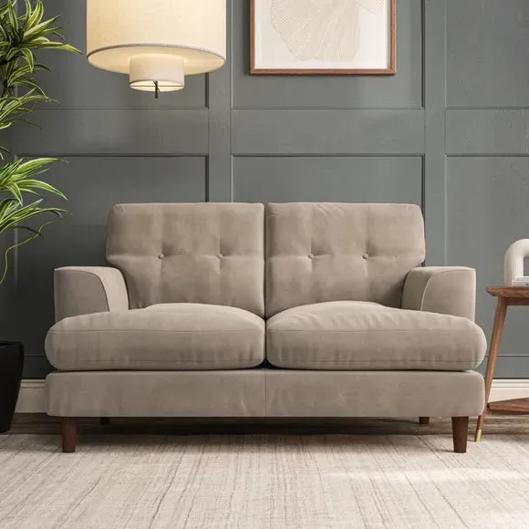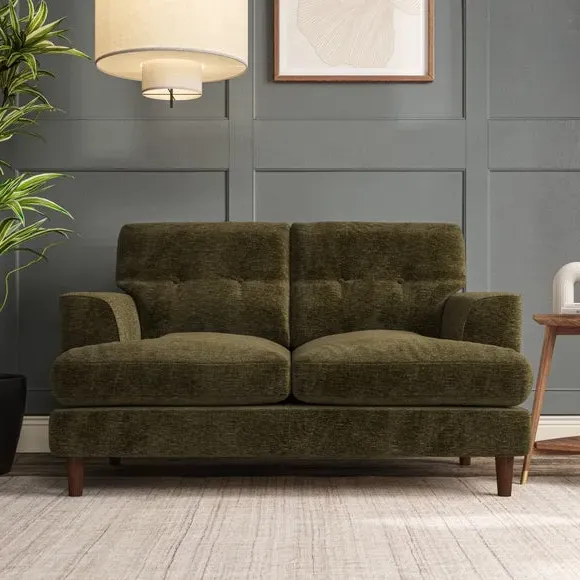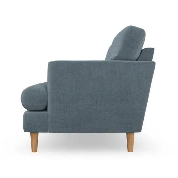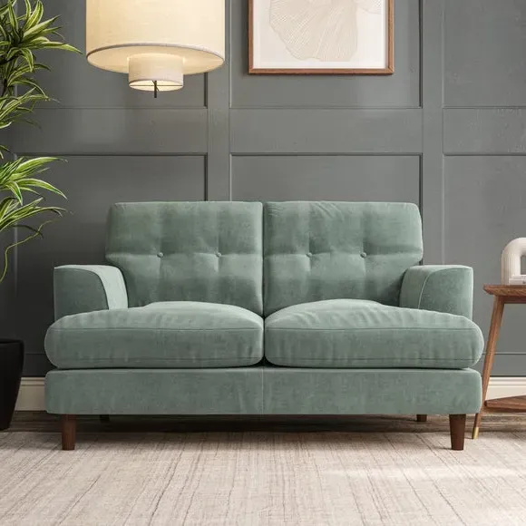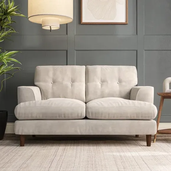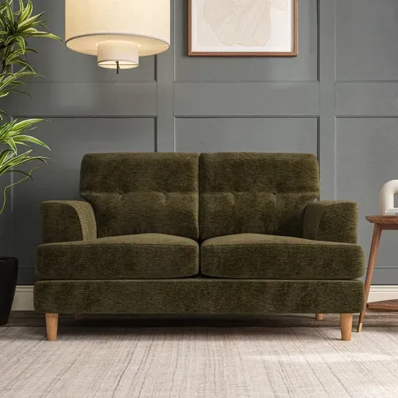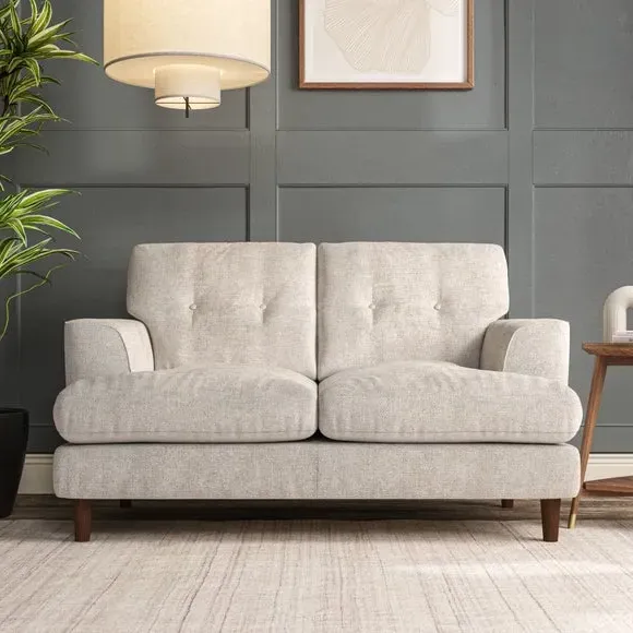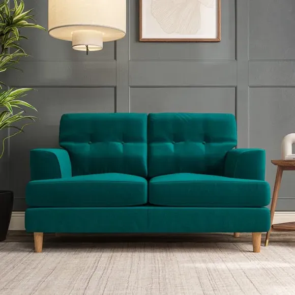 * Scandi inspired design* High legs* Button pull detailing* Choose the cushion filling, leg colour and fabric Compact yet sophisticated, the Cooper 2 Seater Sofa is perfect for smaller spaces or as a complementary piece in larger rooms. Drawing inspiration from Scandinavian furniture design, it features an elegant high-leg frame, clean lines, and generous T-shaped seat cushions. The fibre-filled back cushions, detailed with button pulls, deliver comfort and charm. Customise your sofa with a range of fabric types, leg finishes, and cushion fillings to make it uniquely yours.