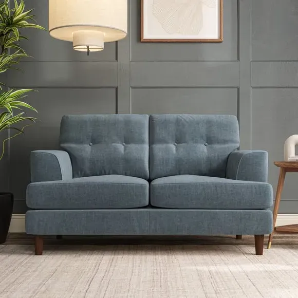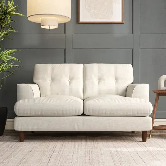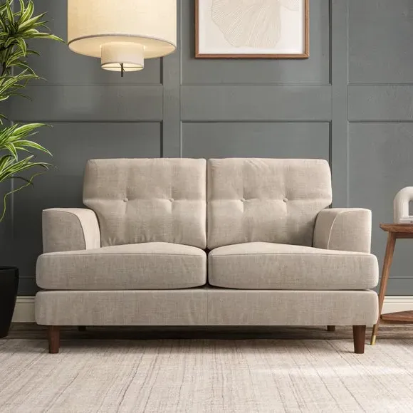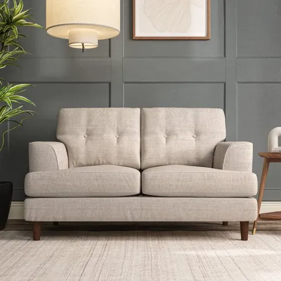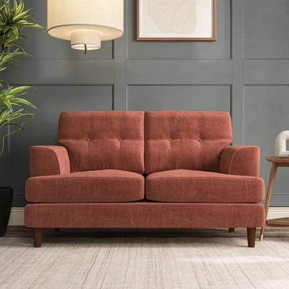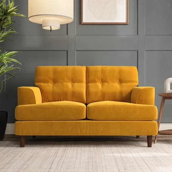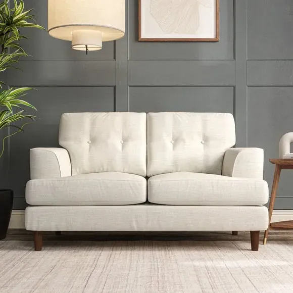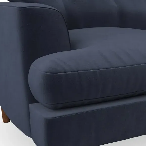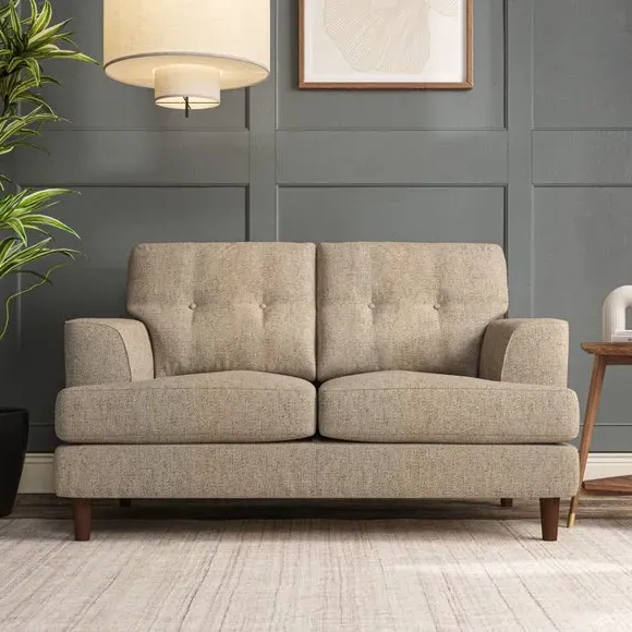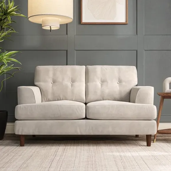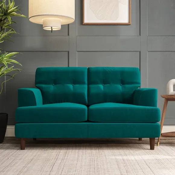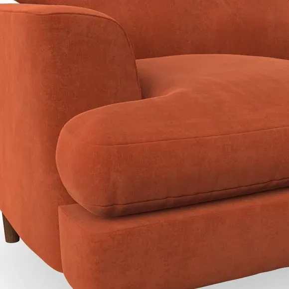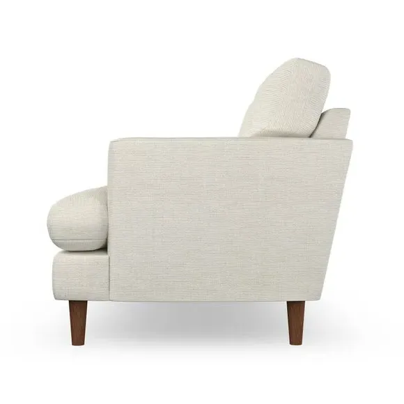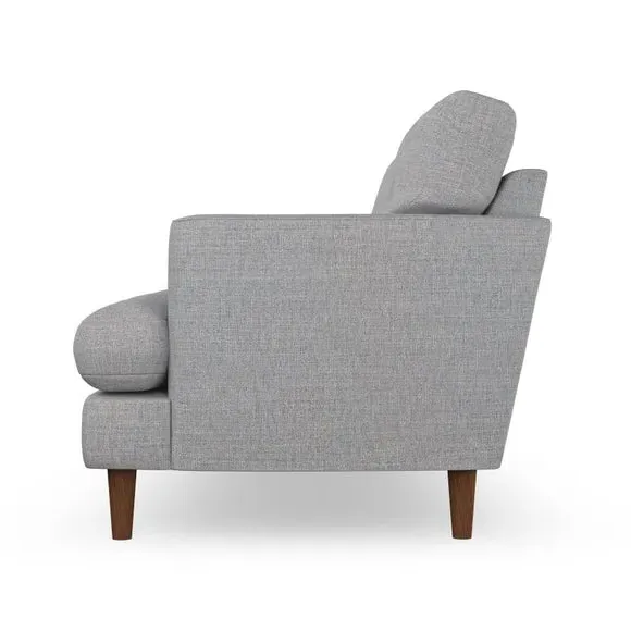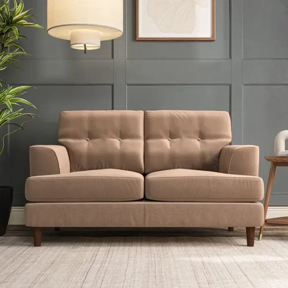The 2-seater sofa combines Scandinavian-inspired design with customizable comfort options. Its high-leg frame features clean lines and generous T-shaped seat cushions, while the fibre-filled back cushions include distinctive button pull detailing. The elevated legs add visual lightness to the compact frame, and the customizable fabric and filling options allow for personalized comfort.