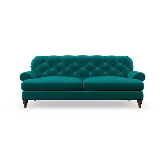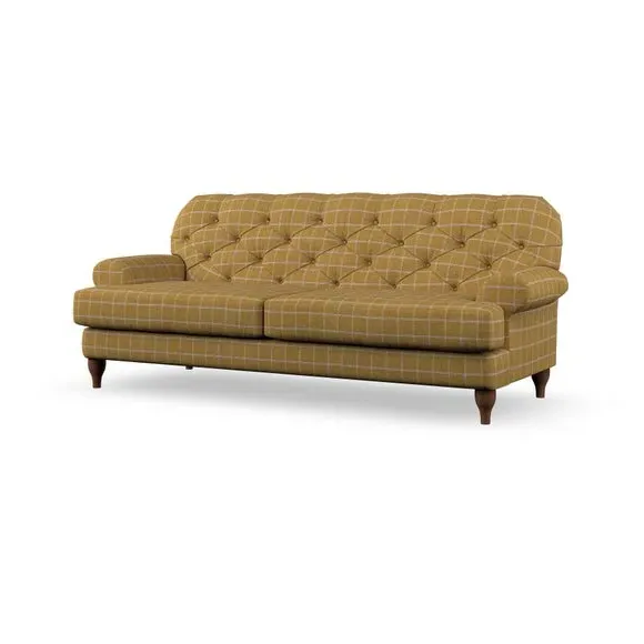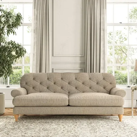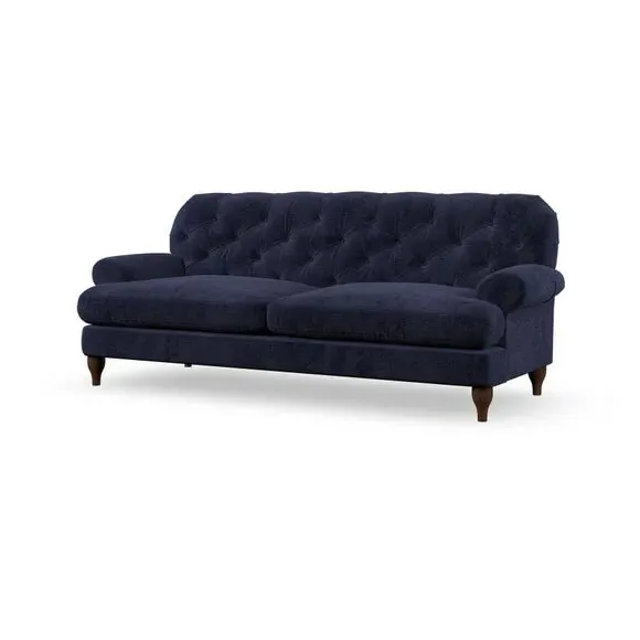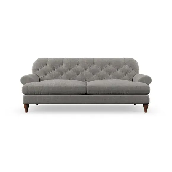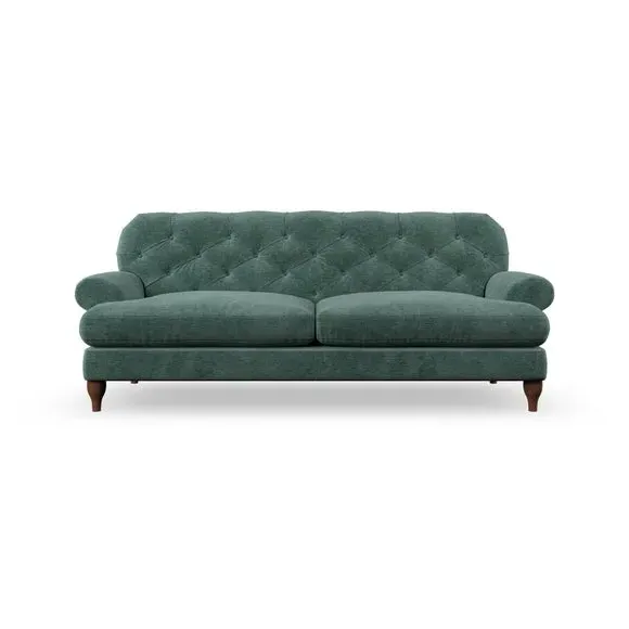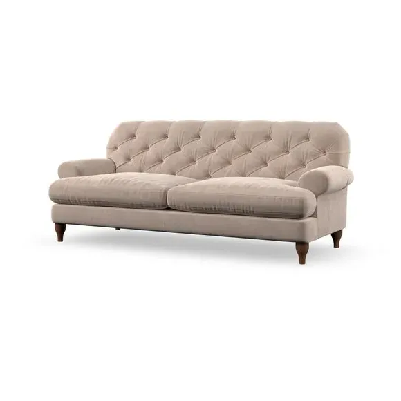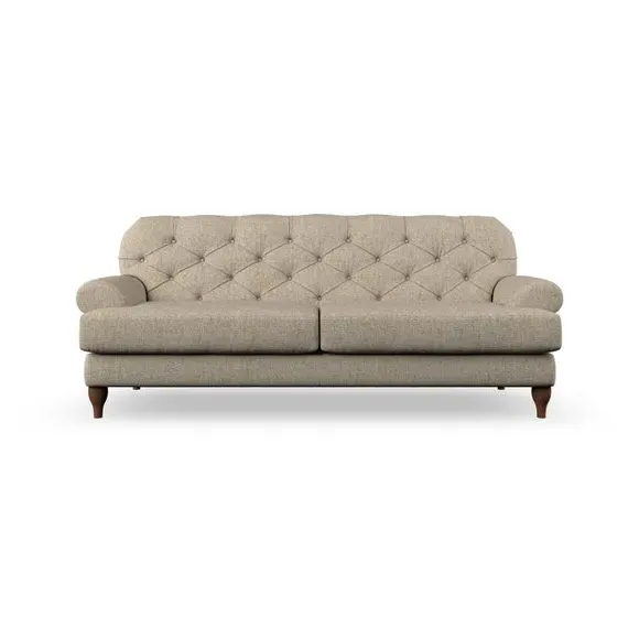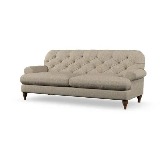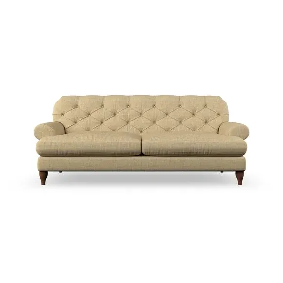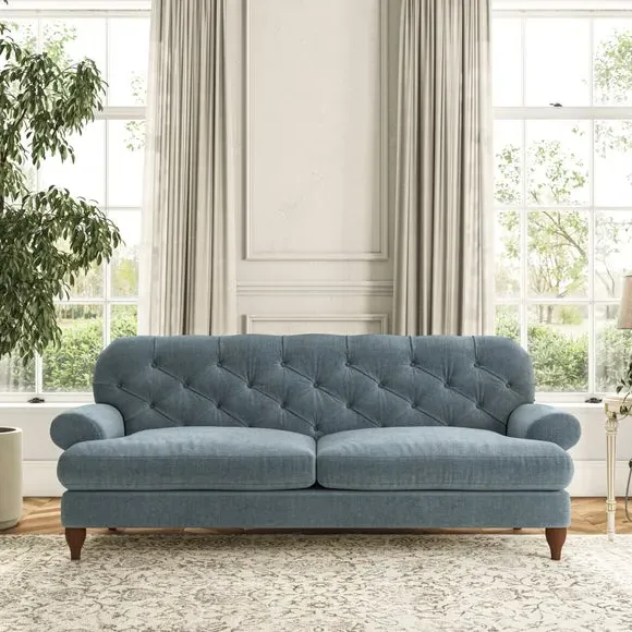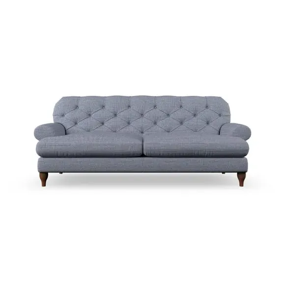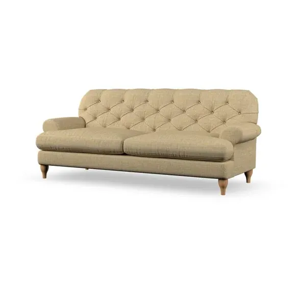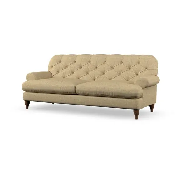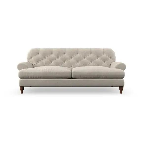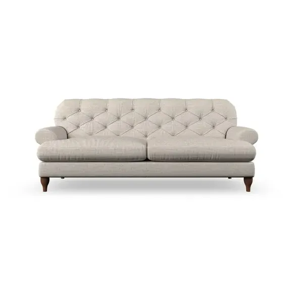 * Chesterfield style* Deep button detail* Scroll arms* Serpentine seat springs* Choose your support, fabric and leg colour This sofa boasts a high, supportive back and elegant compact scroll arms, providing both style and comfort. The serpentine seat springs and superloop sprung back ensure lasting durability and support. Choose between a low-maintenance foam seat or the inviting ‘Qualofill Blue’ fibre seat, crafted from 100% recycled polyester. The ‘T’ cushion seat and arm design offer a compact and contemporary look, enhanced by self-sewn seat cushions. This sofa also features ‘hour glass’ shaped turned hardwood legs in two finishes, which are easy to fit. Made to order, this sofa can be tailored to your exact preferences, offering a wide selection of colours, fabrics, foot types, and fillings for a truly personalised and comfortable piece.