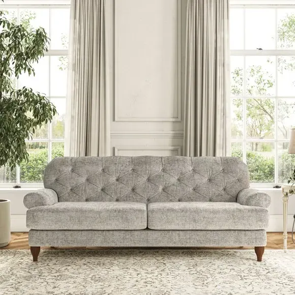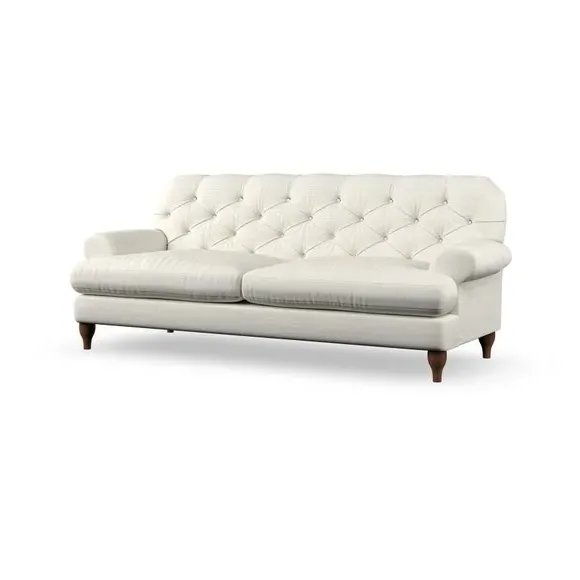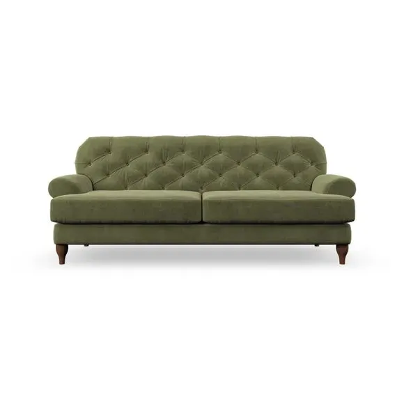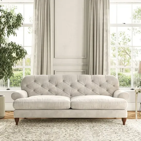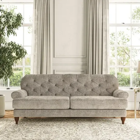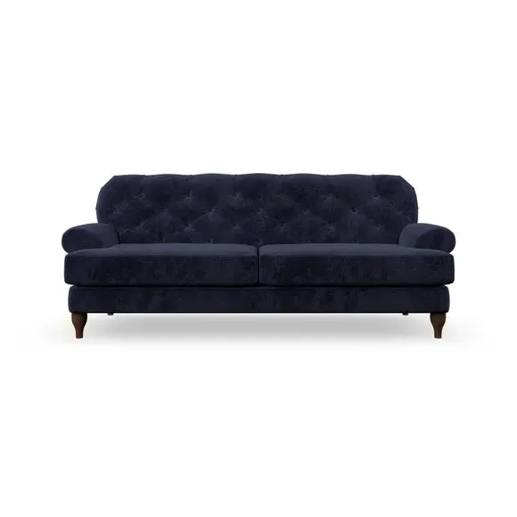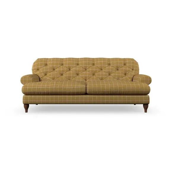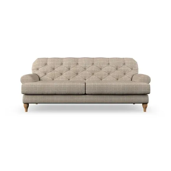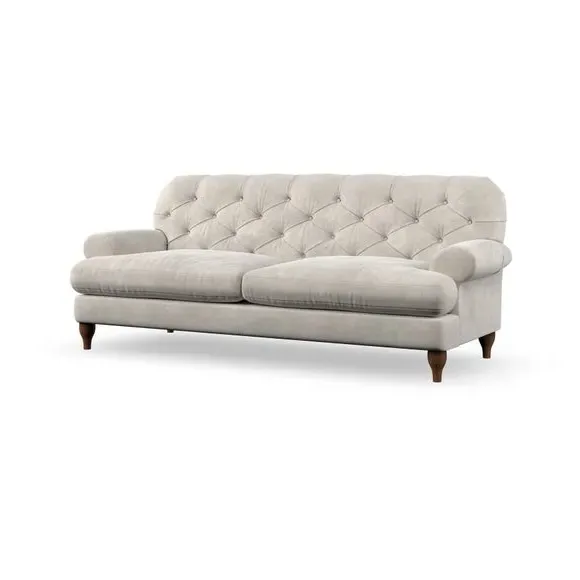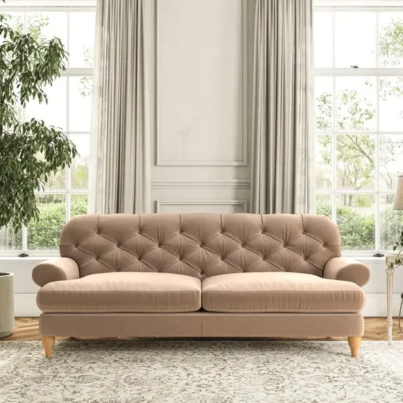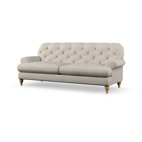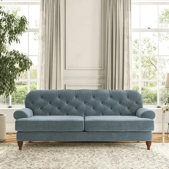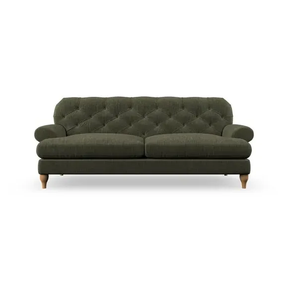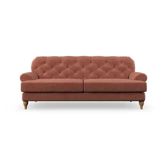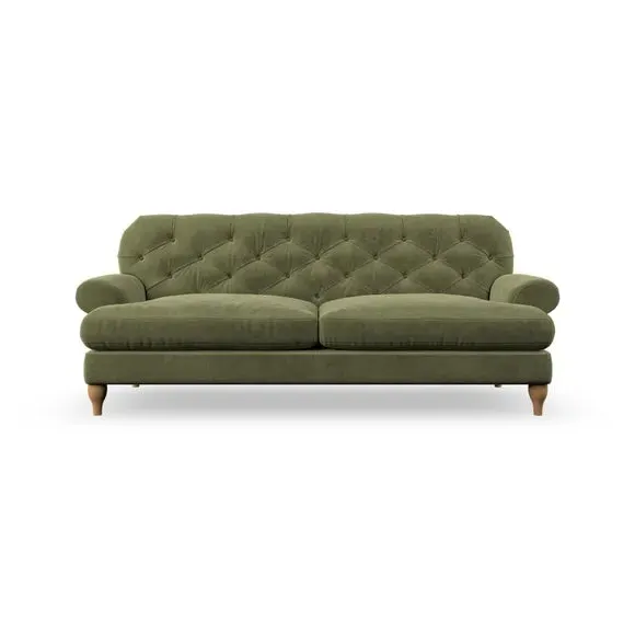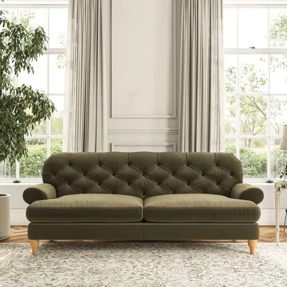 * Chesterfield style* Deep button detail* Scroll arms* Serpentine seat springs* Choose your support, fabric and leg colour This sofa boasts a high, supportive back and elegant compact scroll arms, providing both style and comfort. The serpentine seat springs and superloop sprung back ensure lasting durability and support. Choose between a low-maintenance foam seat or the inviting ‘Qualofill Blue’ fibre seat, crafted from 100% recycled polyester. The ‘T’ cushion seat and arm design offer a compact and contemporary look, enhanced by self-sewn seat cushions. This sofa also features ‘hour glass’ shaped turned hardwood legs in two finishes, which are easy to fit. Made to order, this sofa can be tailored to your exact preferences, offering a wide selection of colours, fabrics, foot types, and fillings for a truly personalised and comfortable piece.