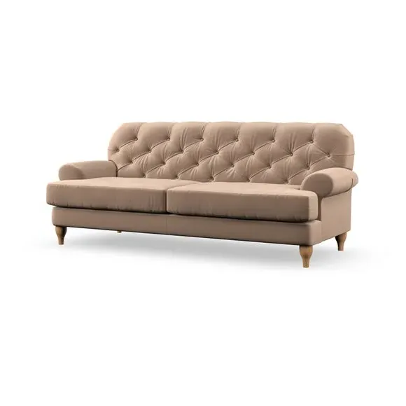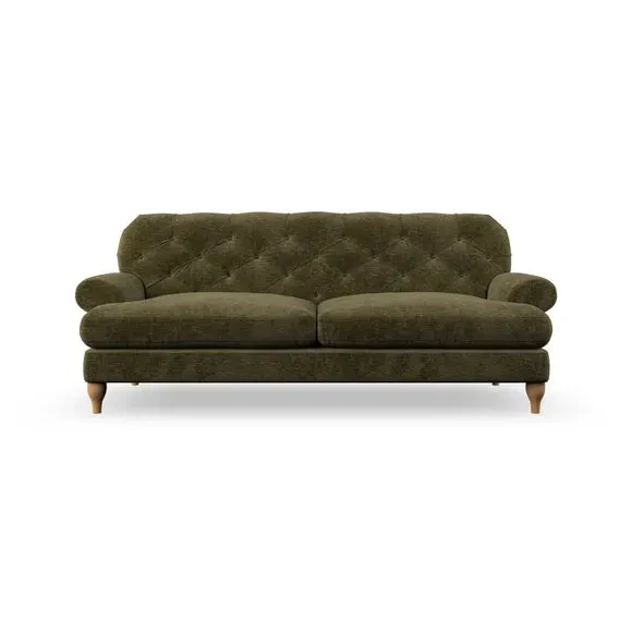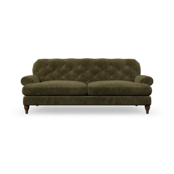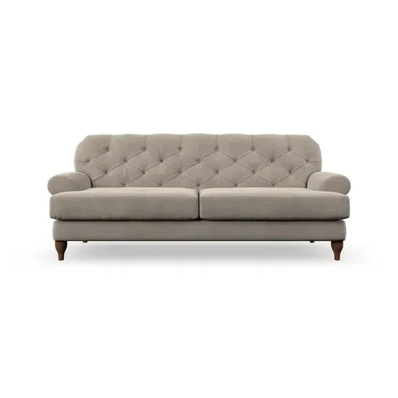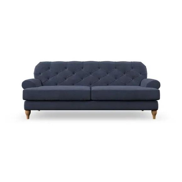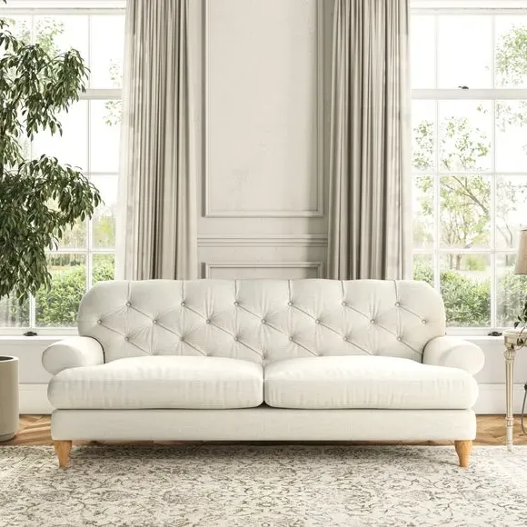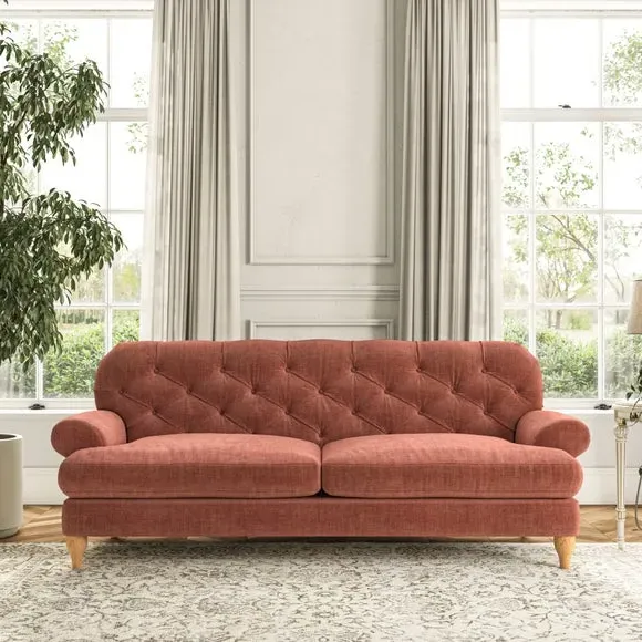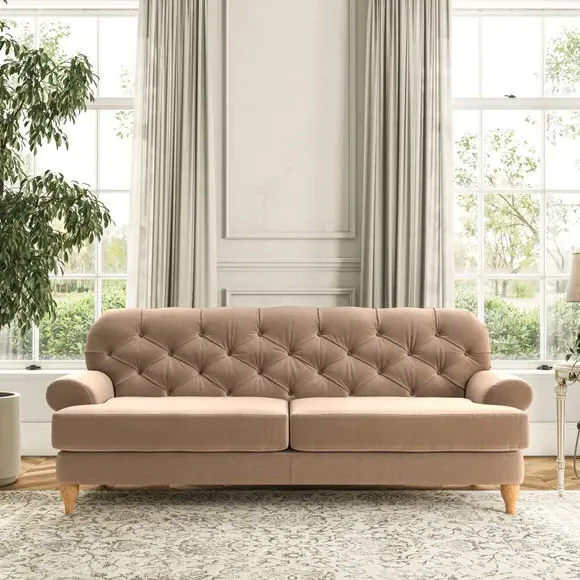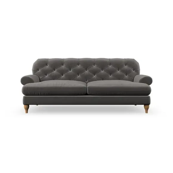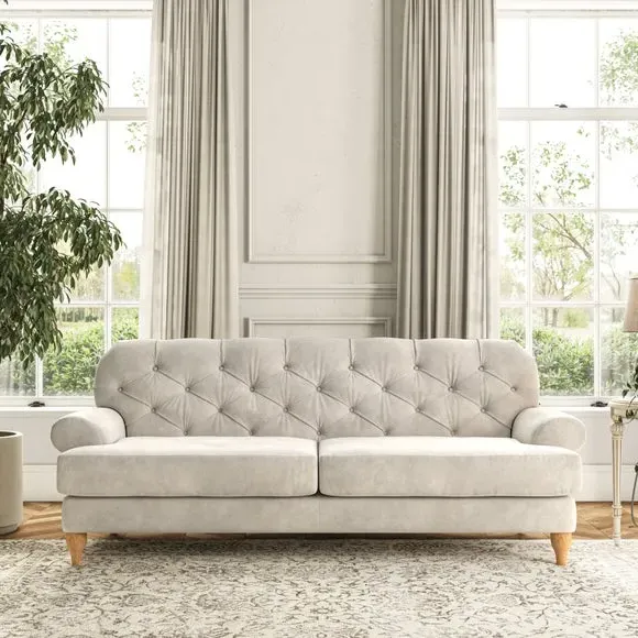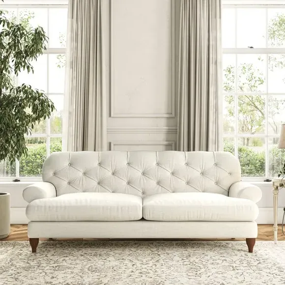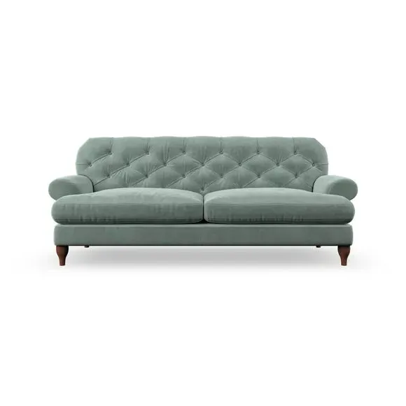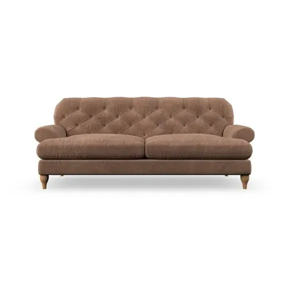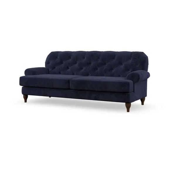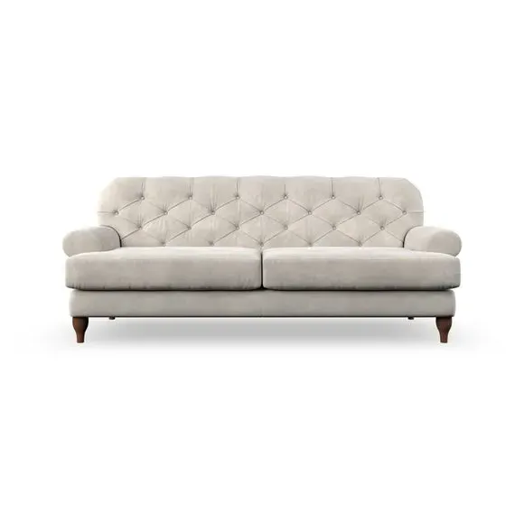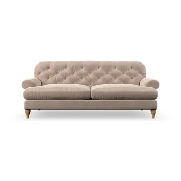 * Chesterfield style* Deep button detail* Scroll arms* Serpentine seat springs* Choose your support, fabric and leg colour This sofa boasts a high, supportive back and elegant compact scroll arms, providing both style and comfort. The serpentine seat springs and superloop sprung back ensure lasting durability and support. Choose between a low-maintenance foam seat or the inviting ‘Qualofill Blue’ fibre seat, crafted from 100% recycled polyester. The ‘T’ cushion seat and arm design offer a compact and contemporary look, enhanced by self-sewn seat cushions. This sofa also features ‘hour glass’ shaped turned hardwood legs in two finishes, which are easy to fit. Made to order, this sofa can be tailored to your exact preferences, offering a wide selection of colours, fabrics, foot types, and fillings for a truly personalised and comfortable piece.