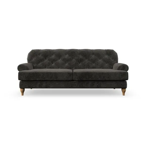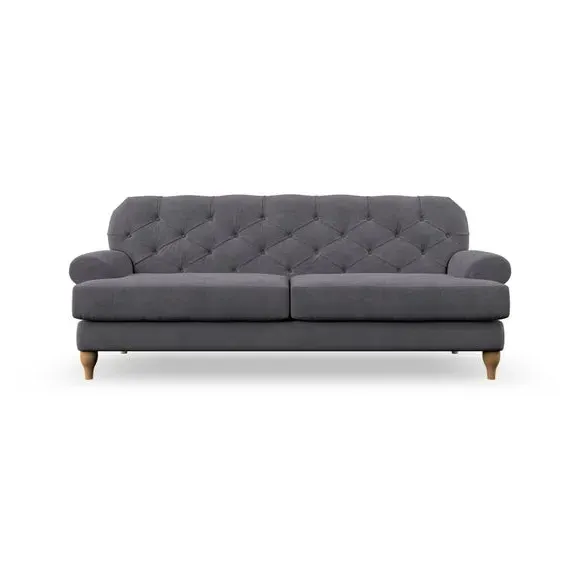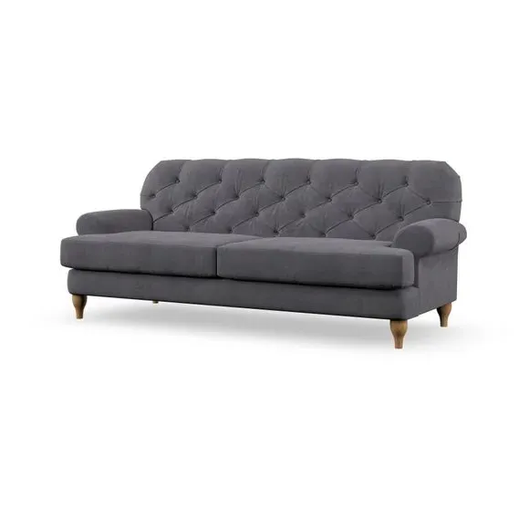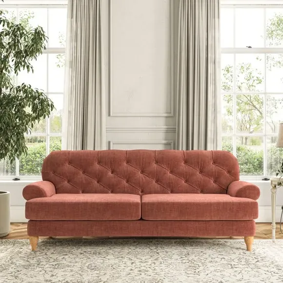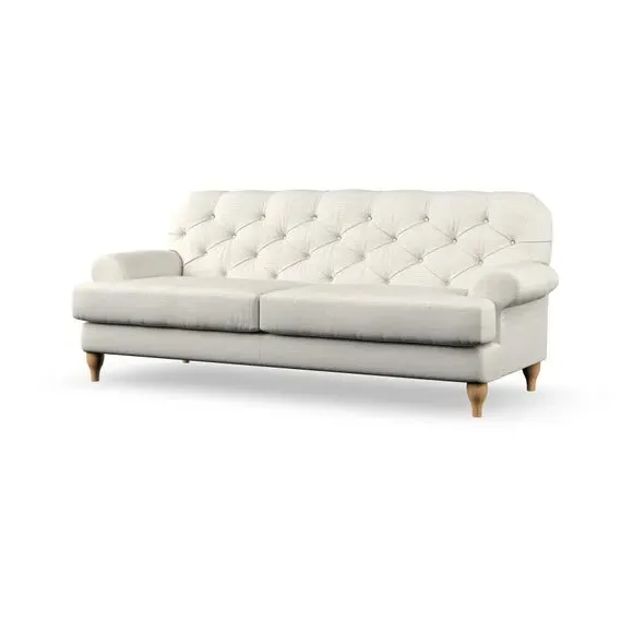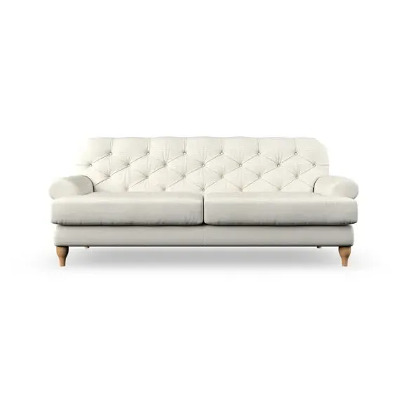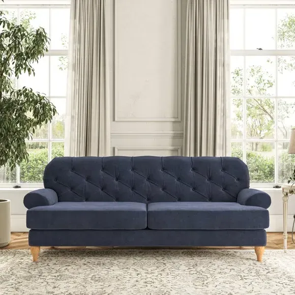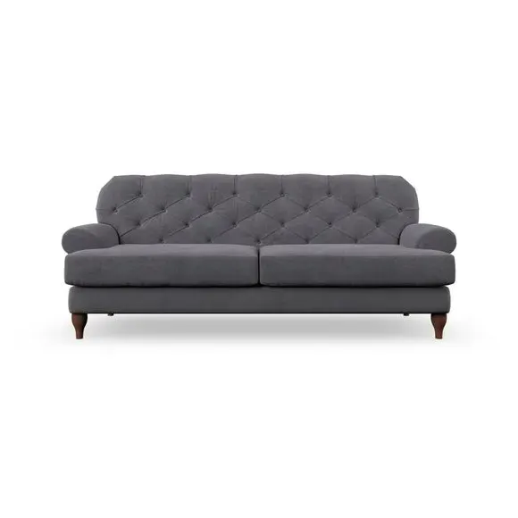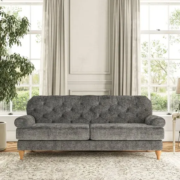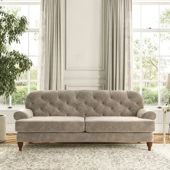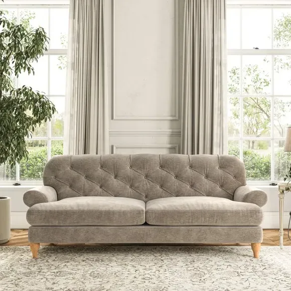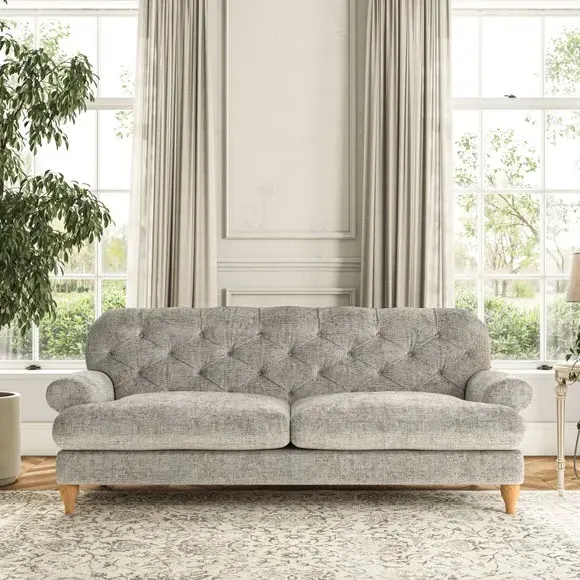 The 3-seater sofa combines classic Chesterfield styling with deep button detailing and elegant scroll arms. Its serpentine seat springs and superloop sprung back provide lasting durability and support, while the high supportive back ensures comfort. The T-cushion design features self-sewn seat cushions with choice of foam or recycled polyester fibre filling. Hour glass shaped turned hardwood legs complete the design with easy-fit installation.