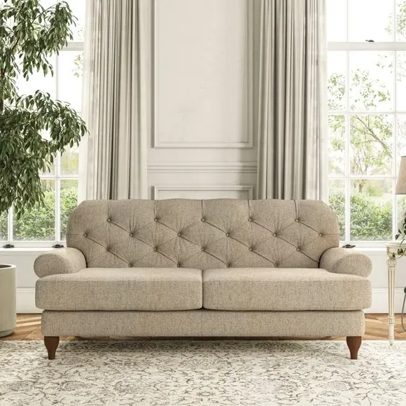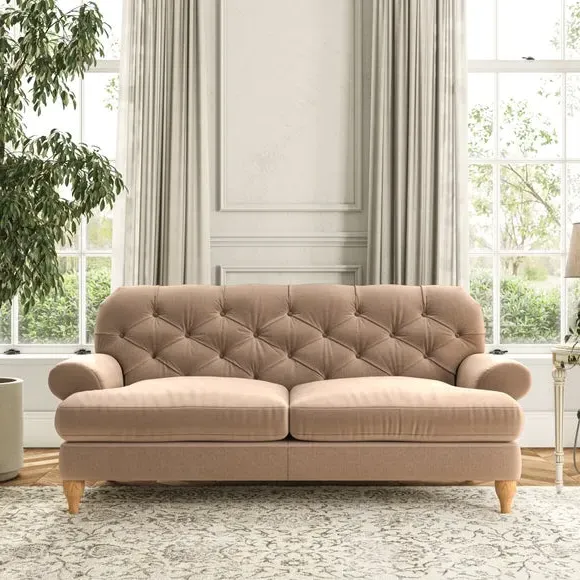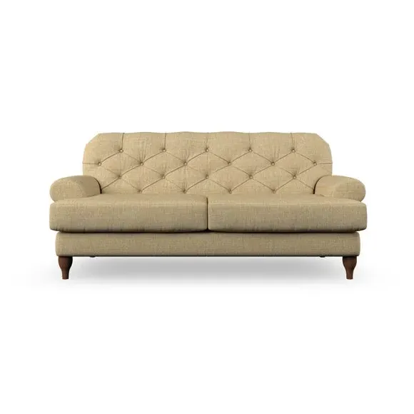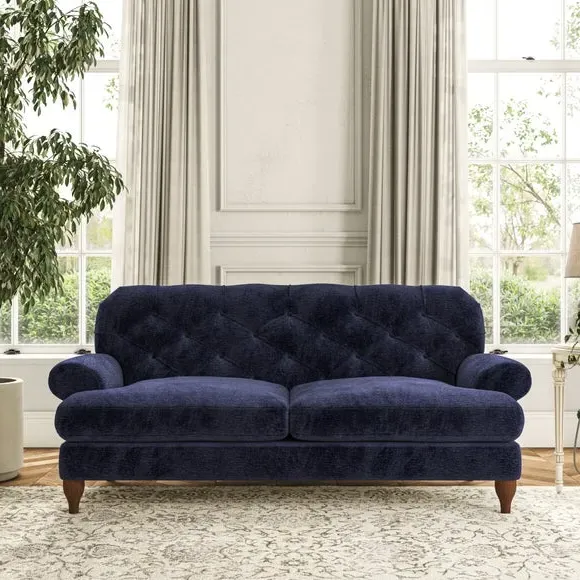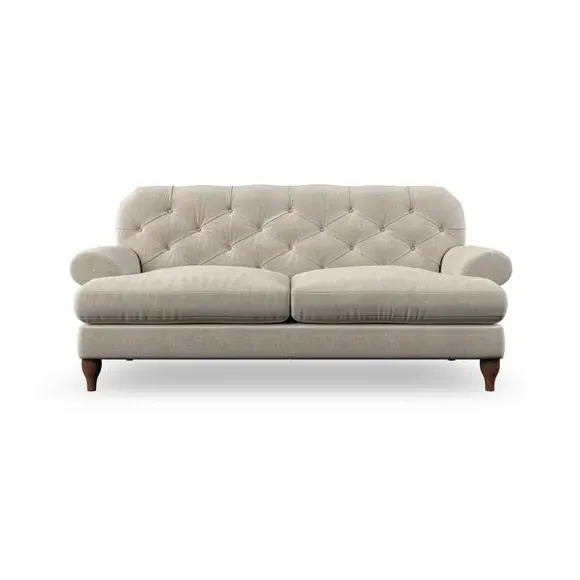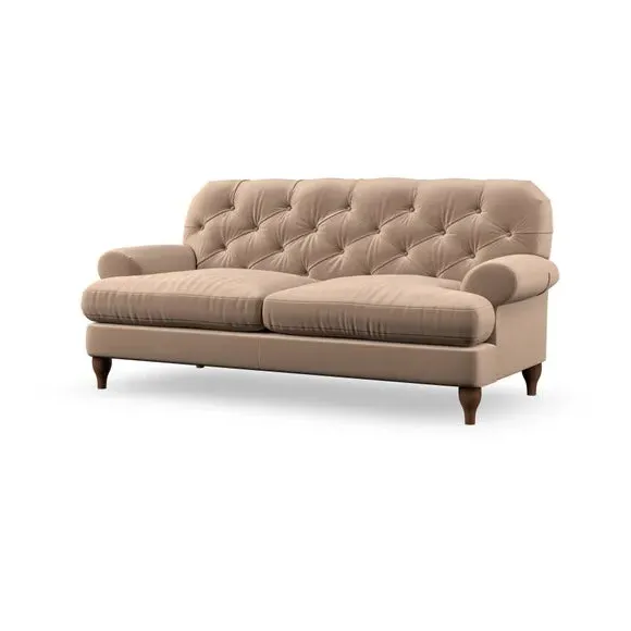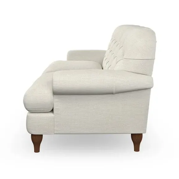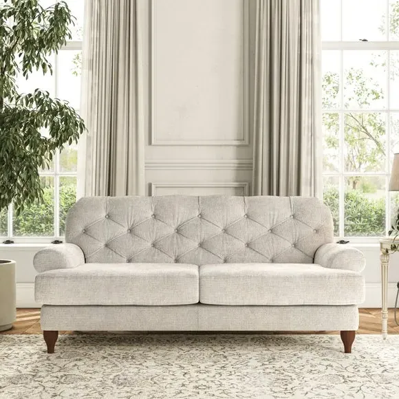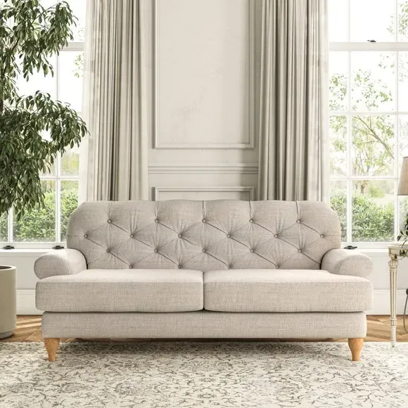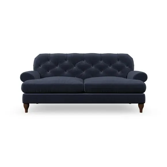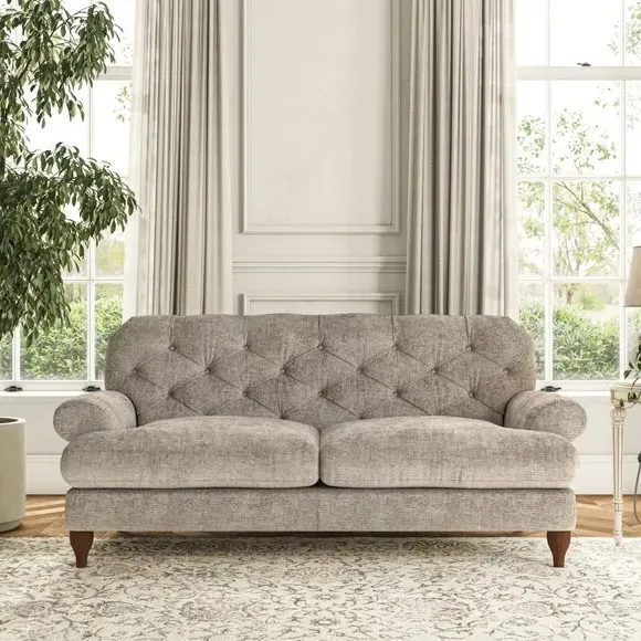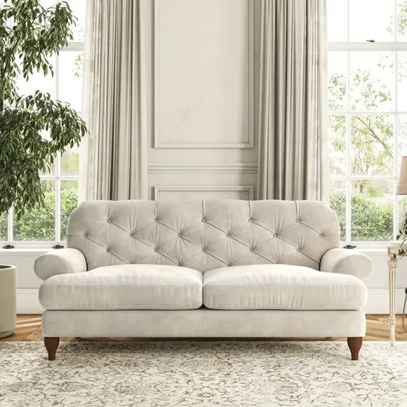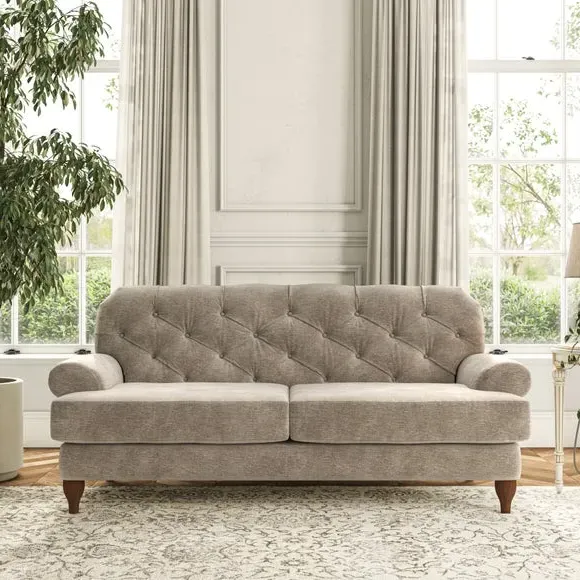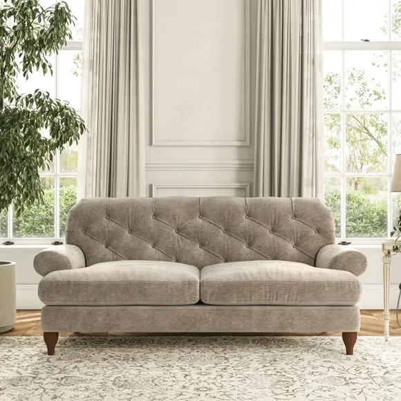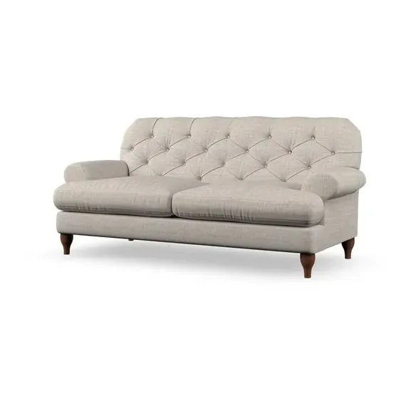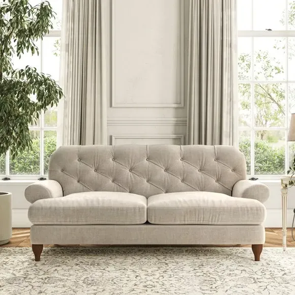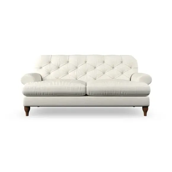The 3-seater sofa combines classic Chesterfield styling with deep button detailing and elegant scroll arms. Its serpentine seat springs and superloop sprung back provide lasting durability and support, while the high supportive back ensures comfort. The T-cushion design offers a compact contemporary look with self-sewn seat cushions, and the hourglass-shaped turned hardwood legs add stability and style.