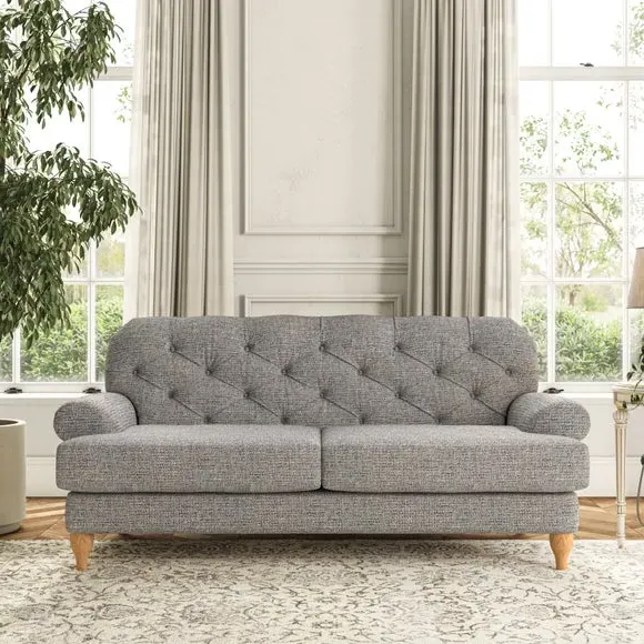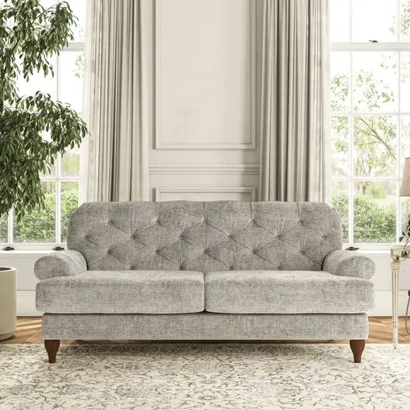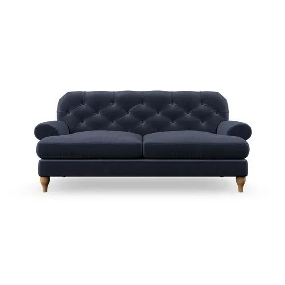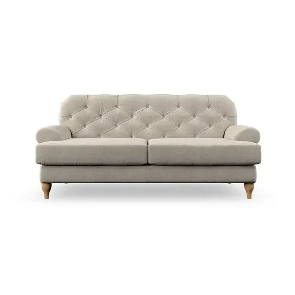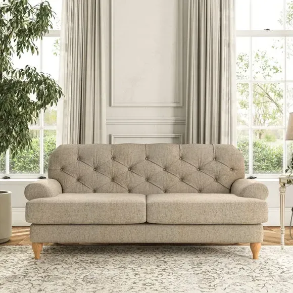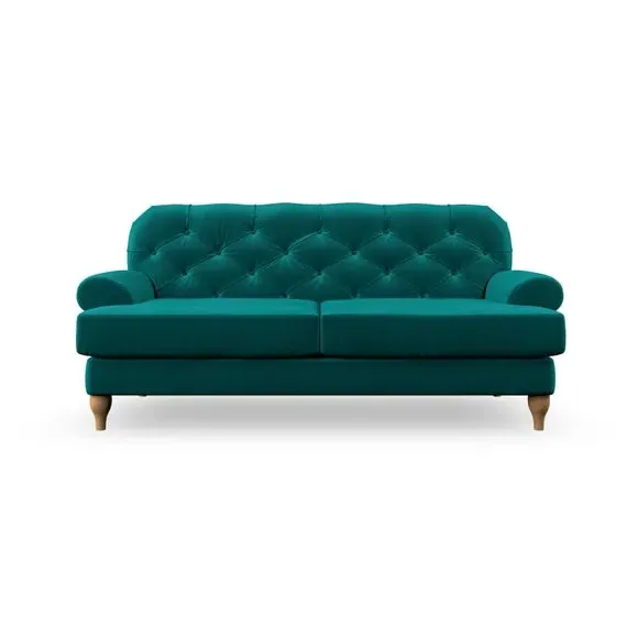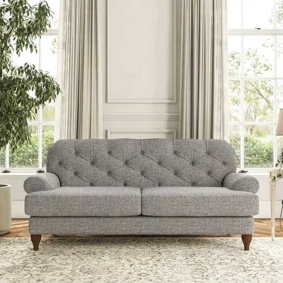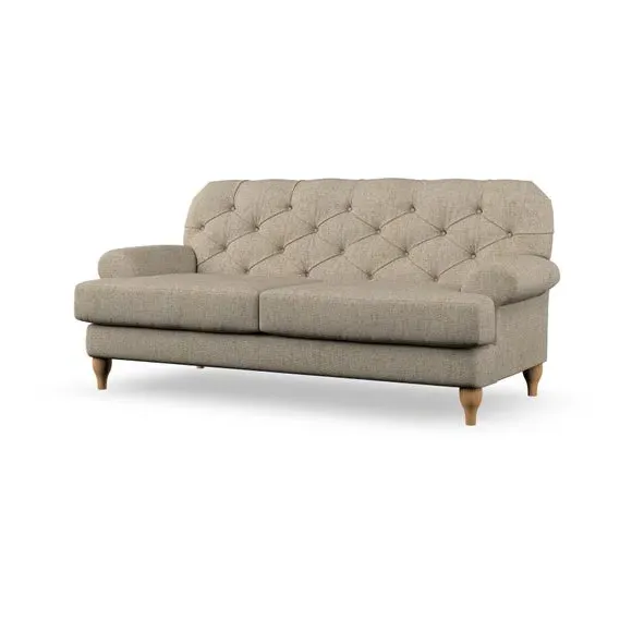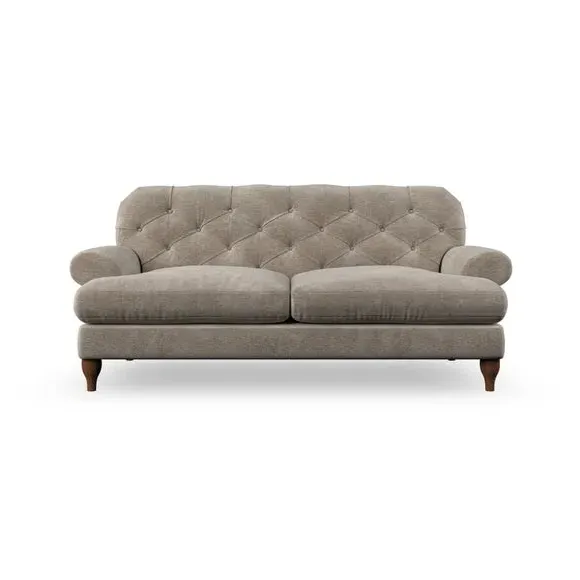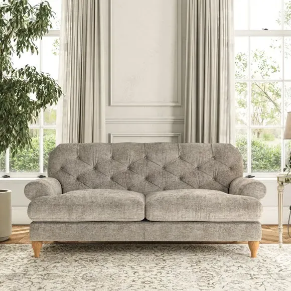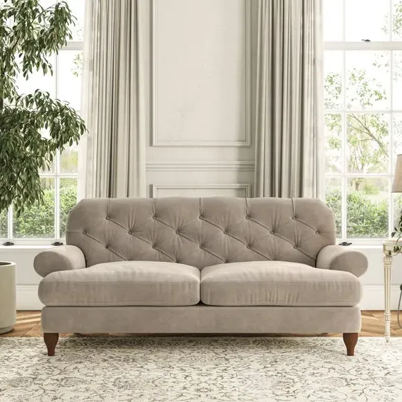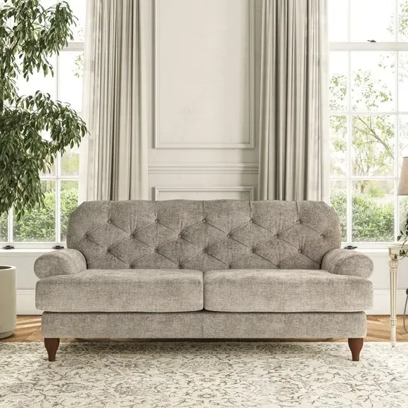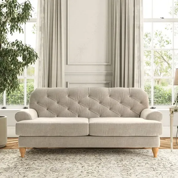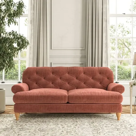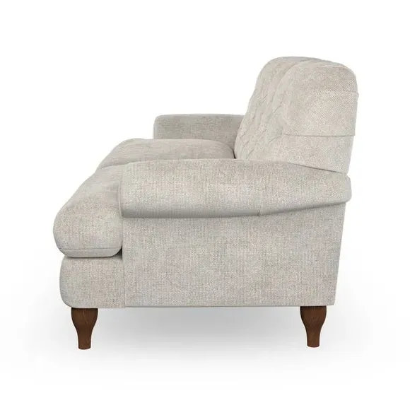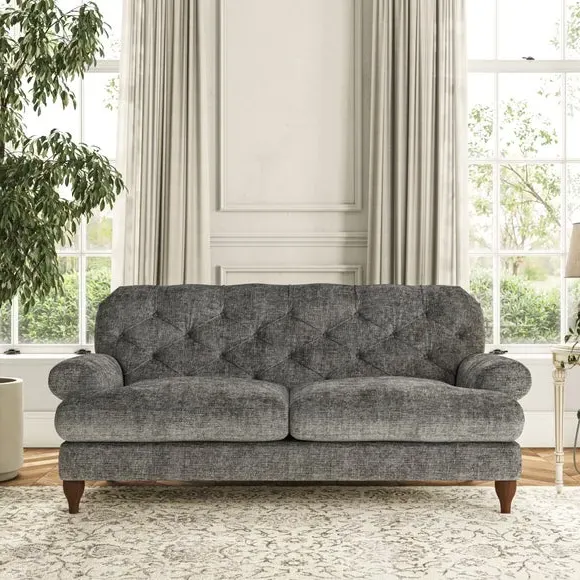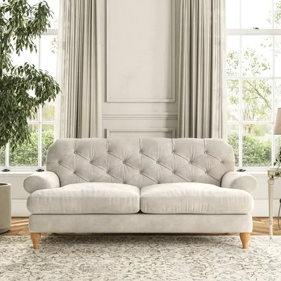 The 3-seater sofa combines classic Chesterfield styling with deep button detailing and elegant scroll arms. Its serpentine seat springs and superloop sprung back provide lasting durability and support, while the high supportive back ensures comfort. The T-cushion design offers a compact contemporary look with self-sewn seat cushions, and the hourglass-shaped turned hardwood legs add stability and style.