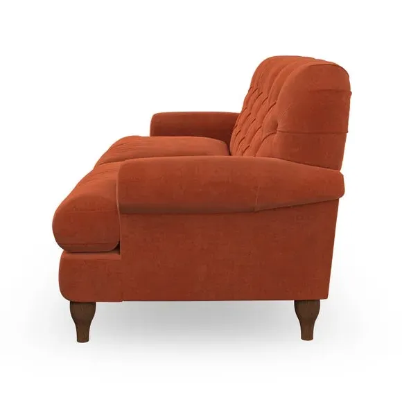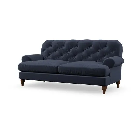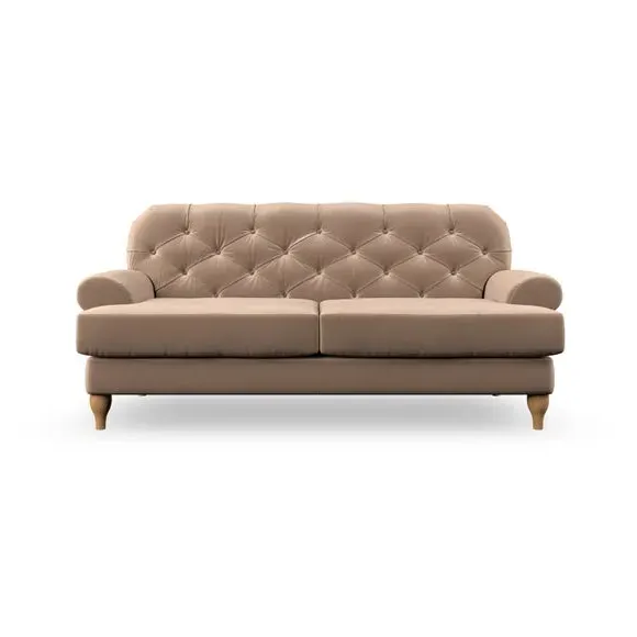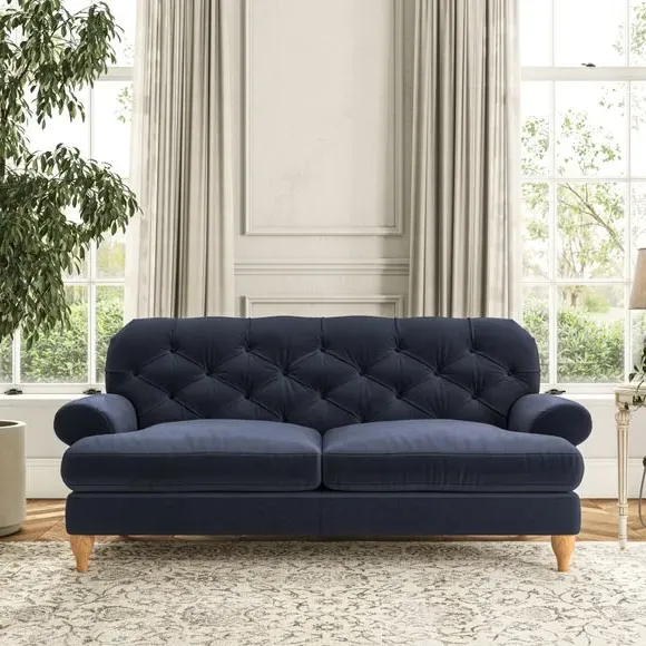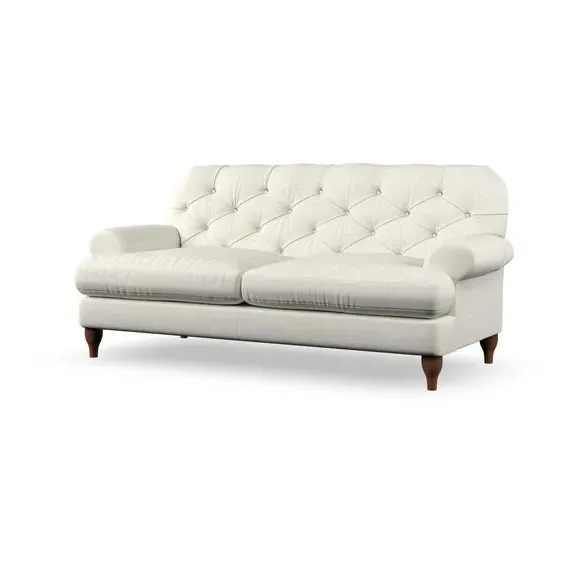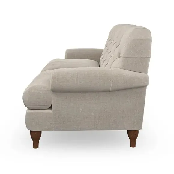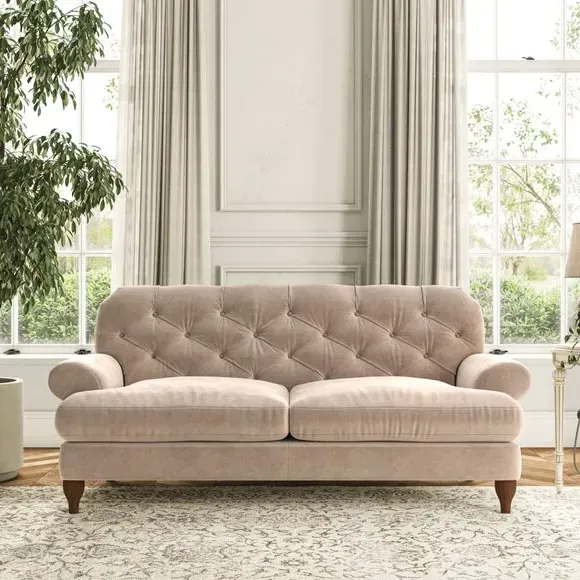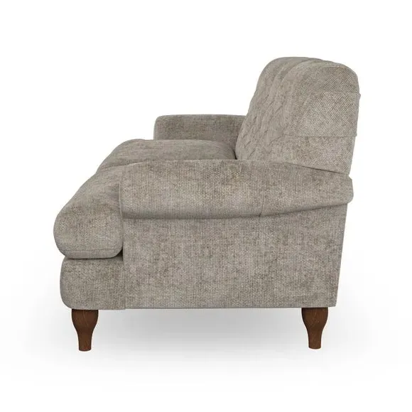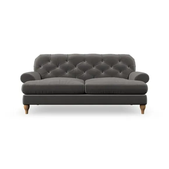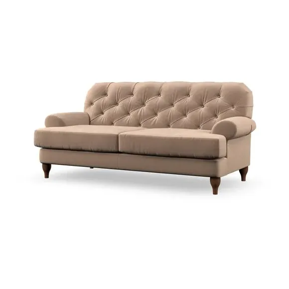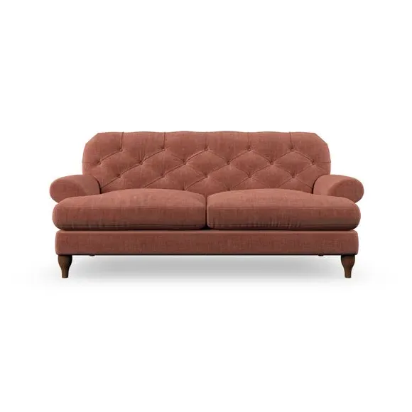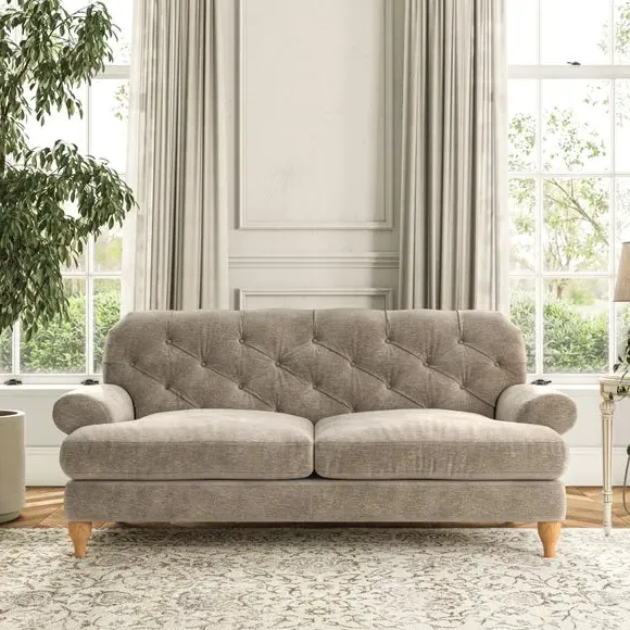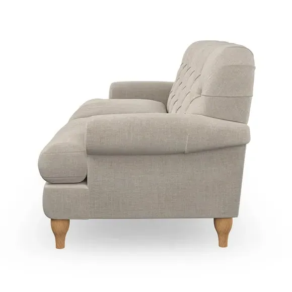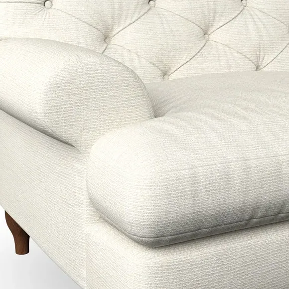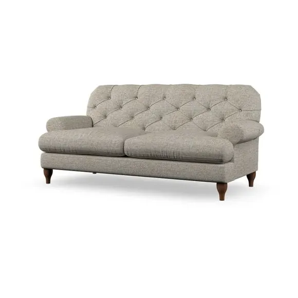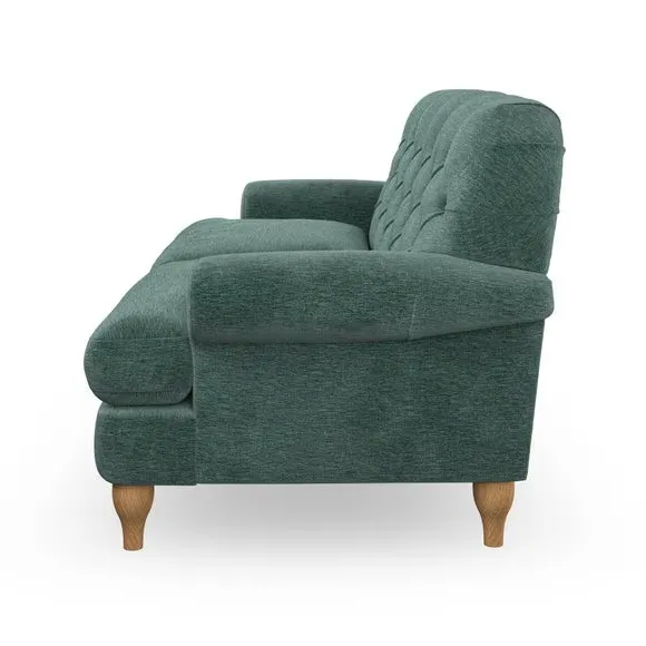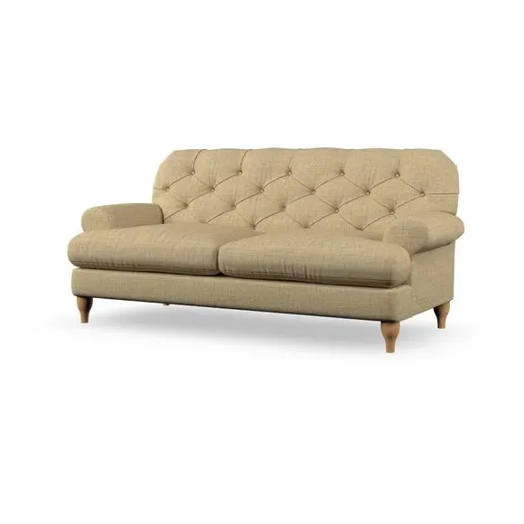 The 3-seater sofa combines classic Chesterfield styling with deep button detailing and elegant scroll arms. Its serpentine seat springs and superloop sprung back provide lasting durability and support, while the high supportive back ensures comfort. The T-cushion design offers a compact contemporary look with self-sewn seat cushions, and the hourglass-shaped turned hardwood legs add stability and style.