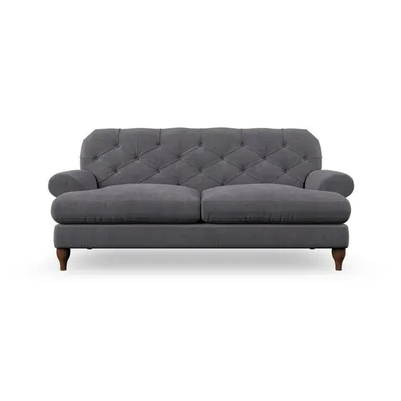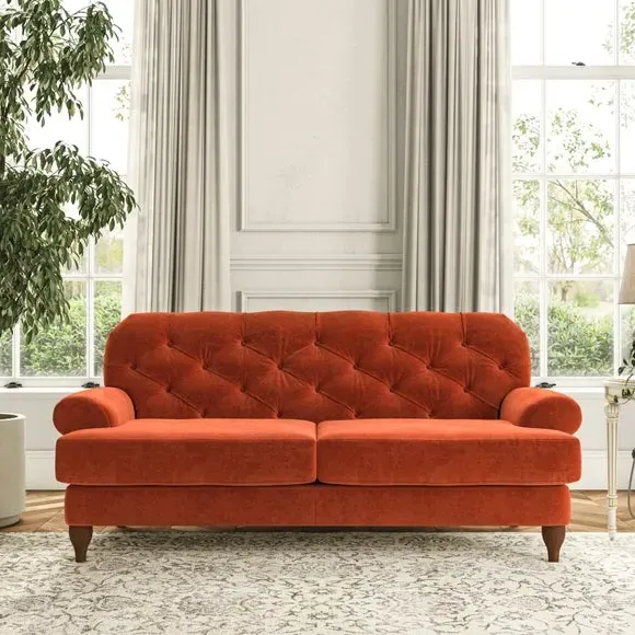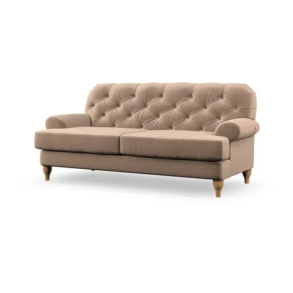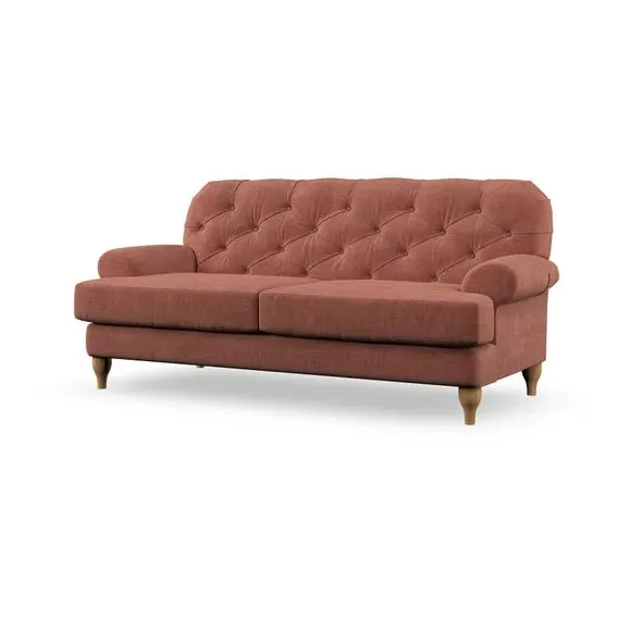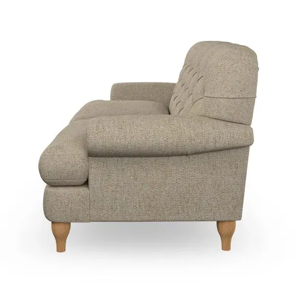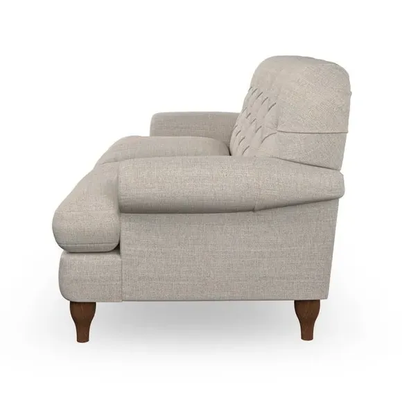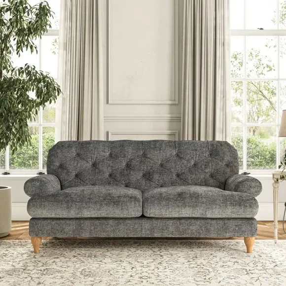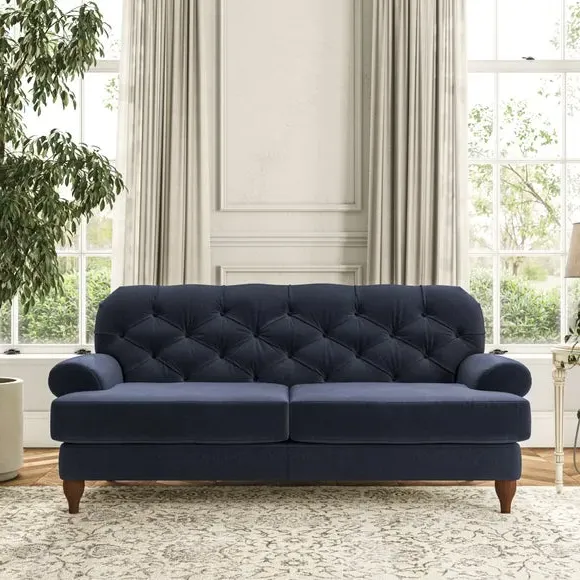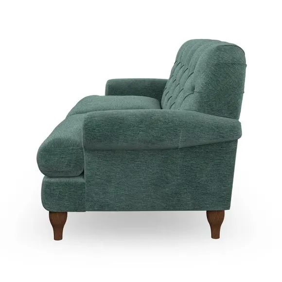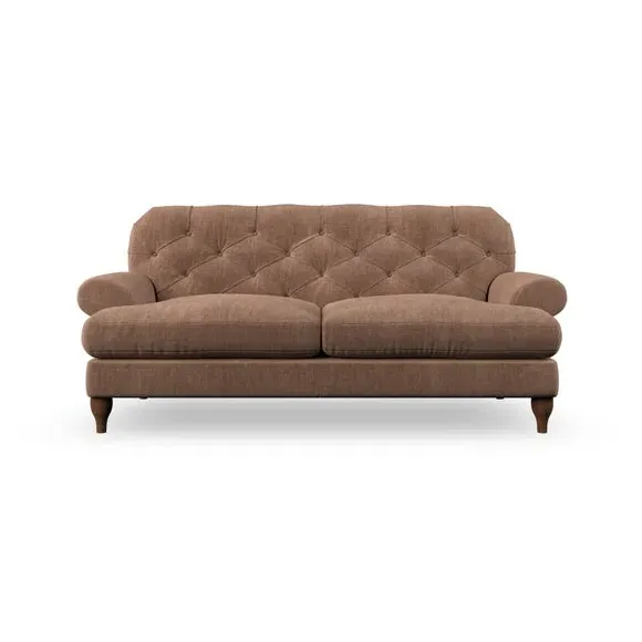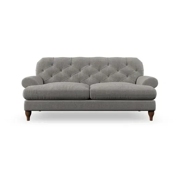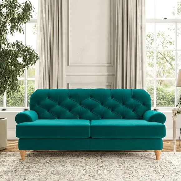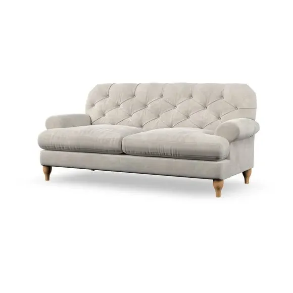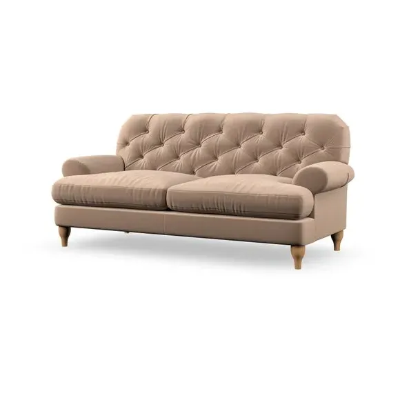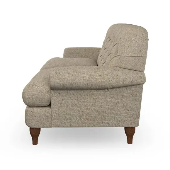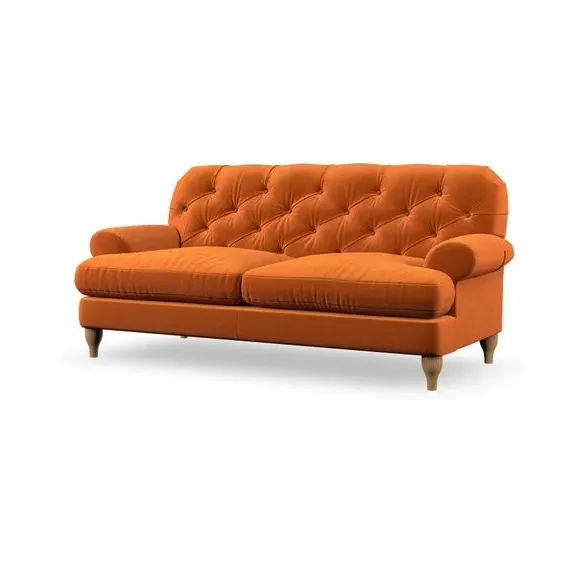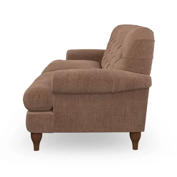 The 3-seater sofa combines classic Chesterfield styling with deep button detailing and elegant scroll arms. Its serpentine seat springs and superloop sprung back provide lasting durability and support, while the high supportive back ensures comfort. The T-cushion design offers a compact contemporary look with self-sewn seat cushions, and the hourglass-shaped turned hardwood legs add stability and style.