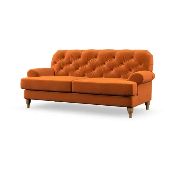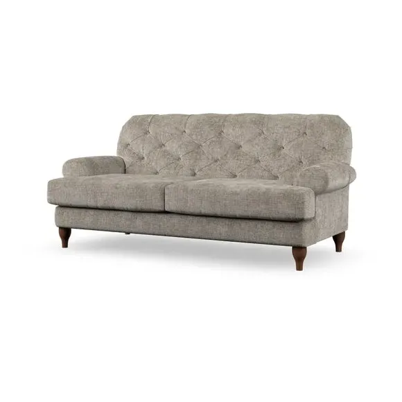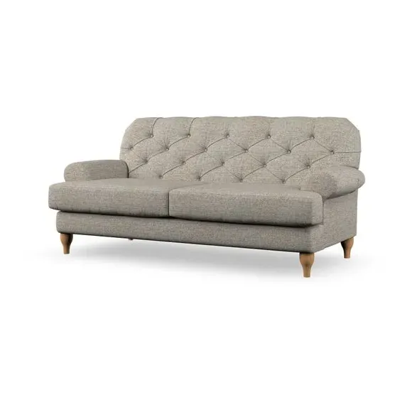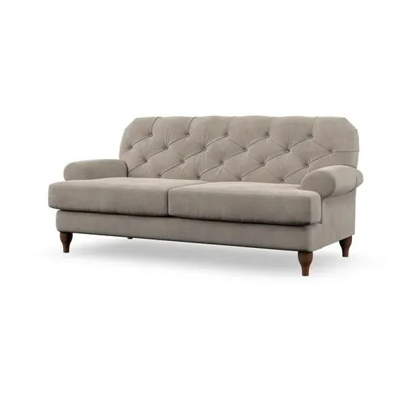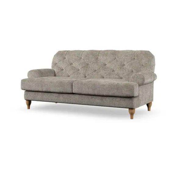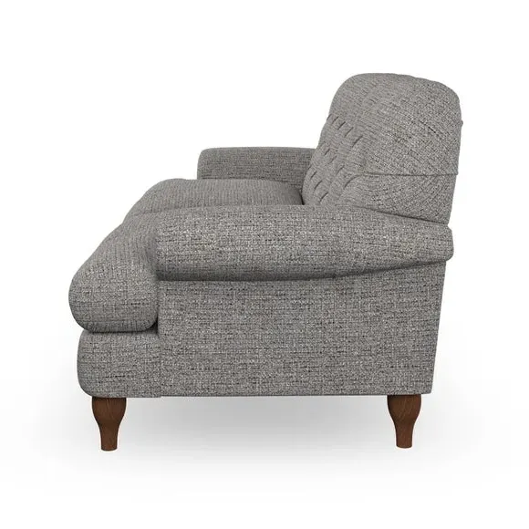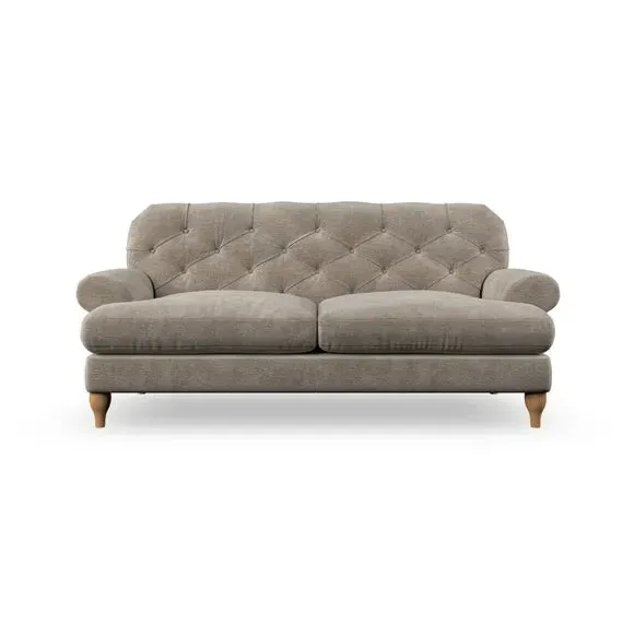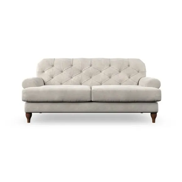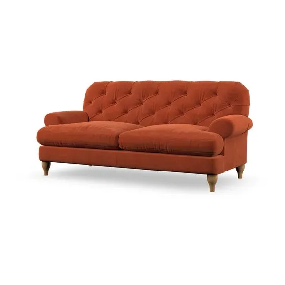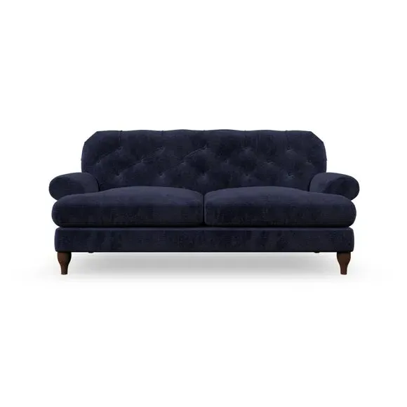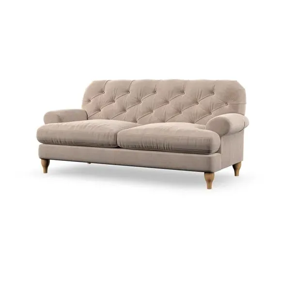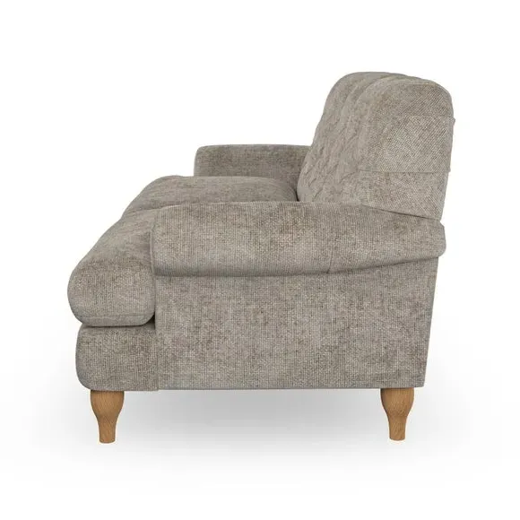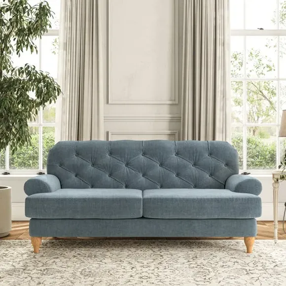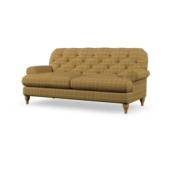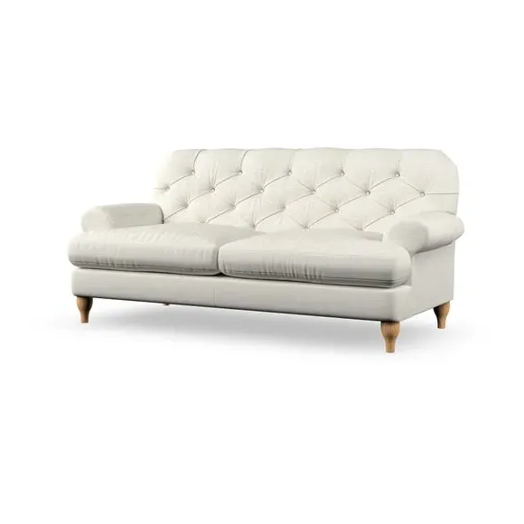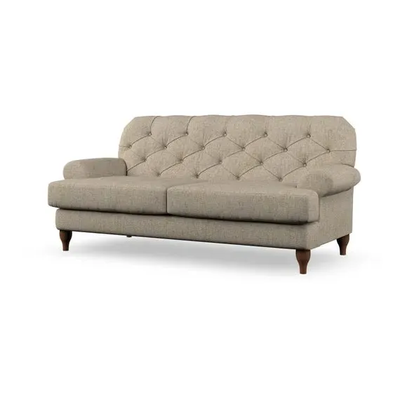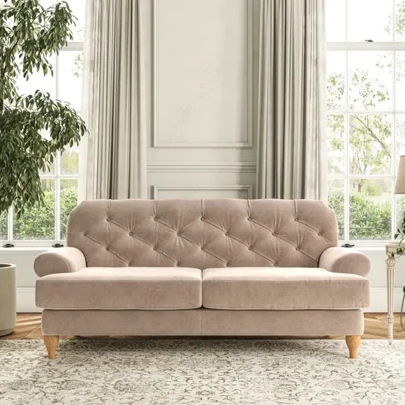The 3-seater sofa combines classic Chesterfield styling with deep button detailing and elegant scroll arms. Its serpentine seat springs and superloop sprung back provide lasting durability and support, while the high supportive back ensures comfort. The T-cushion design offers a compact contemporary look with self-sewn seat cushions, and the hourglass-shaped turned hardwood legs add stability and style.