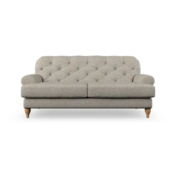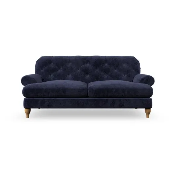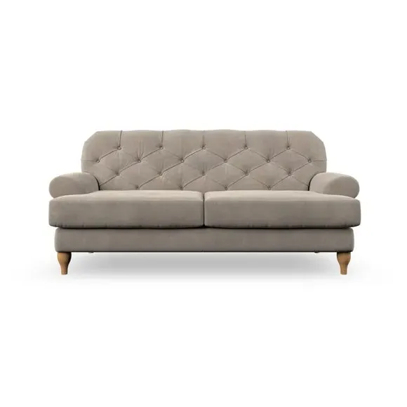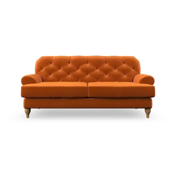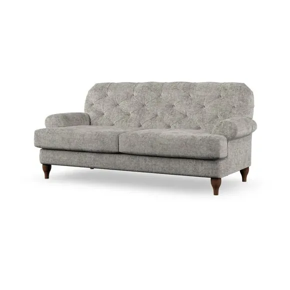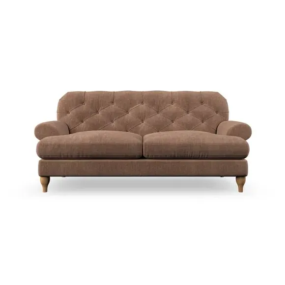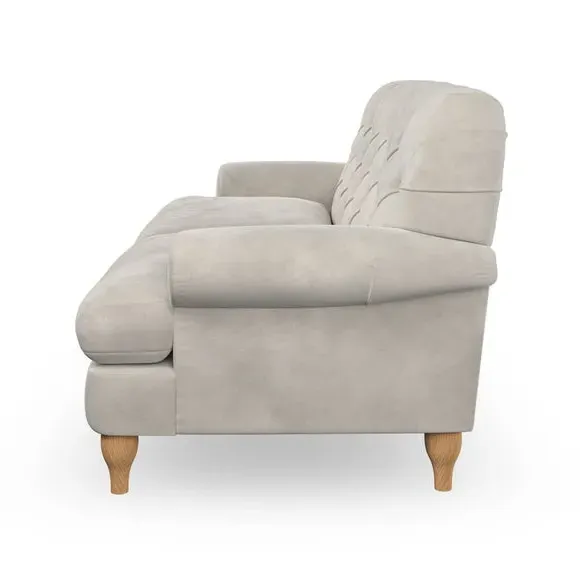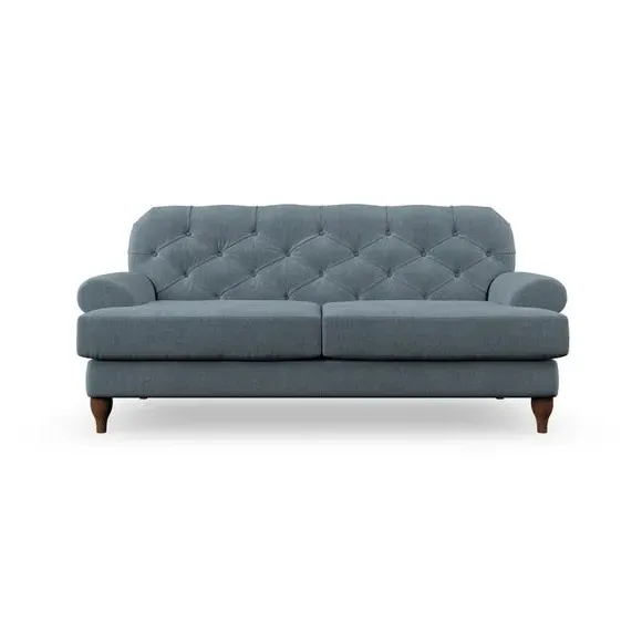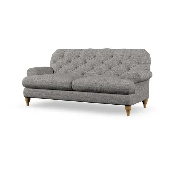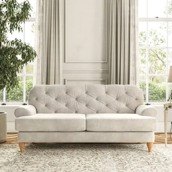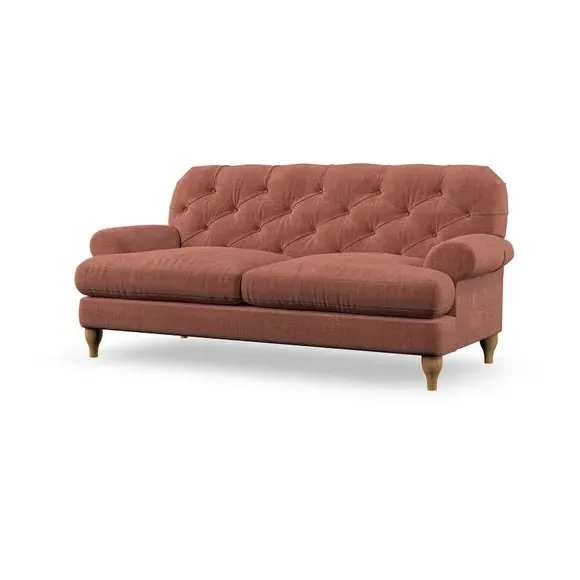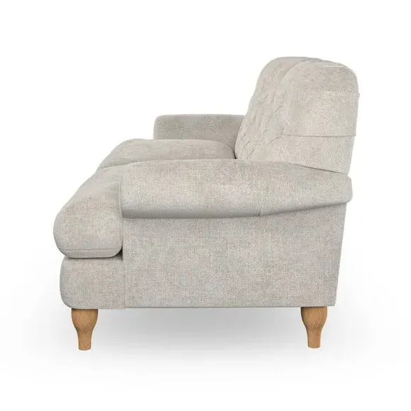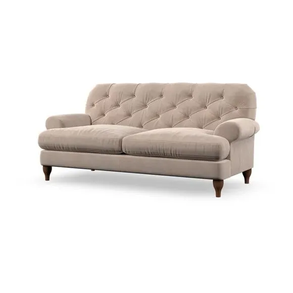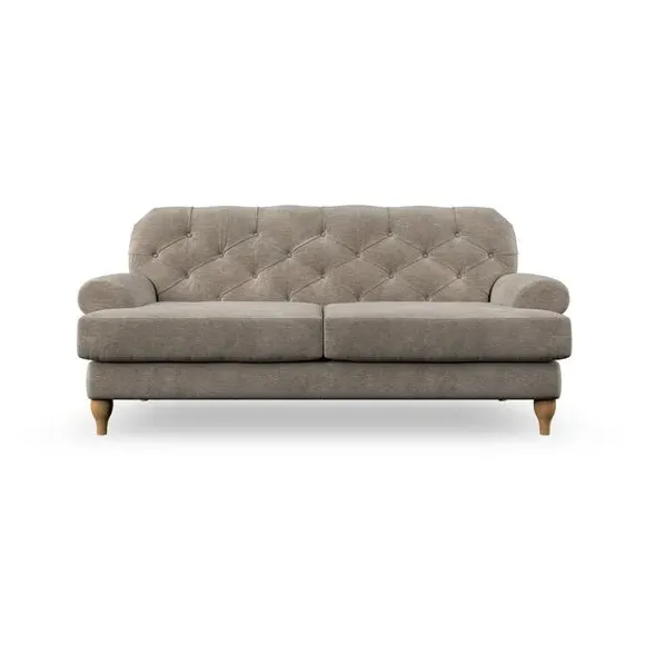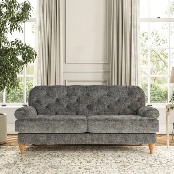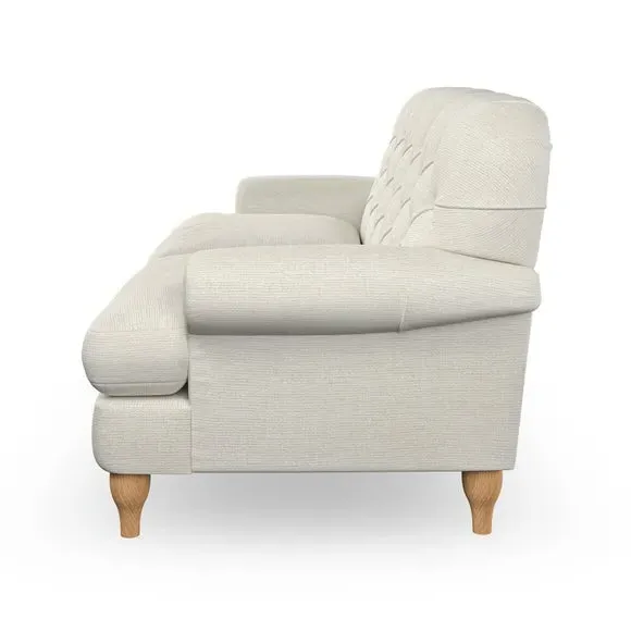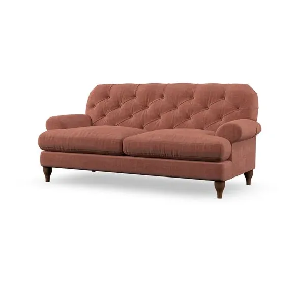The 3-seater sofa combines classic Chesterfield styling with deep button detailing and elegant scroll arms. Its serpentine seat springs and superloop sprung back provide lasting durability and support, while the high supportive back ensures comfort. The T-cushion design offers a compact contemporary look with self-sewn seat cushions, and the hourglass-shaped turned hardwood legs add stability and style.