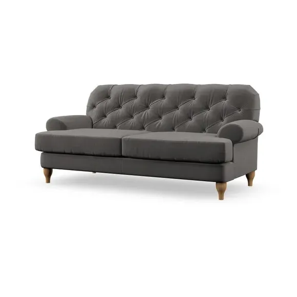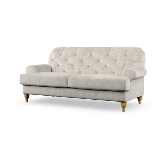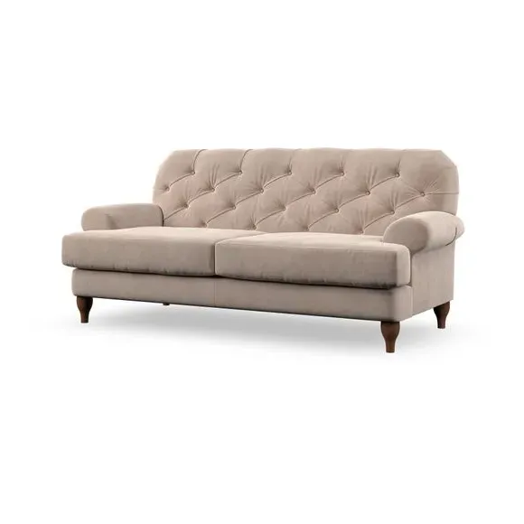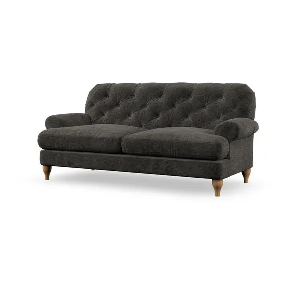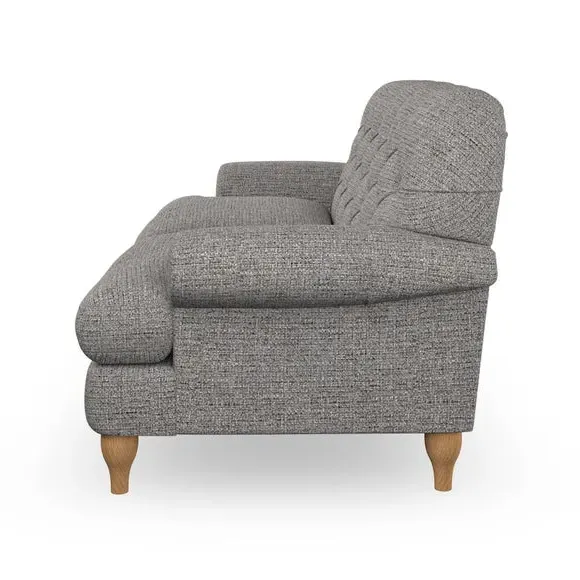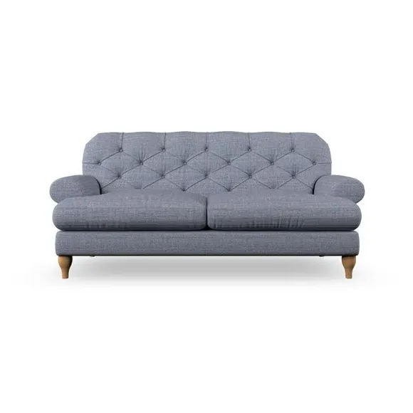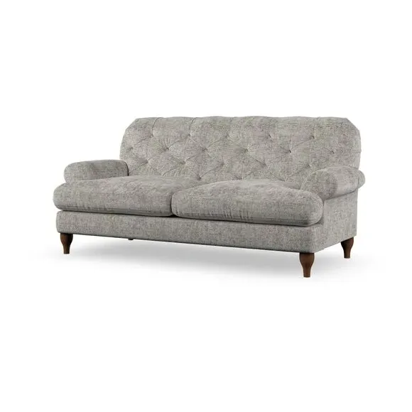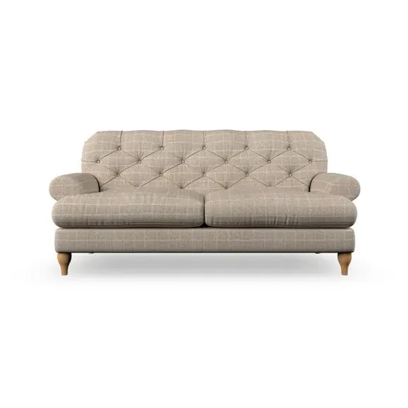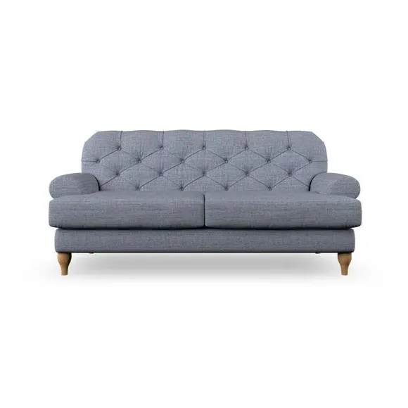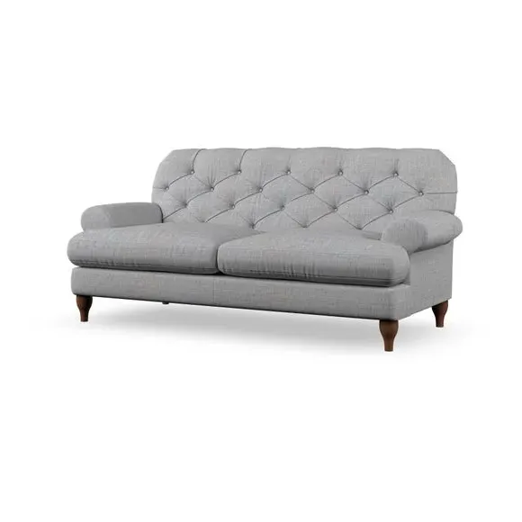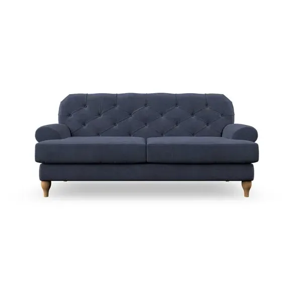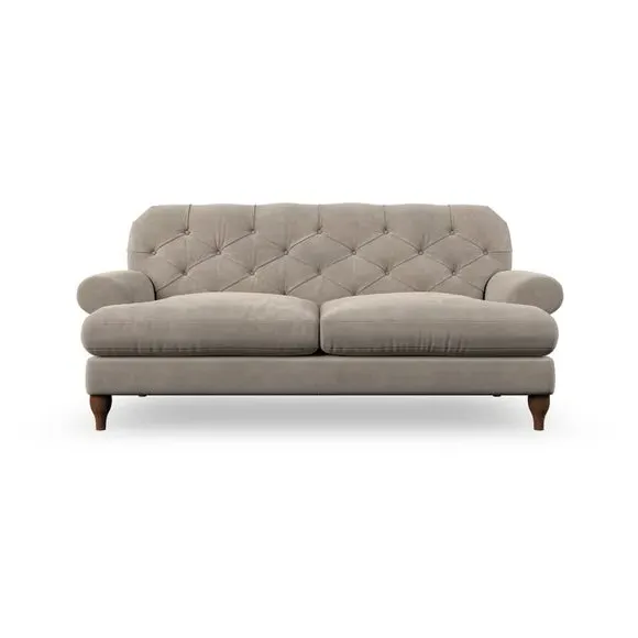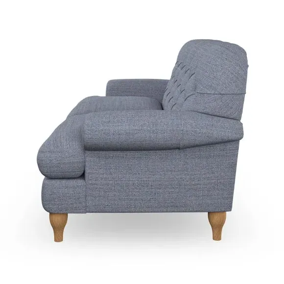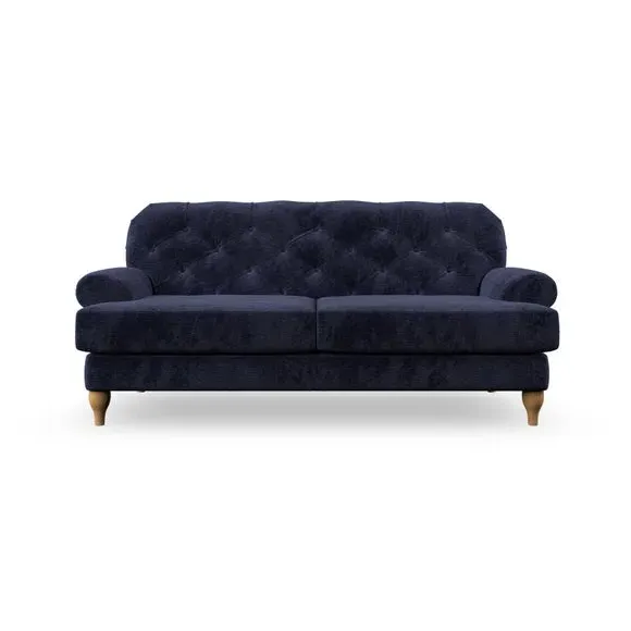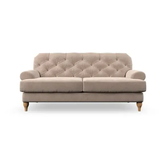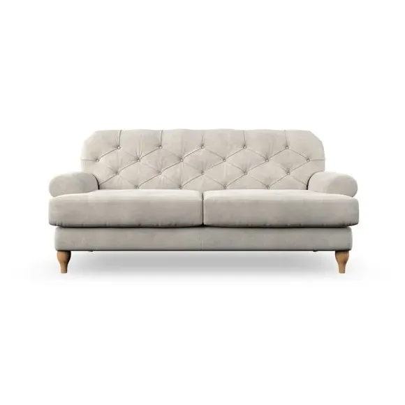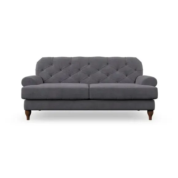 The 3-seater sofa combines classic Chesterfield styling with deep button detailing and elegant scroll arms. Its serpentine seat springs and superloop sprung back provide lasting durability and support, while the high supportive back ensures comfort. The T-cushion design offers a compact contemporary look with self-sewn seat cushions, and the hourglass-shaped turned hardwood legs add stability and style.