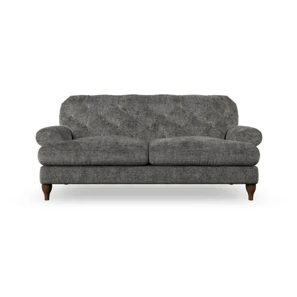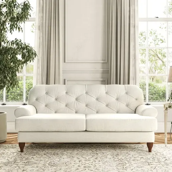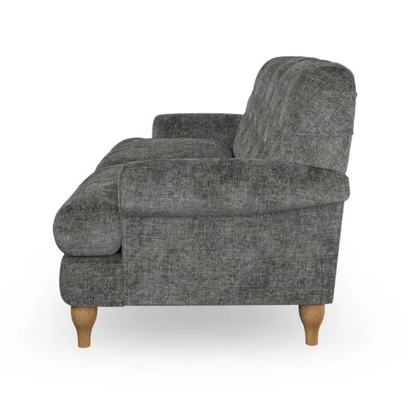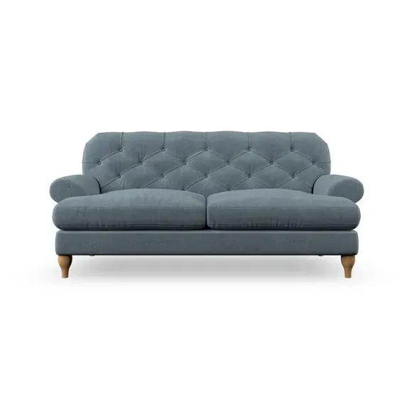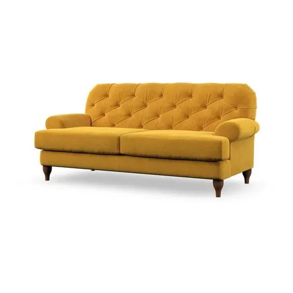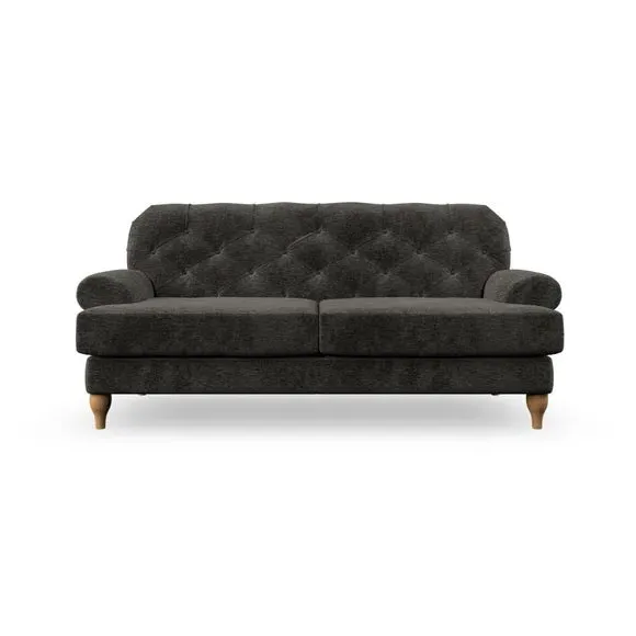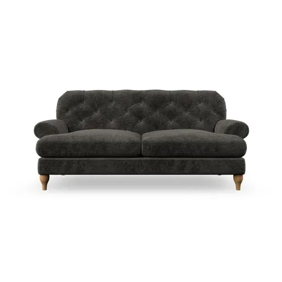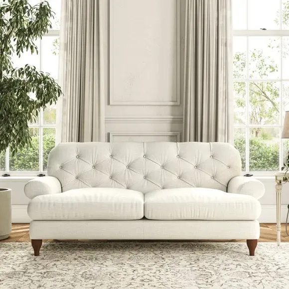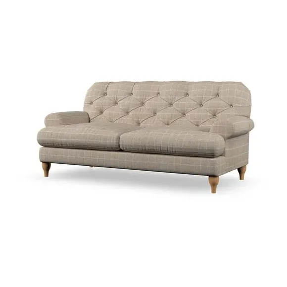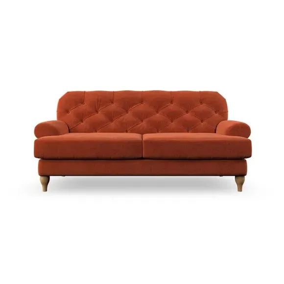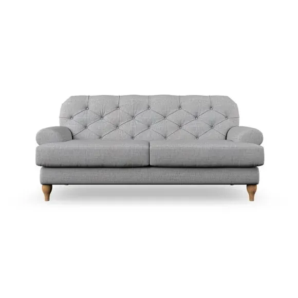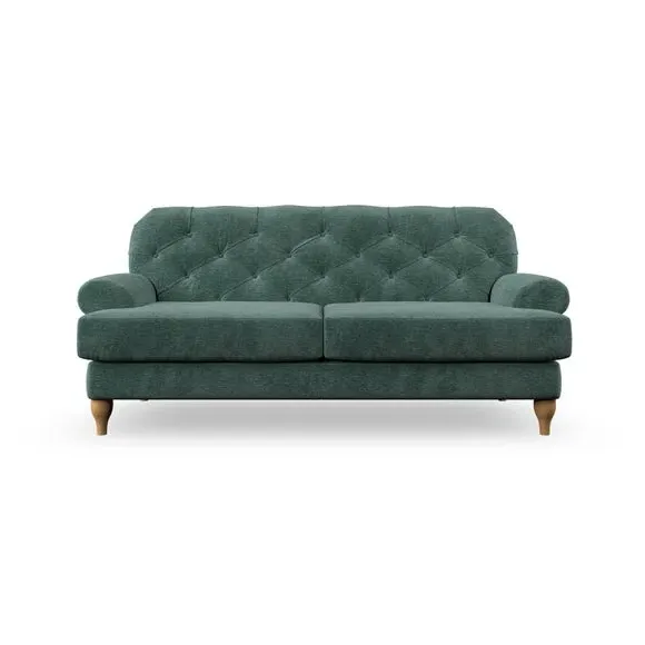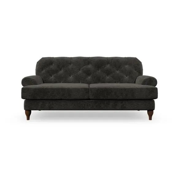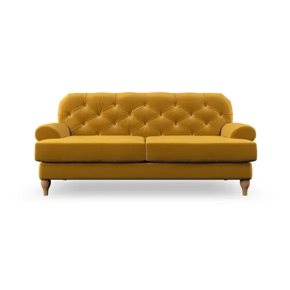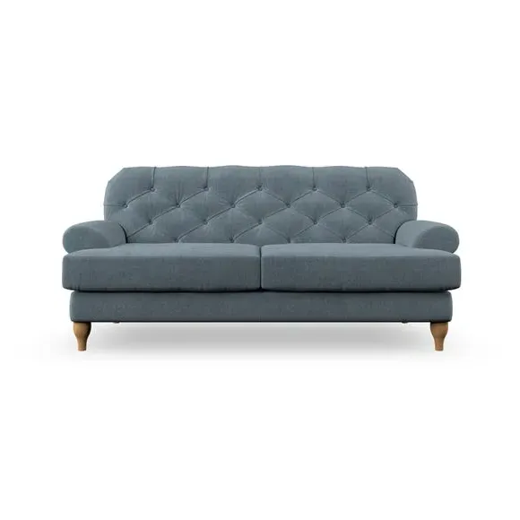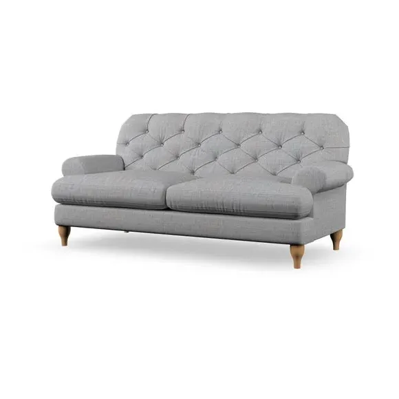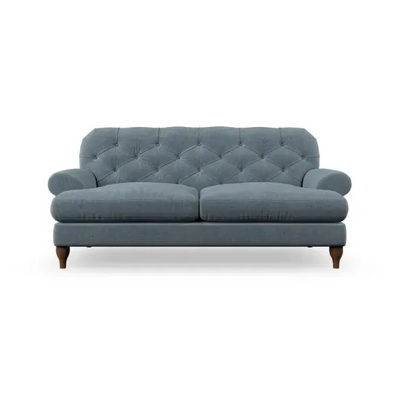 The 3-seater sofa combines classic Chesterfield styling with deep button detailing and elegant scroll arms. Its serpentine seat springs and superloop sprung back provide lasting durability and support, while the high supportive back ensures comfort. The T-cushion design offers a compact contemporary look with self-sewn seat cushions, and the hourglass-shaped turned hardwood legs add stability and style.