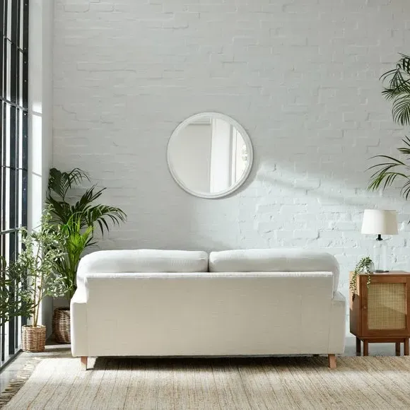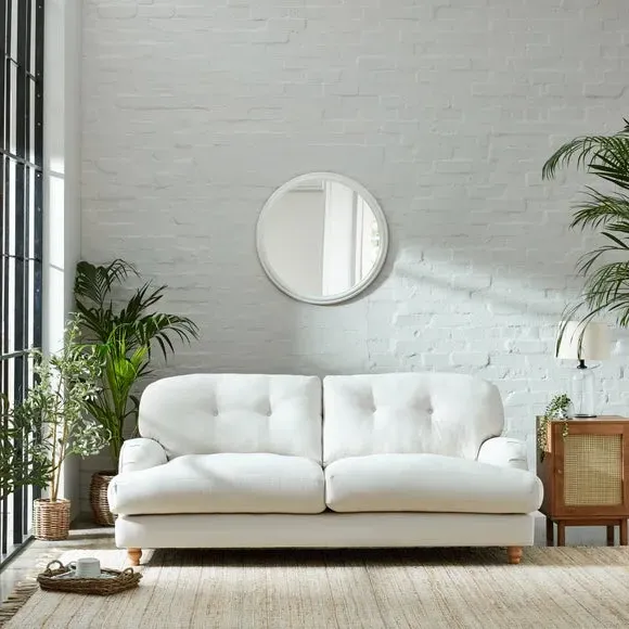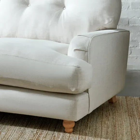 The 3-seater sofa combines spacious seating with retro charm through its soft faux linen upholstery. Its fibre-filled seat cushions provide ample comfort, while the turned wooden legs add aesthetic appeal. The soft-touch fabric construction offers both style and coziness for daily use. Note that fibre-filled cushions require daily plumping to maintain their shape and prevent flattening.