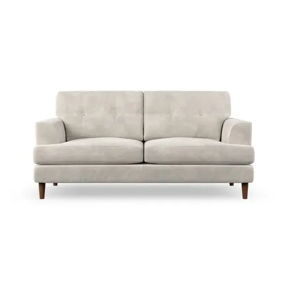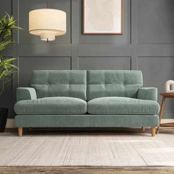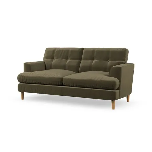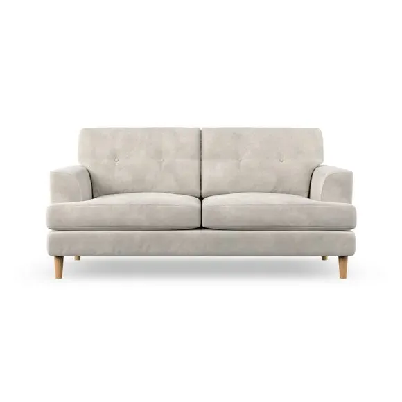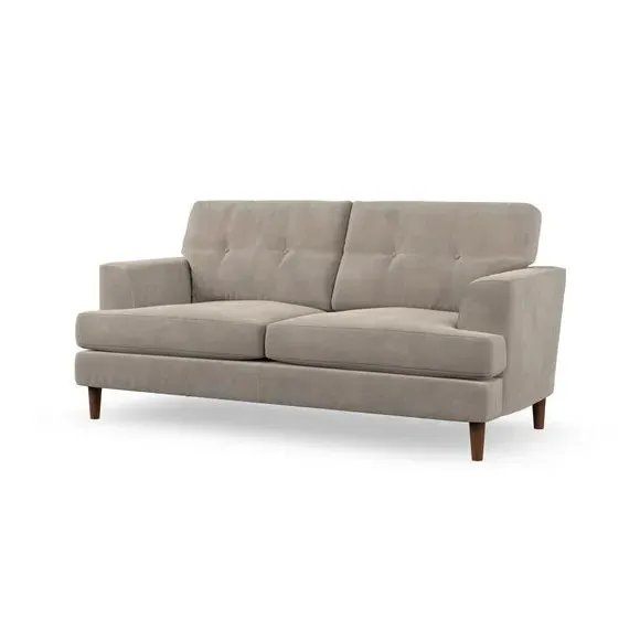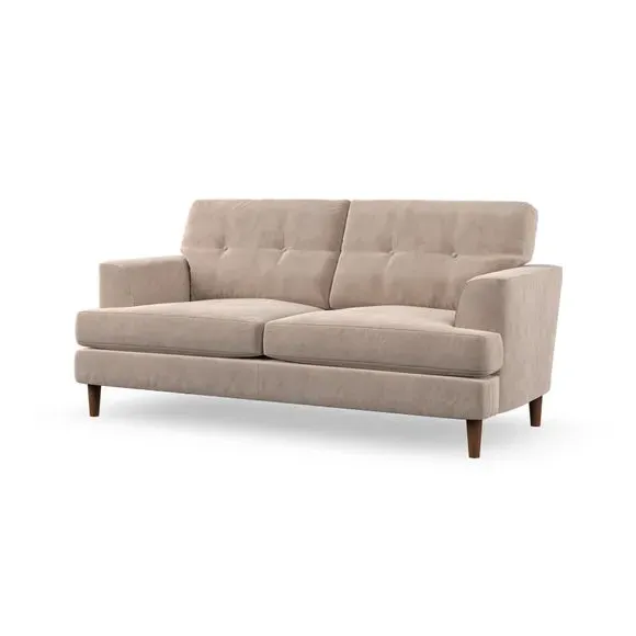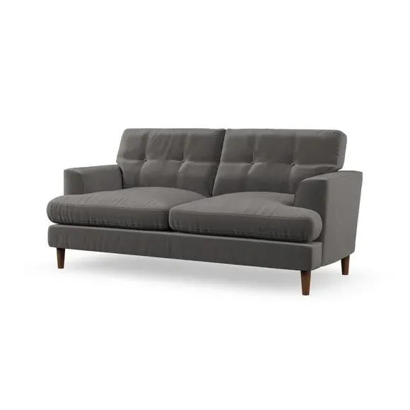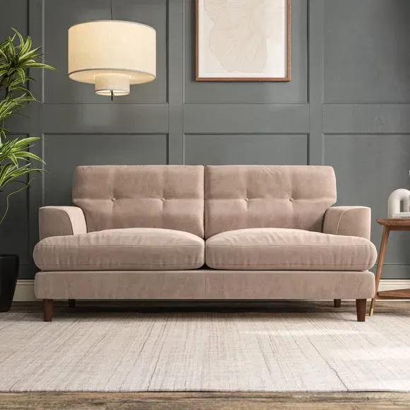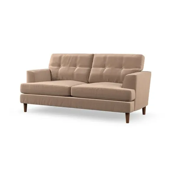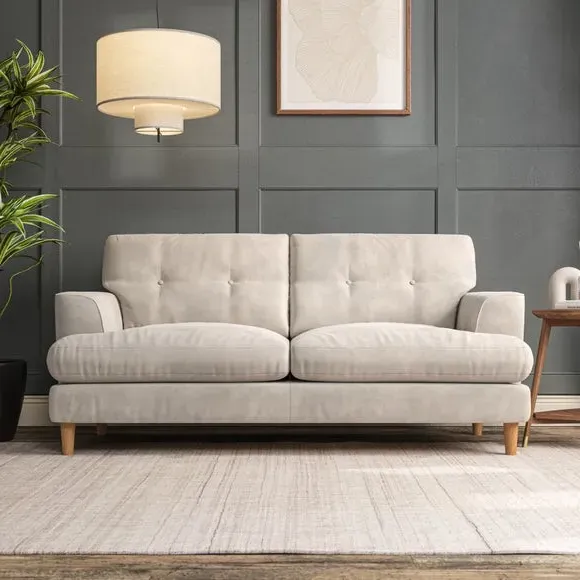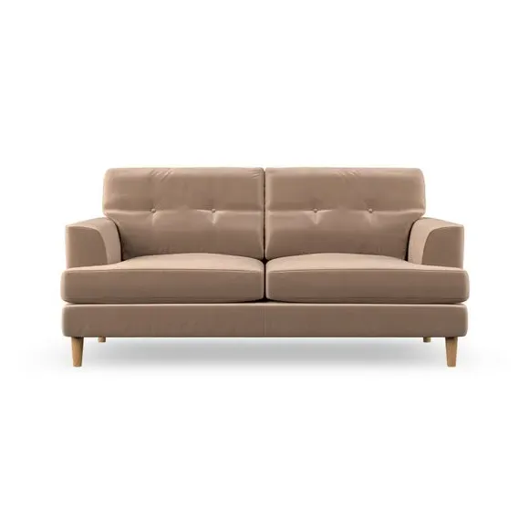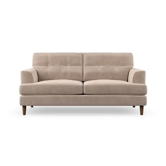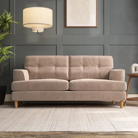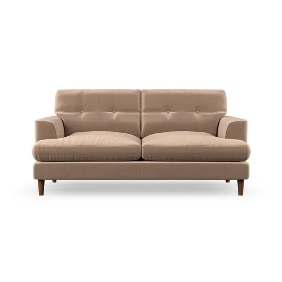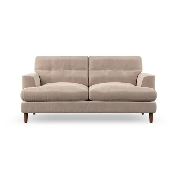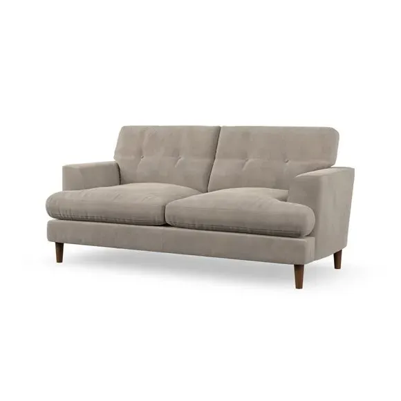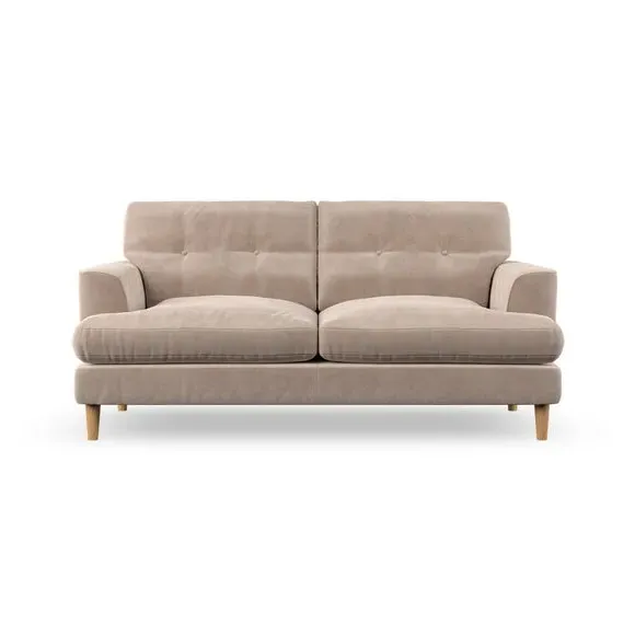 The sofa combines Scandinavian design with modern comfort, featuring clean lines and T-shaped seat cushions. Its fibre-filled back cushions provide supportive seating, while the button-pull detailing adds visual interest. The high legs create an airy feel and the house velvet fabric offers durability and texture.