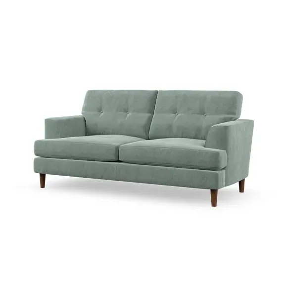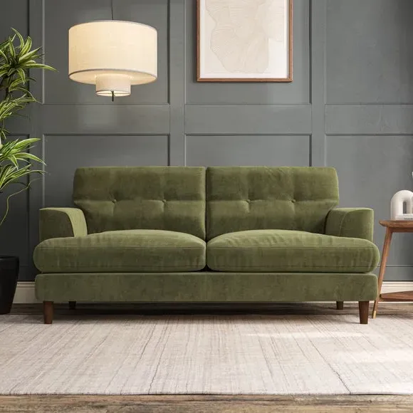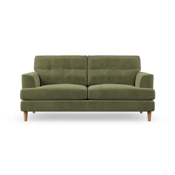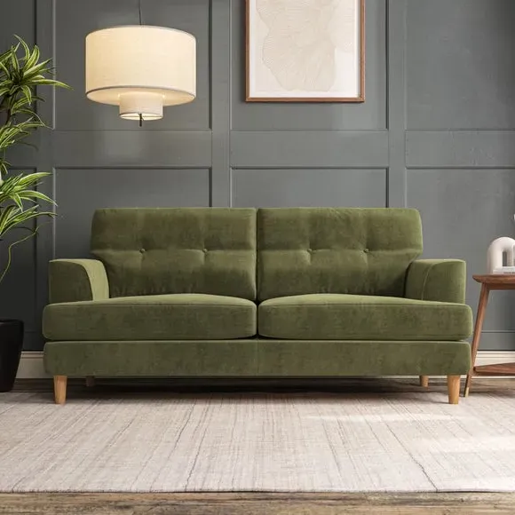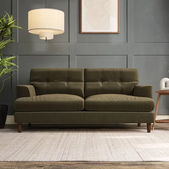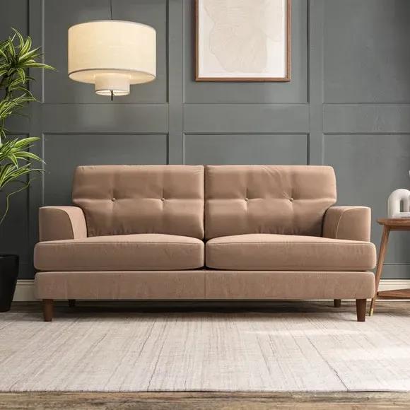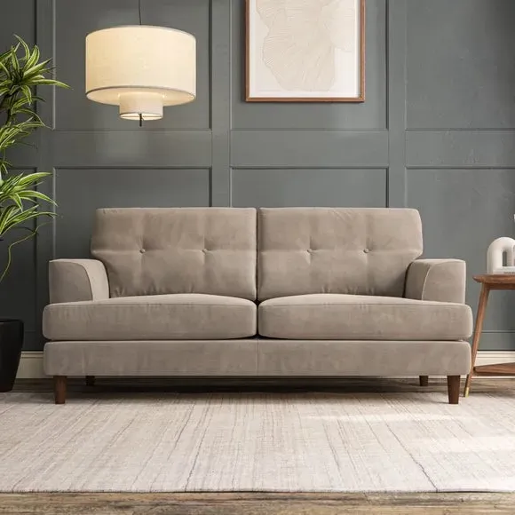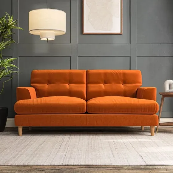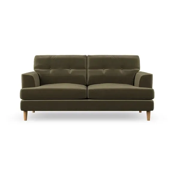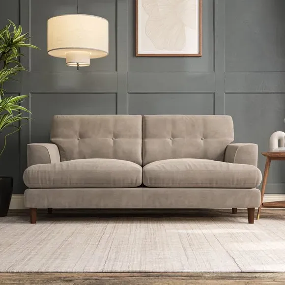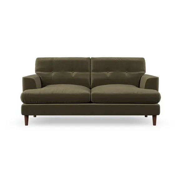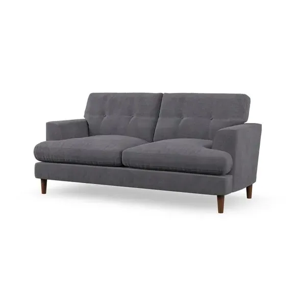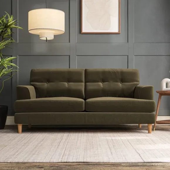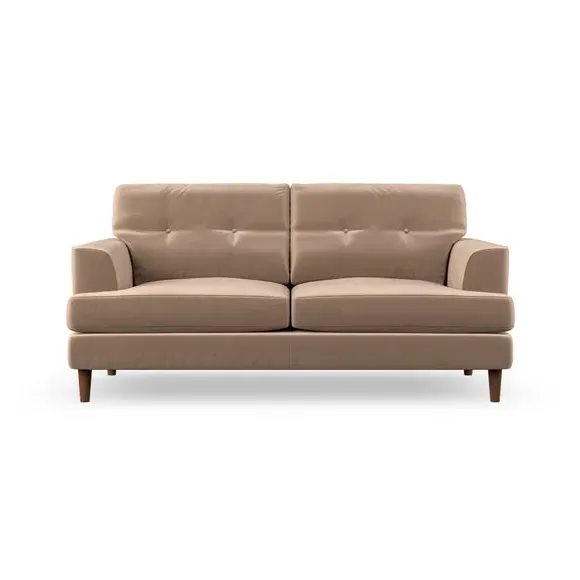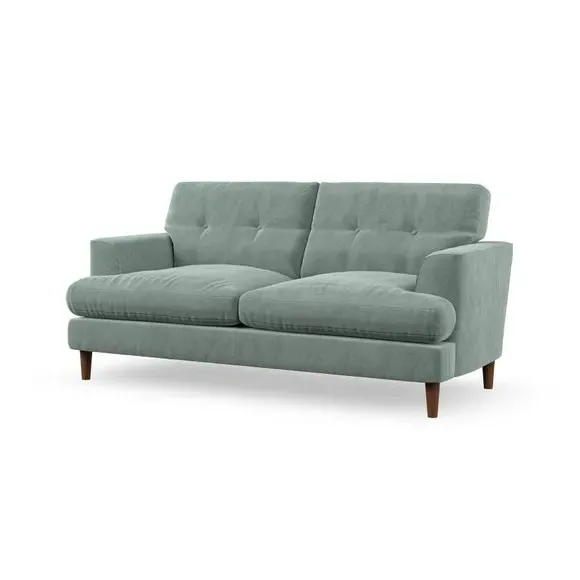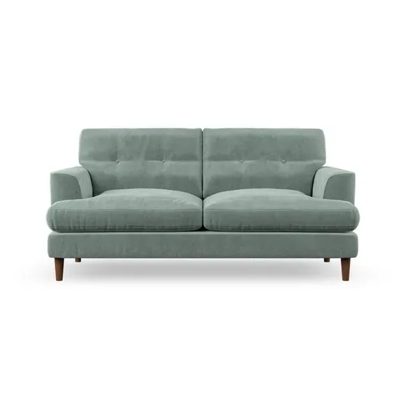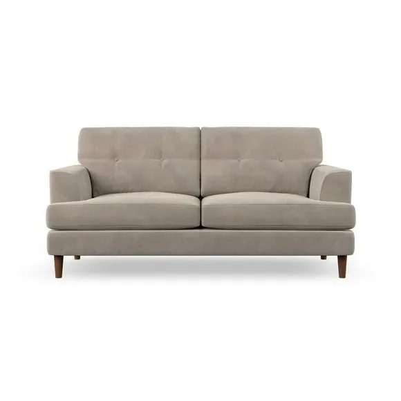 The sofa combines Scandinavian design with modern comfort, featuring clean lines and T-shaped seat cushions. Its fibre-filled back cushions provide supportive seating, while the button-pull detailing adds visual interest. The high legs create an airy feel and the house velvet fabric offers durability and texture.