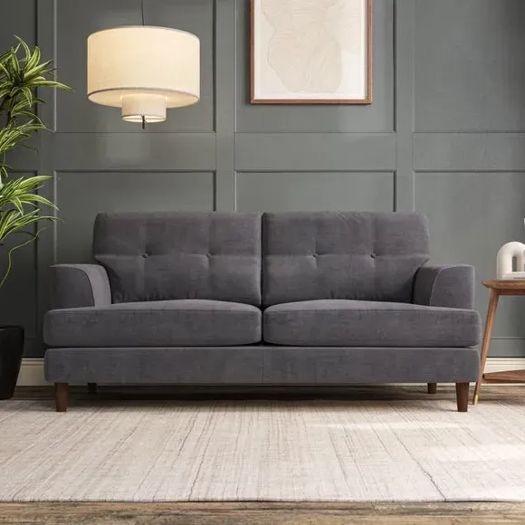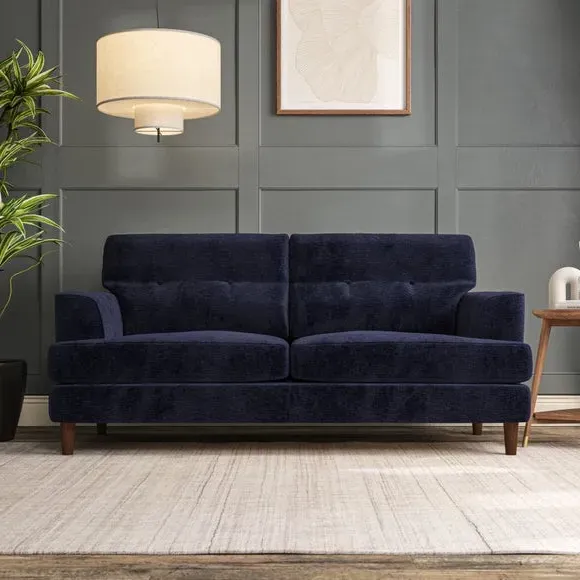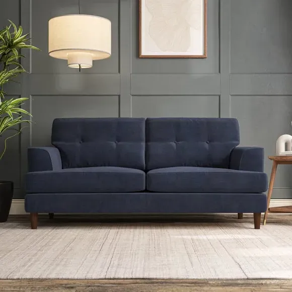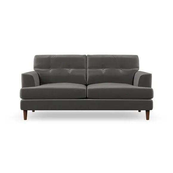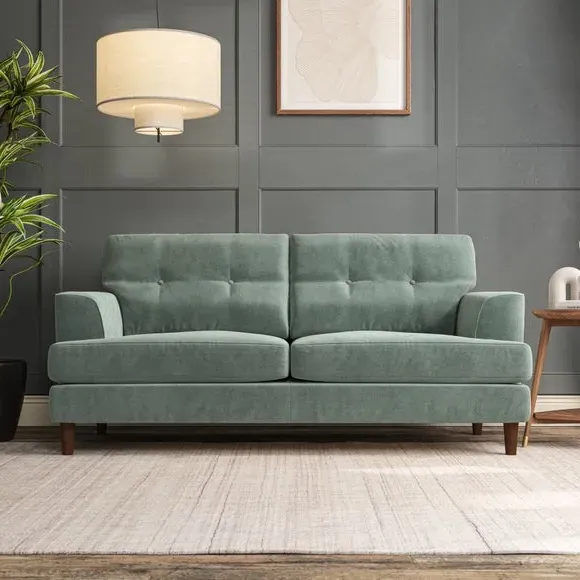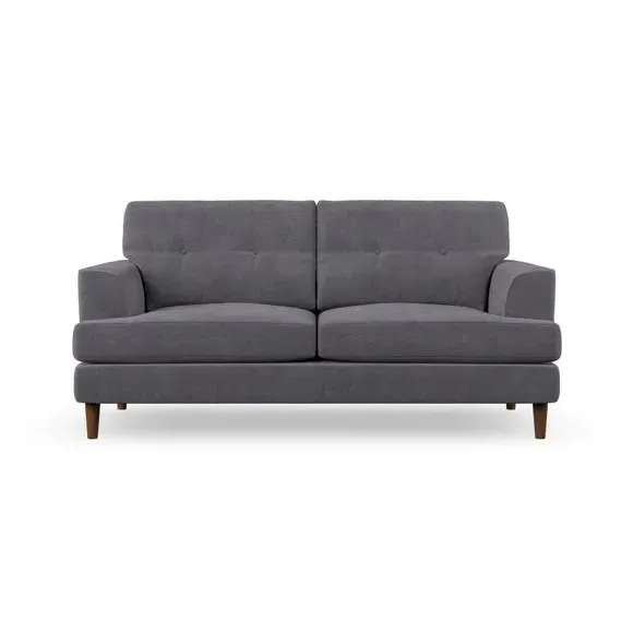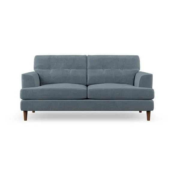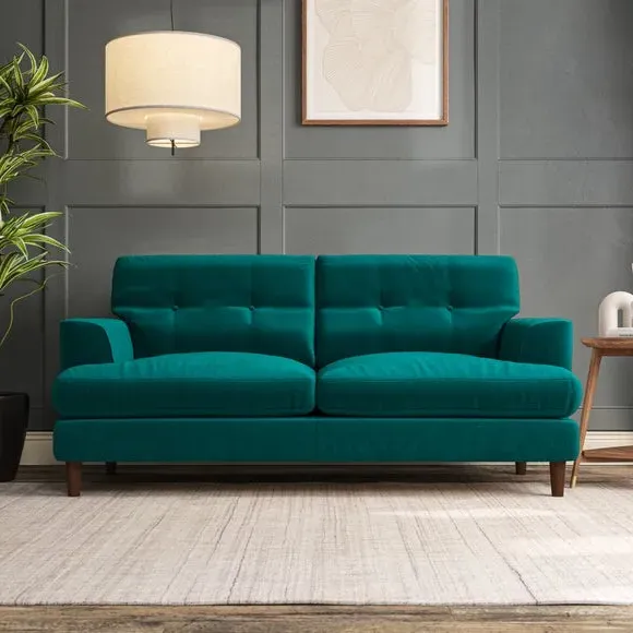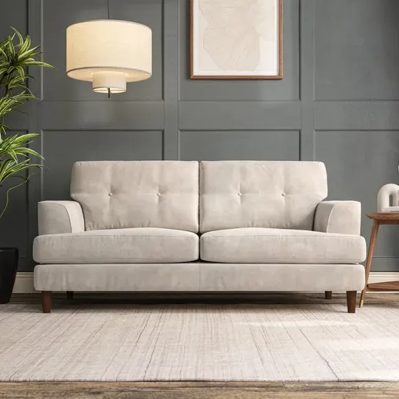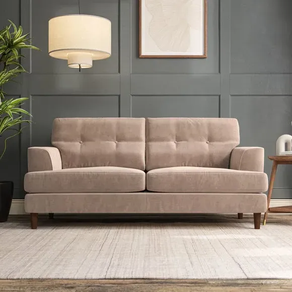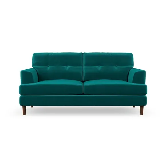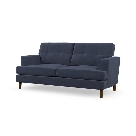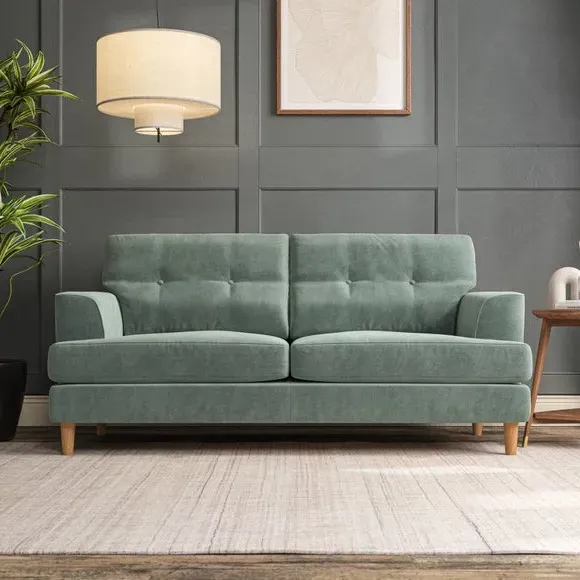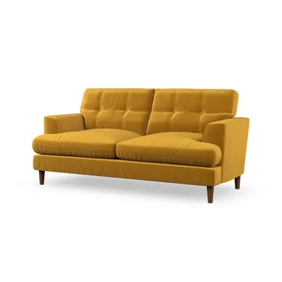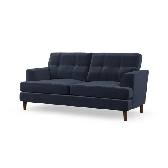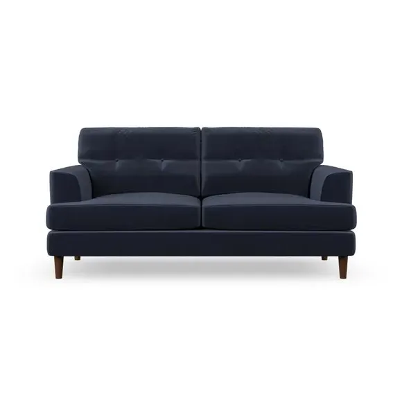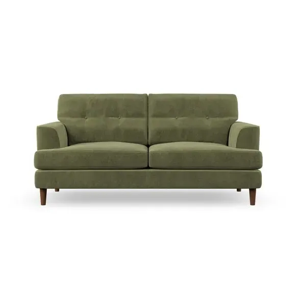 The sofa combines Scandinavian design with modern comfort, featuring clean lines and T-shaped seat cushions. Its fibre-filled back cushions provide supportive seating, while the button-pull detailing adds visual interest. The high legs create an airy feel and the house velvet fabric offers durability and texture.