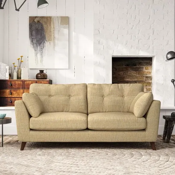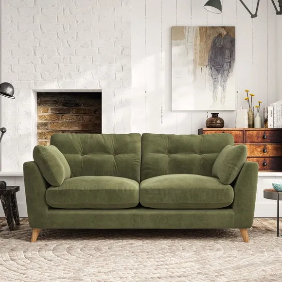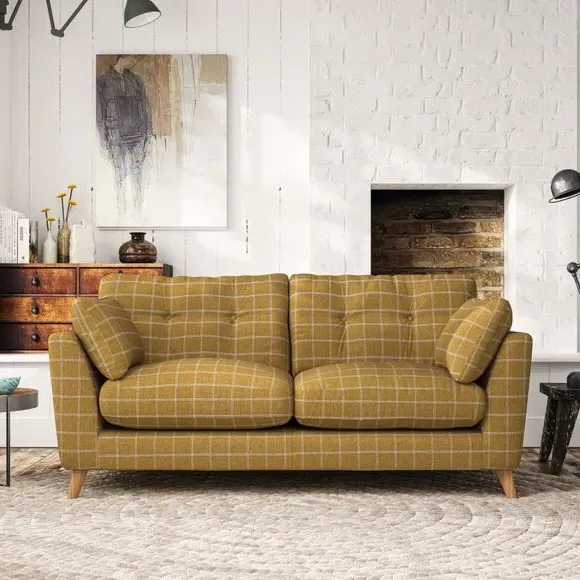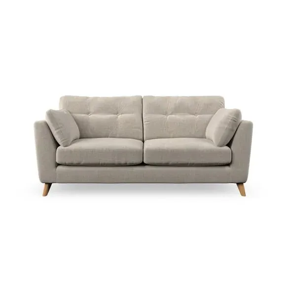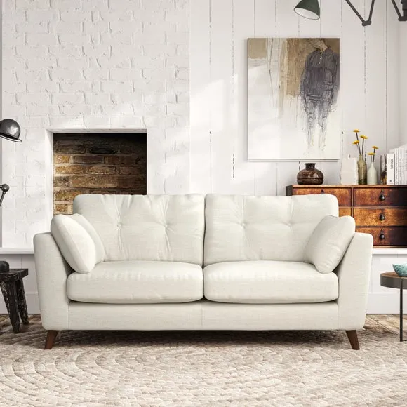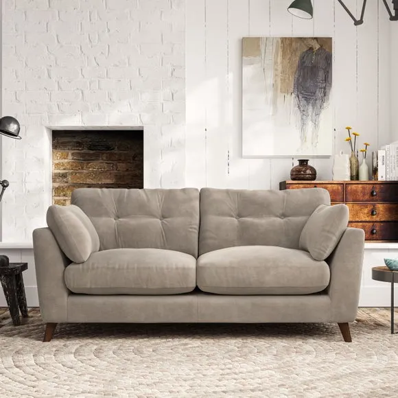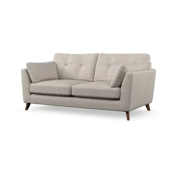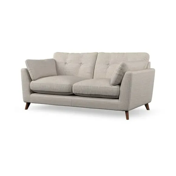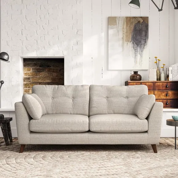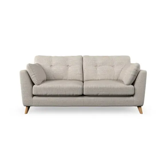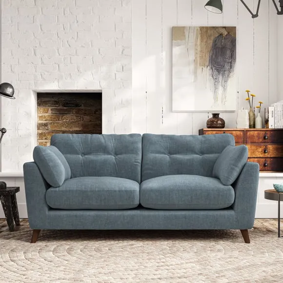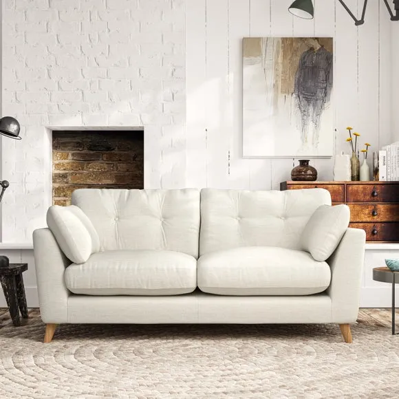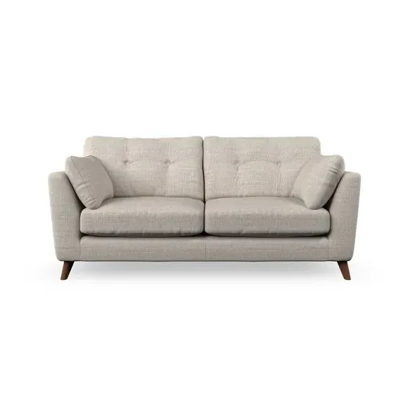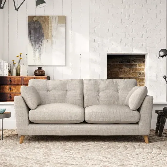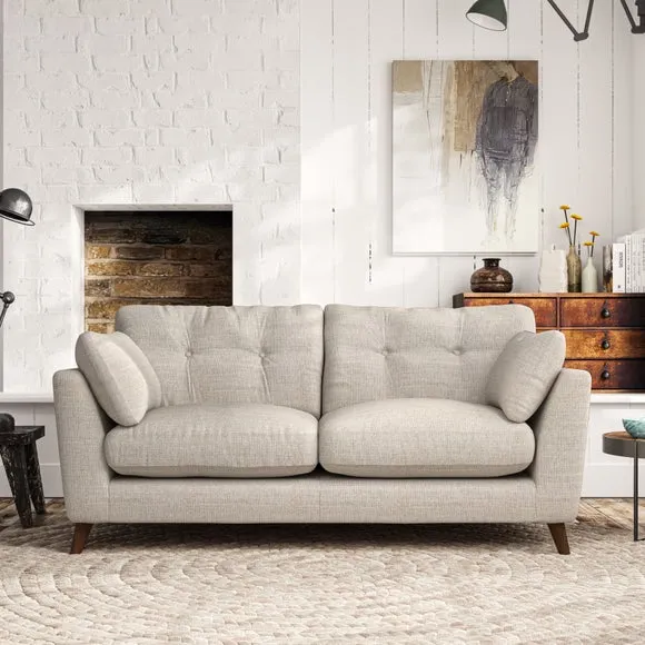 * Mid-century style* Pillow top arms* Button pull details* Choose fabric type, leg colour and cushion filling This sofa's high legs and plush fibre-filled arm pads add softness to its clean lines, while the button-pull details on the supportive back cushions provide a refined touch. The higher back cushions offer excellent support for your back and shoulders, ensuring comfort without compromise. You can personalise your sofa by choosing between a low-maintenance foam seat or a more relaxed 'Qualofill Blue' fibre seat. Built with serpentine seat springs, the Peyton sofa ensures durability and comfort for the long term. The splayed hardwood legs, available in two finishes, are easy to fit and allow for customisation.