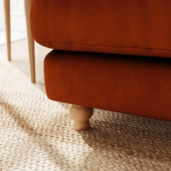 The sofa offers luxurious comfort with its plush velvet upholstery and deep, inviting cushions. Its fibre-filled seating provides soft support, while the matte finish adds understated sophistication. The turned wooden legs bring timeless appeal, and the construction ensures lasting durability with proper daily maintenance.