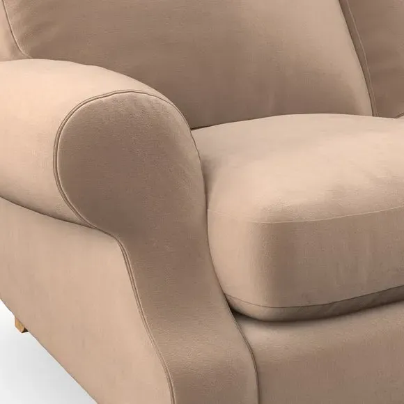 The sofa combines comfort with its cut back scroll arms and gently arched back cushions. Its top-stitched detail on the arm front adds sophistication, while the high back cushions with generous fibre filling provide excellent support for back and shoulders. The serpentine seat springs enhance comfort, and the turned hardwood legs ensure durability with easy fitting.