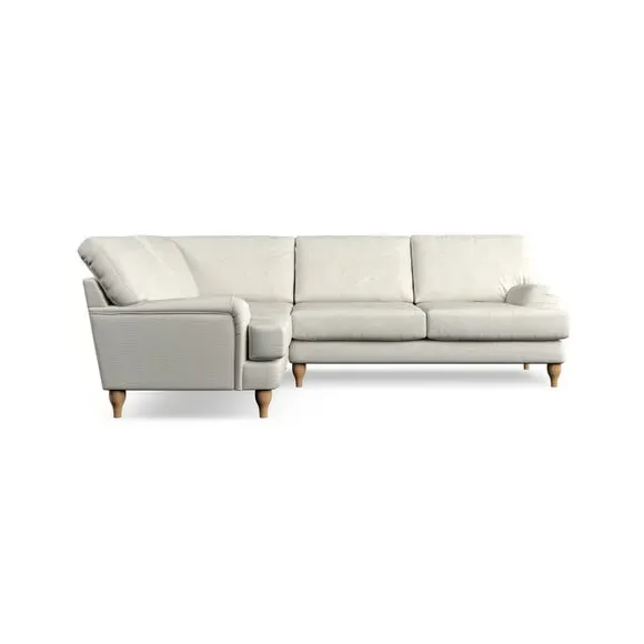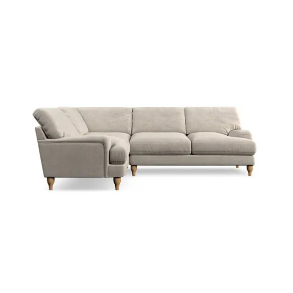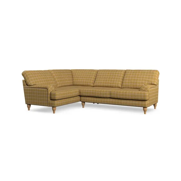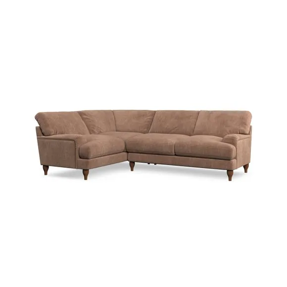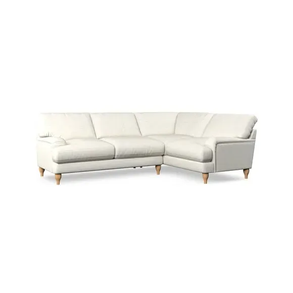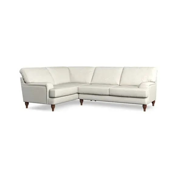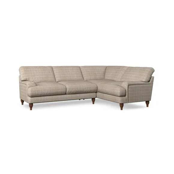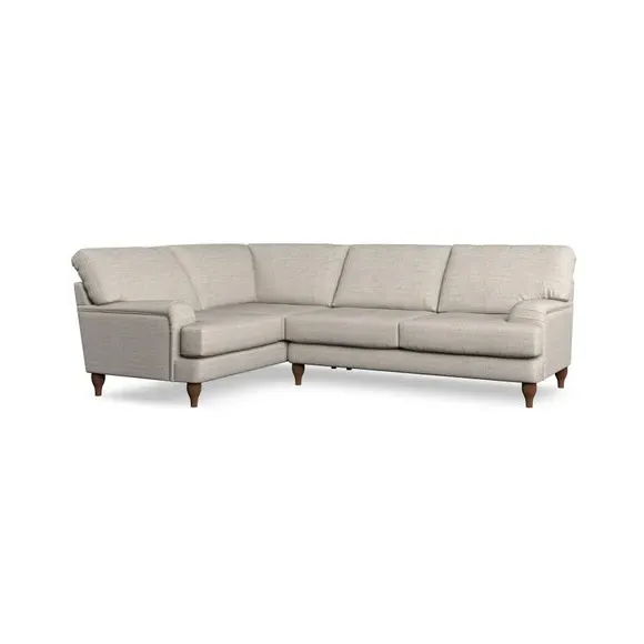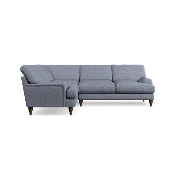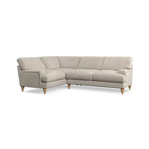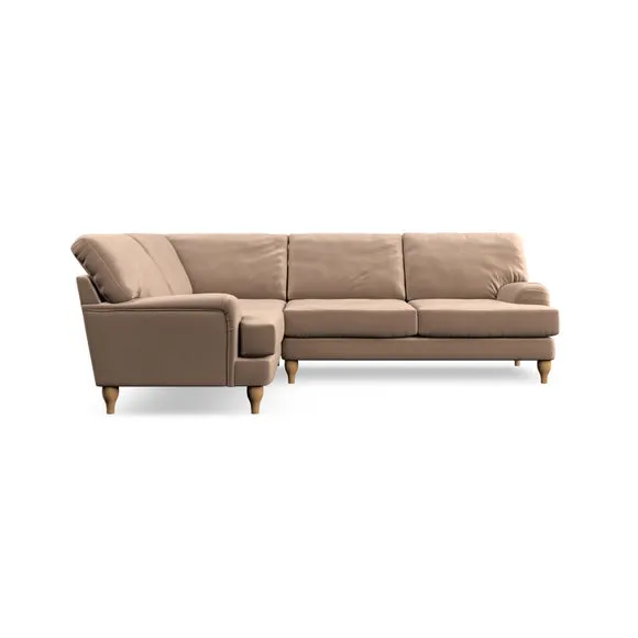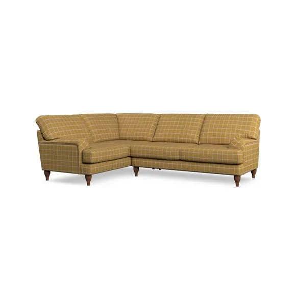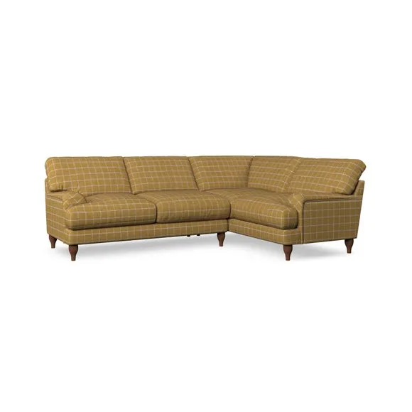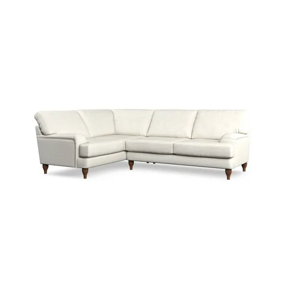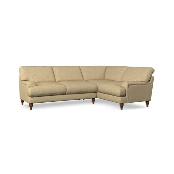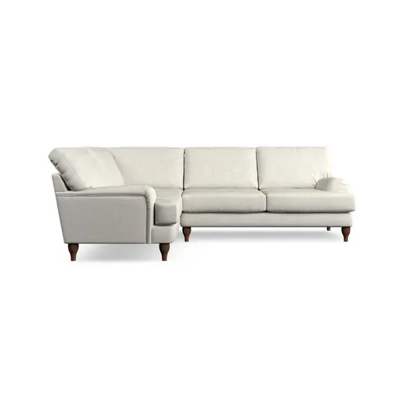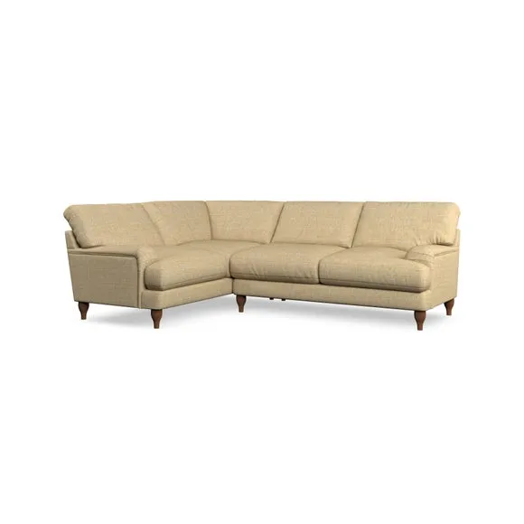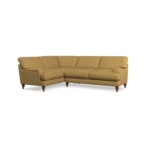 * Classic style* Bandaged Arms* Pleated details* Serpentine seat springs* Choose your orientation, support, fabric and leg colour This sofa features bandaged arms with pleat details and a lugged seat, offering a unique and stylish look. Built for longevity and comfort, it includes serpentine seat springs and deep fibre-filled back cushions for excellent support. You can customise your comfort by choosing between a low-maintenance foam seat or the inviting ‘Qualofill Blue’ fibre seat, made from 100% recycled polyester. The ‘T’ cushion seat and arm design ensure a compact and contemporary feel, complemented by self-sewn seat and back cushions. Choose from a right hand or left hand facing corner to fit your space perfectly. Additionally, you can select your preferred fabric and leg colour to perfectly match your living space.