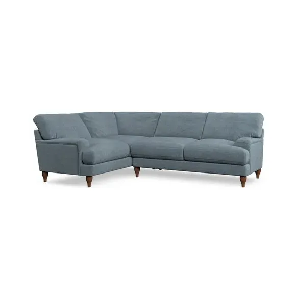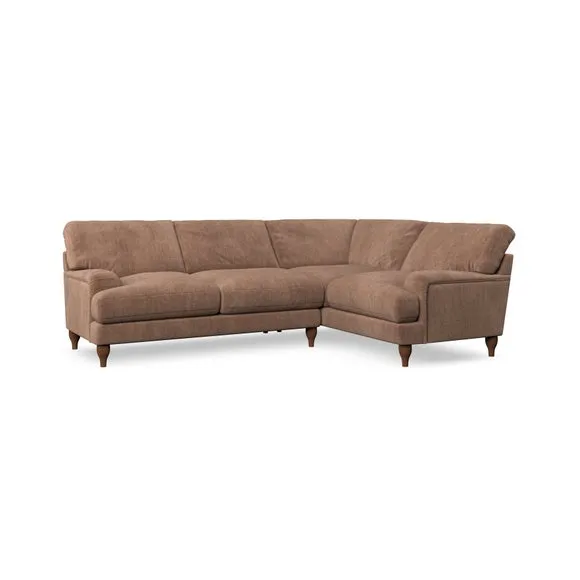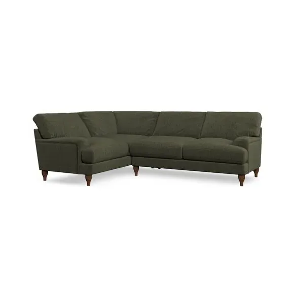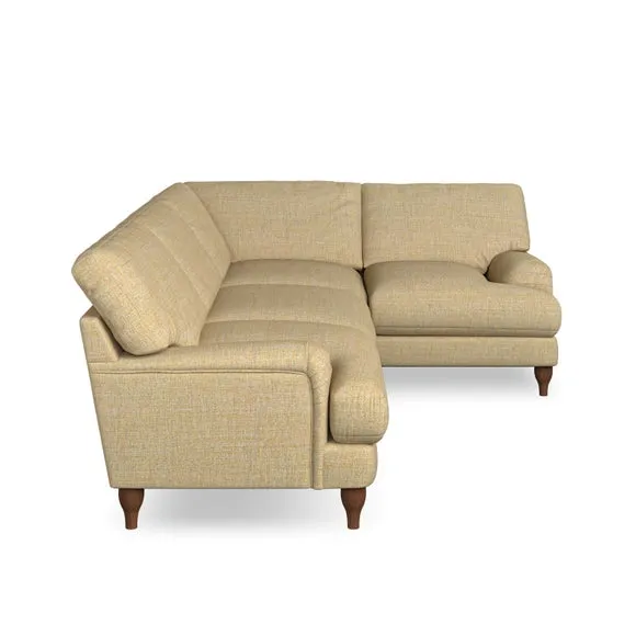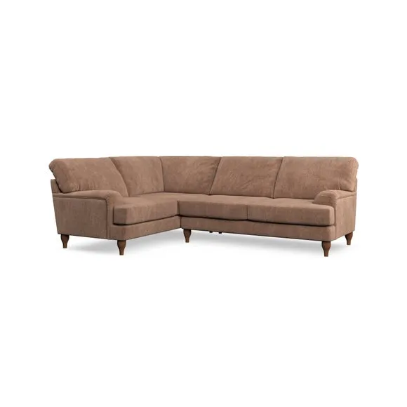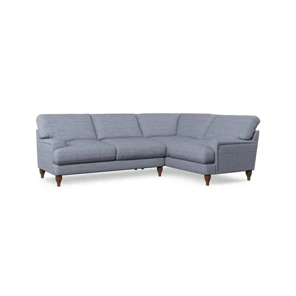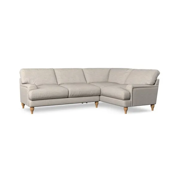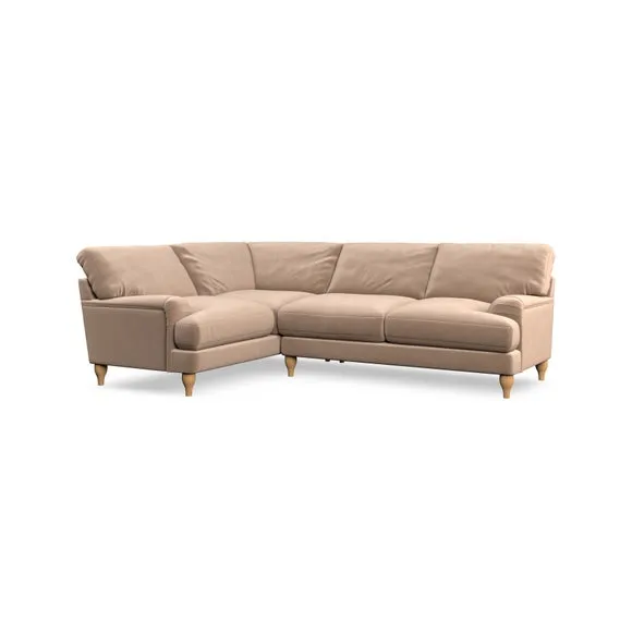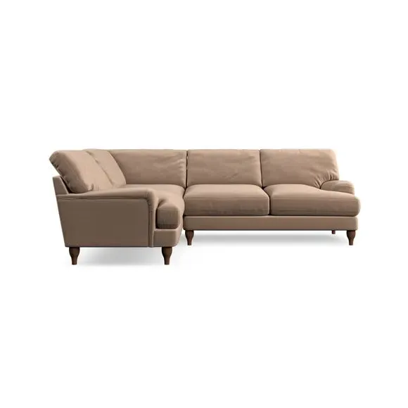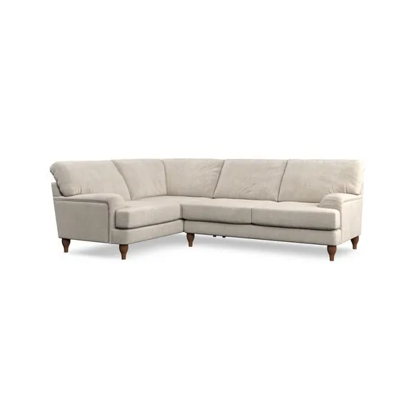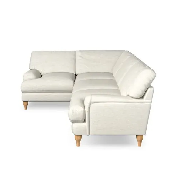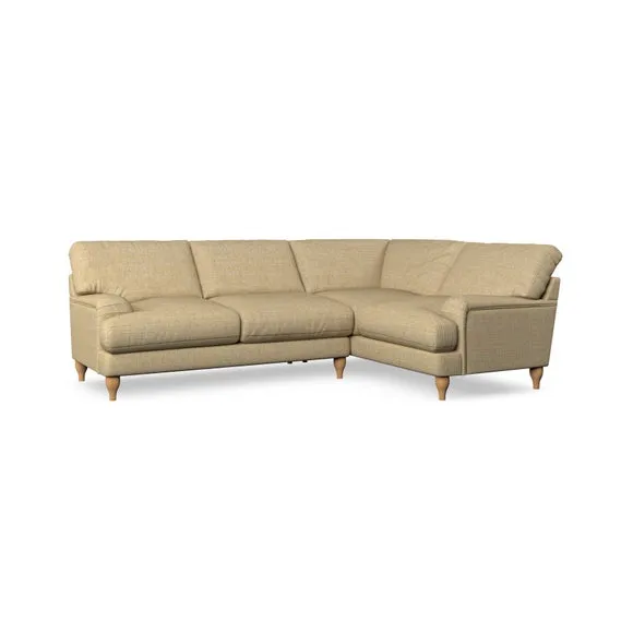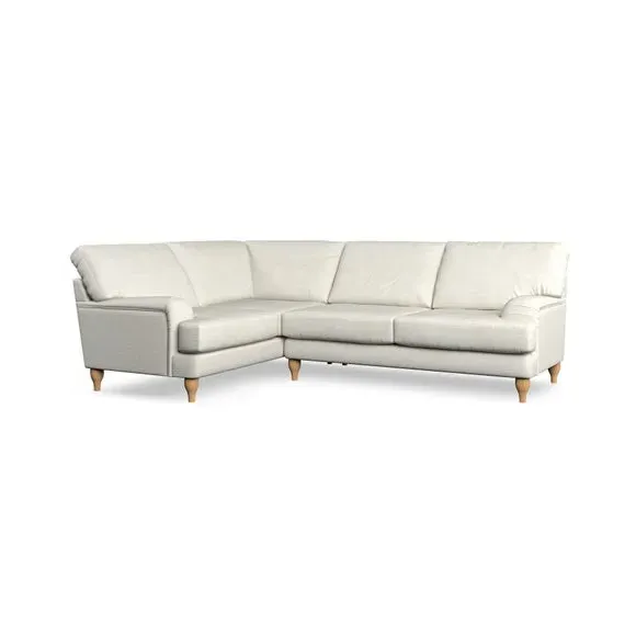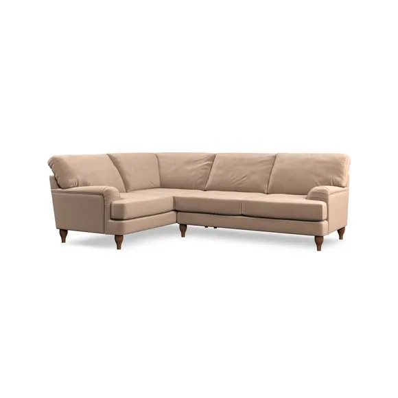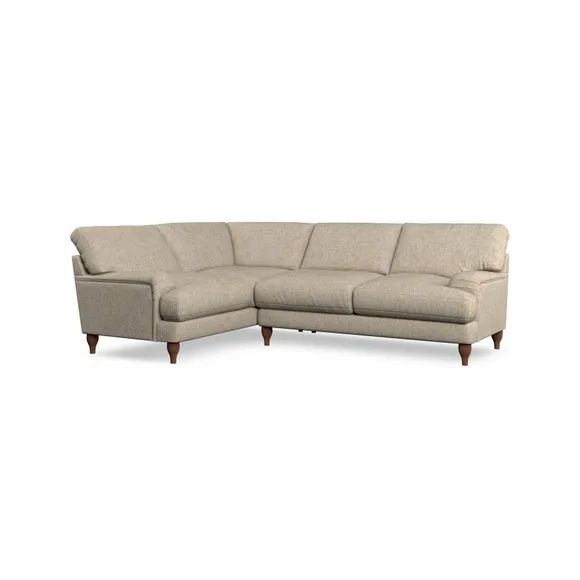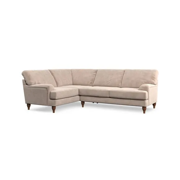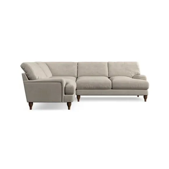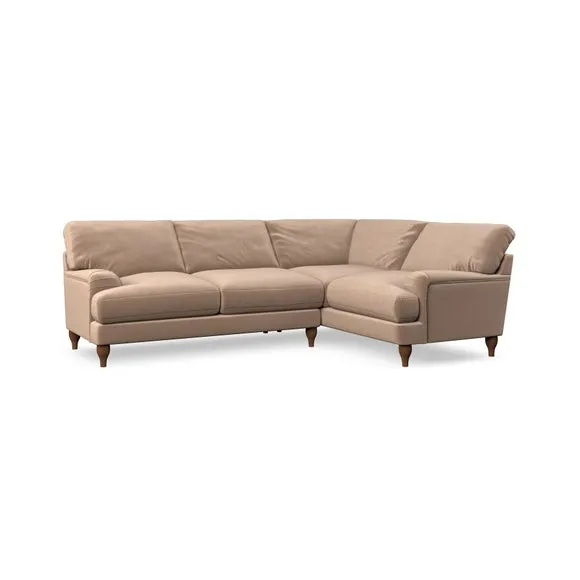 * Classic style* Bandaged Arms* Pleated details* Serpentine seat springs* Choose your orientation, support, fabric and leg colour This sofa features bandaged arms with pleat details and a lugged seat, offering a unique and stylish look. Built for longevity and comfort, it includes serpentine seat springs and deep fibre-filled back cushions for excellent support. You can customise your comfort by choosing between a low-maintenance foam seat or the inviting ‘Qualofill Blue’ fibre seat, made from 100% recycled polyester. The ‘T’ cushion seat and arm design ensure a compact and contemporary feel, complemented by self-sewn seat and back cushions. Choose from a right hand or left hand facing corner to fit your space perfectly. Additionally, you can select your preferred fabric and leg colour to perfectly match your living space.