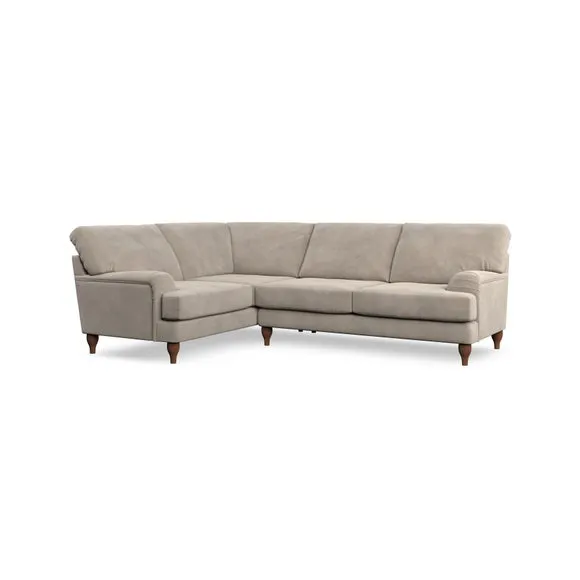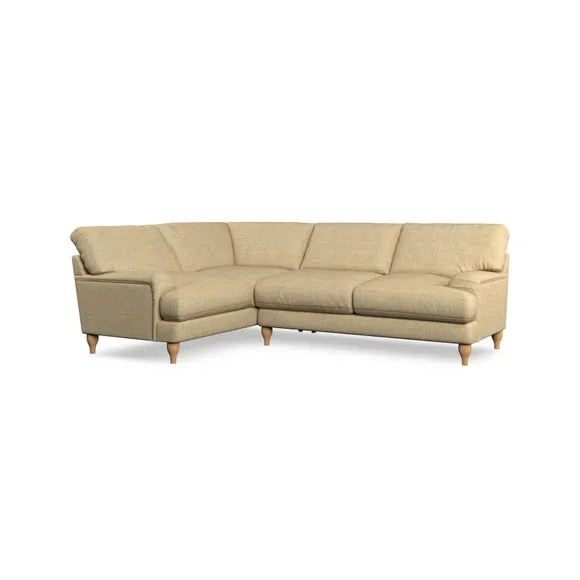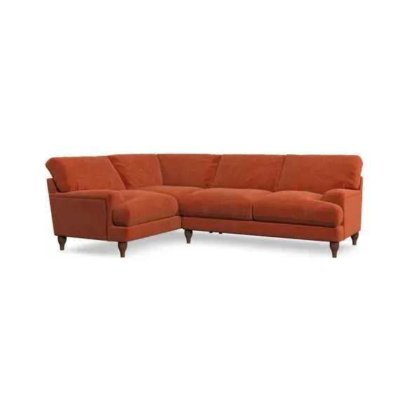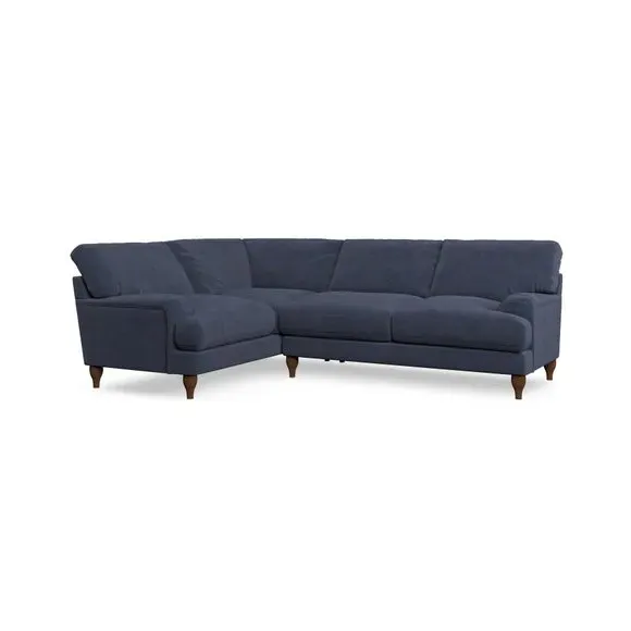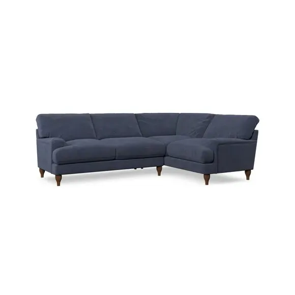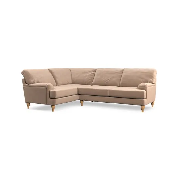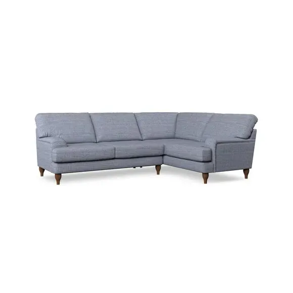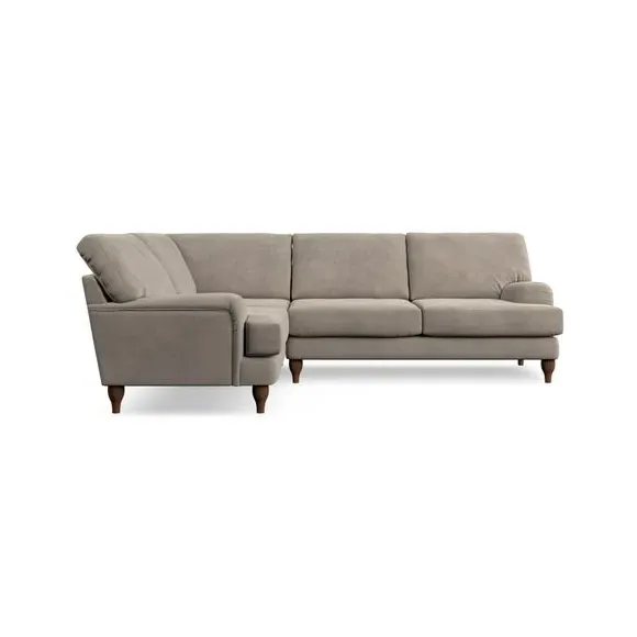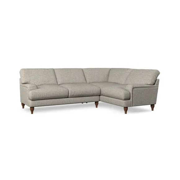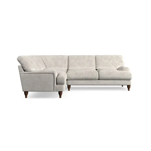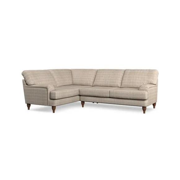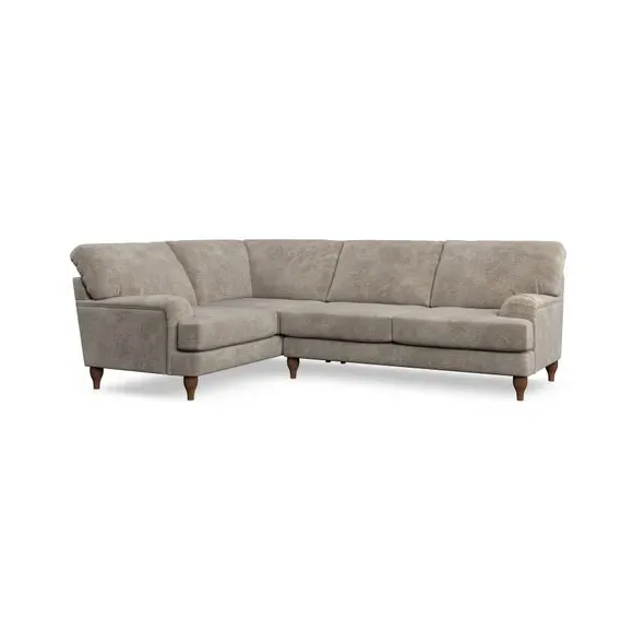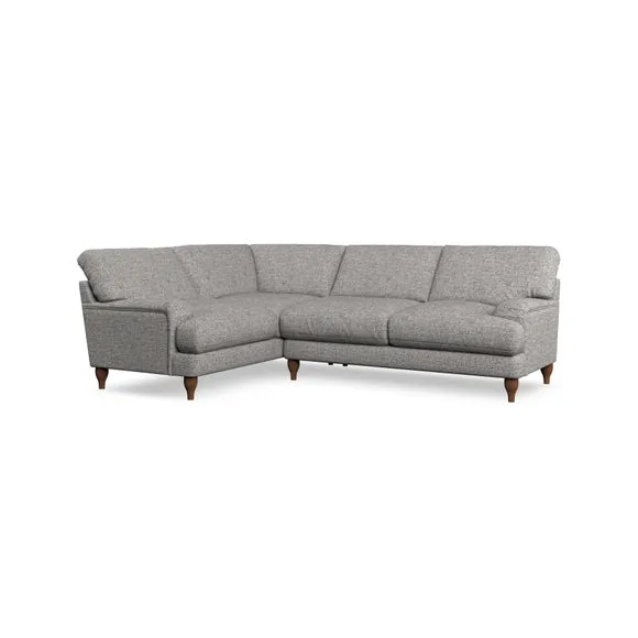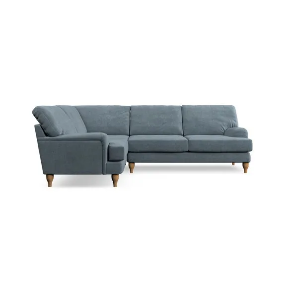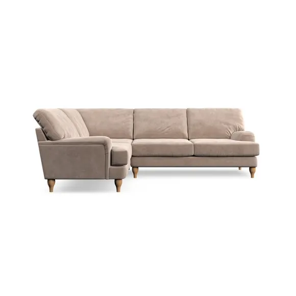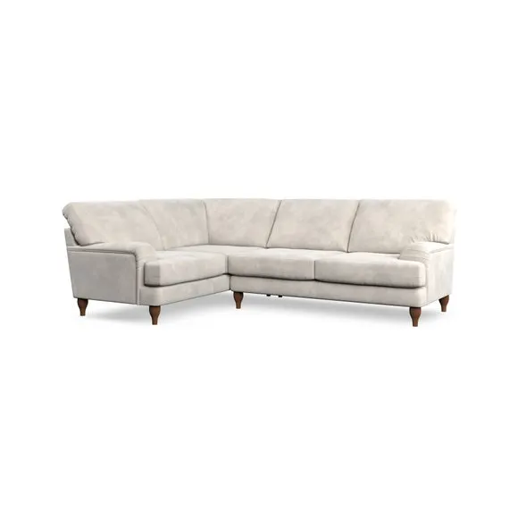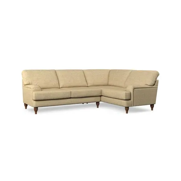 * Classic style* Bandaged Arms* Pleated details* Serpentine seat springs* Choose your orientation, support, fabric and leg colour This sofa features bandaged arms with pleat details and a lugged seat, offering a unique and stylish look. Built for longevity and comfort, it includes serpentine seat springs and deep fibre-filled back cushions for excellent support. You can customise your comfort by choosing between a low-maintenance foam seat or the inviting ‘Qualofill Blue’ fibre seat, made from 100% recycled polyester. The ‘T’ cushion seat and arm design ensure a compact and contemporary feel, complemented by self-sewn seat and back cushions. Choose from a right hand or left hand facing corner to fit your space perfectly. Additionally, you can select your preferred fabric and leg colour to perfectly match your living space.